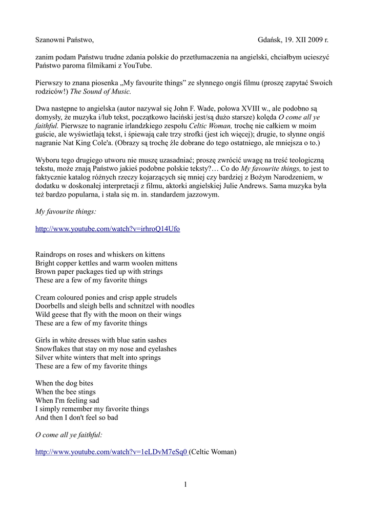 Szanowni Państwo, Gdańsk, 19. XII 2009 r. zanim podam Państwu trudne zdania polskie do przetłumaczenia na angielski, chciałbym ucieszyć Państwo paroma filmikami z YouTube. Pierwszy to znana piosenka „My favourite things” ze słynnego ongiś filmu (proszę zapytać Swoich rodziców!) The Sound of Music. Dwa następne to angielska (autor nazywał się John F. Wade, połowa XVIII w., ale podobno są domysły, Ŝe muzyka i/lub tekst, początkowo łaciński jest/są duŜo starsze) kolęda O come all ye faithful. Pierwsze to nagranie irlandzkiego zespołu Celtic Woman, trochę nie całkiem w moim guście, ale wyświetlają tekst, i śpiewają całe trzy strofki (jest ich więcej); drugie, to słynne ongiś nagranie Nat King Cole'a. (Obrazy są trochę źle dobrane do tego ostatniego, ale mniejsza o to.) Wyboru tego drugiego utworu nie muszę uzasadniać; proszę zwrócić uwagę na treść teologiczną tekstu, moŜe znają Państwo jakieś podobne polskie teksty?… Co do My favourite things, to jest to faktycznie katalog róŜnych rzeczy kojarzących się mniej czy bardziej z BoŜym Narodzeniem, w dodatku w doskonałej interpretacji z filmu, aktorki angielskiej Julie Andrews. Sama muzyka była teŜ bardzo popularna, i stała się m. in. standardem jazzowym. My favourite things: http://www.youtube.com/watch?v=irhroQ14Ufo Raindrops on roses and whiskers on kittens Bright copper kettles and warm woolen mittens Brown paper packages tied up with strings These are a few of my favorite things Cream coloured ponies and crisp apple strudels Doorbells and sleigh bells and schnitzel with noodles Wild geese that fly with the moon on their wings These are a few of my favorite things Girls in white dresses with blue satin sashes Snowflakes that stay on my nose and eyelashes Silver white winters that melt into springs These are a few of my favorite things When the dog bites When the bee stings When I'm feeling sad I simply remember my favorite things And then I don't feel so bad O come all ye faithful: http://www.youtube.com/watch?v=1eLDvM7eSq0 (Celtic Woman) 1 http://www.youtube.com/watch?v=4SZJydcuyhw (Nat King Cole) “The shepherds said to one another, ‘Let us go to Bethlehem and see this thing that has happened, which the Lord has told us about.’ So they hurried off and found Mary and Joseph, and the Baby, who was lying in the manger.” Luke 2:15-16 O come, all ye faithful, joyful and triumphant, O come ye, O come ye, to Bethlehem. Come and behold Him, born the King of angels; Refrain: O come, let us adore Him, O come, let us adore Him, O come, let us adore Him, Christ the Lord. God of God, Light of Light, Lo, He abhors not the Virgin’s womb; Very God, begotten, not created; Refrain Sing, choirs of angels, sing in exultation; O sing, all ye citizens of heaven above! Glory to God in the highest; Refrain See how the shepherds, summoned to His cradle, Leaving their flocks, draw nigh to gaze; We too will thither bend our joyful footsteps; Refrain Lo! star led chieftains, Magi, Christ adoring, Offer Him incense, gold, and myrrh; We to the Christ Child bring our hearts’ oblations. Refrain Child, for us sinners poor and in the manger, We would embrace Thee, with love and awe; Who would not love Thee, loving us so dearly? Refrain Yea, Lord, we greet Thee, born this happy morning; Jesu, to Thee be glory given; Word of the Father, now in flesh appearing. 2 Refrain Aha, jeszcze amerykańska kolęda (tak, są takie, nie tylko „Santa Claus is coming to town”…) I wonder as I wander. Zanotowana w 1933 r. w Appalachach… . I wonder as I wander out under the sky How Jesus the Saviour did come for to die For poor orn'ry creature like you and like I I wonder as I wander out under the sky When Mary birthed Jesus, 'twas in a cow's stall With wisemen and farmers and shepherds and all And high in the heaven a star light did fall And the promise of the ages, it then did recall If Jesus had wanted for any wee thing Like a star in the sky, or a bird on the wing Or all of God's angels in heav'n to sing Well, he surely could have it, for he was the King I wonder as I wander out under the sky How Jesus the Saviour did come for to die For poor orn'ry creature like you and like I I wonder as I wander, out under the sky. Tekst napisałem tak jak słyszałem, ale moŜliwe, Ŝe tu i ówdzie się przesłyszałem, proszę mnie poprawić, jeśli Państwo słyszą lepiej. Wykonanie (amatorskie)? moŜe jest trochę zbyt „uroczyste”, ale z róŜnych powodów wybrałem je. http://www.youtube.com/watch?v=i-rqSiGvHQU&feature=related Oprócz tego, kolęda jest częścią mieszanki pieśni ludowych w aranŜacji Luciana Berio, wykonywanych przez Cathy Berberian (gdzieś od 2:40): http://www.youtube.com/watch?v=GY8bVL3YfVk Wesołych Świąt BoŜego Narodzenia i wszystkiego dobrego w nowym roku 2010. (Wojciech śełaniec) 3
