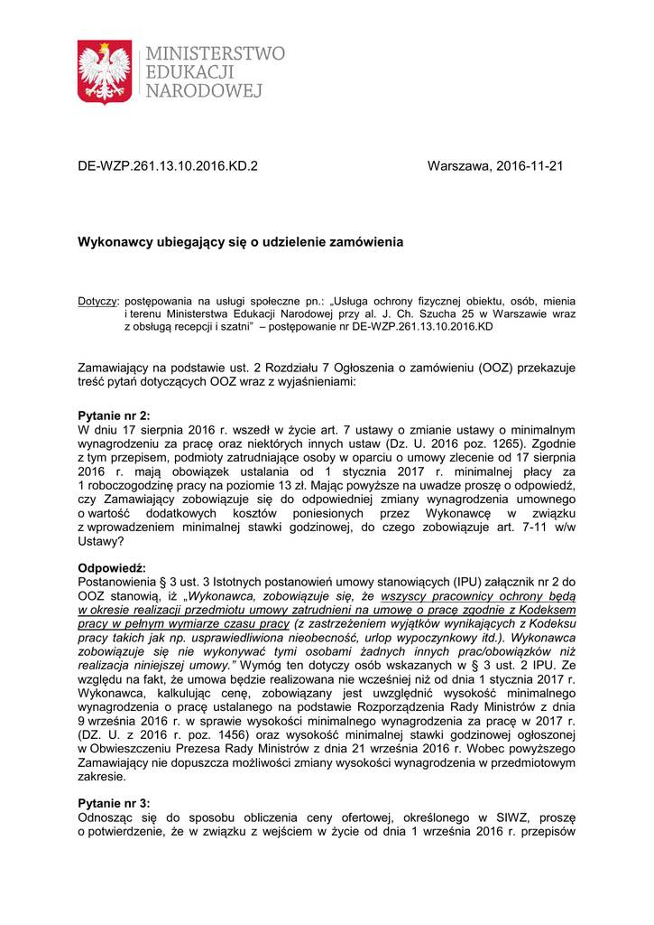 DE-WZP.261.13.10.2016.KD.2 Warszawa, 2016-11-21 Wykonawcy ubiegający się o udzielenie zamówienia Dotyczy: postępowania na usługi społeczne pn.: „Usługa ochrony fizycznej obiektu, osób, mienia i terenu Ministerstwa Edukacji Narodowej przy al. J. Ch. Szucha 25 w Warszawie wraz z obsługą recepcji i szatni” – postępowanie nr DE-WZP.261.13.10.2016.KD Zamawiający na podstawie ust. 2 Rozdziału 7 Ogłoszenia o zamówieniu (OOZ) przekazuje treść pytań dotyczących OOZ wraz z wyjaśnieniami: Pytanie nr 2: W dniu 17 sierpnia 2016 r. wszedł w życie art. 7 ustawy o zmianie ustawy o minimalnym wynagrodzeniu za pracę oraz niektórych innych ustaw (Dz. U. 2016 poz. 1265). Zgodnie z tym przepisem, podmioty zatrudniające osoby w oparciu o umowy zlecenie od 17 sierpnia 2016 r. mają obowiązek ustalania od 1 stycznia 2017 r. minimalnej płacy za 1 roboczogodzinę pracy na poziomie 13 zł. Mając powyższe na uwadze proszę o odpowiedź, czy Zamawiający zobowiązuje się do odpowiedniej zmiany wynagrodzenia umownego o wartość dodatkowych kosztów poniesionych przez Wykonawcę w związku z wprowadzeniem minimalnej stawki godzinowej, do czego zobowiązuje art. 7-11 w/w Ustawy? Odpowiedź: Postanowienia § 3 ust. 3 Istotnych postanowień umowy stanowiących (IPU) załącznik nr 2 do OOZ stanowią, iż „Wykonawca, zobowiązuje się, że wszyscy pracownicy ochrony będą w okresie realizacji przedmiotu umowy zatrudnieni na umowę o pracę zgodnie z Kodeksem pracy w pełnym wymiarze czasu pracy (z zastrzeżeniem wyjątków wynikających z Kodeksu pracy takich jak np. usprawiedliwiona nieobecność, urlop wypoczynkowy itd.). Wykonawca zobowiązuje się nie wykonywać tymi osobami żadnych innych prac/obowiązków niż realizacja niniejszej umowy.” Wymóg ten dotyczy osób wskazanych w § 3 ust. 2 IPU. Ze względu na fakt, że umowa będzie realizowana nie wcześniej niż od dnia 1 stycznia 2017 r. Wykonawca, kalkulując cenę, zobowiązany jest uwzględnić wysokość minimalnego wynagrodzenia o pracę ustalanego na podstawie Rozporządzenia Rady Ministrów z dnia 9 września 2016 r. w sprawie wysokości minimalnego wynagrodzenia za pracę w 2017 r. (DZ. U. z 2016 r. poz. 1456) oraz wysokość minimalnej stawki godzinowej ogłoszonej w Obwieszczeniu Prezesa Rady Ministrów z dnia 21 września 2016 r. Wobec powyższego Zamawiający nie dopuszcza możliwości zmiany wysokości wynagrodzenia w przedmiotowym zakresie. Pytanie nr 3: Odnosząc się do sposobu obliczenia ceny ofertowej, określonego w SIWZ, proszę o potwierdzenie, że w związku z wejściem w życie od dnia 1 września 2016 r. przepisów nakładających na Wykonawcę obowiązek kalkulowania ceny z uwzględnianiem w kosztach pracy na 2017 r. co najmniej „minimalnej stawki godzinowej" w wysokości 13 zł, Zamawiający będzie badał ceny złożonych w postępowaniu ofert, zgodnie z obowiązującymi przepisami, a więc przez pryzmat znowelizowanego przepisu art. 90 ust. 1 ustawy - Prawo zamówień publicznych (dalej pzp), tj. weryfikując, czy Wykonawca uwzględnił w kosztach pracy na rok 2017 dla umów zlecenia ustaloną minimalną stawkę godzinową w wysokości 13 zł. Zaznaczamy przy tym, że choć tzw. minimalna stawka godzinowa ma obowiązywać od dnia 1 stycznia 2017 r; to jednak przepis ją wprowadzający wszedł w życie 17 sierpnia 2016 r. (na mocy art. 7 ustawy o zmianie ustawy o minimalnym wynagrodzeniu za pracę oraz niektórych innych ustaw - Dz. U. poz. 1265, dalej u.m.w.p.), zaś znowelizowany art. 90 ust. 1 pzp wszedł w życie 1 września 2016 r. (w myśl art. 4 u.m.w.p.), a zatem koszty osobowe, związane z wykonaniem zamówienia, są w dniu składania ofert nie tylko możliwe do przewidzenia, ale wręcz konieczne do oszacowania, tak, aby Wykonawca prawidłowo wypełnił dyspozycję art. 90 ust. 1 pzp. Odpowiedź: Opis sposobu obliczenia ceny zawiera Rozdział 12 OOZ. Zgodnie z ust. 4 Rozdziału 14 Zamawiający w przypadku, gdy cena całkowita oferty jest niższa o co najmniej 30% od średniej arytmetycznej cen wszystkich złożonych ofert, zwróci się o udzielenie wyjaśnień do Wykonawców, których oferty zostały pozytywnie ocenione w procedurze opisanej w ust. 2 i 3, w celu wykluczenia, czy zaoferowana cena lub jej istotne części składowe są rażąco niskie w stosunku do przedmiotu zamówienia. Jeżeli Wykonawca nie udowodni, że zaoferowana cena lub jej istotne części składowe nie są rażąco niskie w stosunku do przedmiotu zamówienia, oferta nie będzie podlegała dalszej ocenie. Przy badaniu, czy zaoferowana cena lub jej istotne części składowe są rażąco niskie w stosunku do przedmiotu zamówienia, Zamawiający będzie brał pod uwagę, czy Wykonawca uwzględnił wysokość minimalnego wynagrodzenia o pracę ustalanego na podstawie Rozporządzenia Rady Ministrów z dnia 9 września 2016 r. w sprawie wysokości minimalnego wynagrodzenia za pracę w 2017 r. (DZ. U. z 2016 r. poz. 1456) oraz wysokość minimalnej stawki godzinowej ogłoszonej w Obwieszczeniu Prezesa Rady Ministrów z dnia 21 września 2016 r. Zmiana OOZ: Zamawiający działając na podstawie ust. 5 Rozdziału 7 OOZ dokonuje zmiany OOZ. Zapis w Rozdziale 14 ust. 4 OOZ otrzymuje brzmienie: Zamawiający w przypadku, gdy cena całkowita oferty wydaje się rażąco niska w stosunku do przedmiotu zamówienia i budzi wątpliwości Zamawiającego co do możliwości wykonania przedmiotu zamówienia zgodnie z wymaganiami określonymi przez Zamawiającego lub wynikającymi z odrębnych przepisów, w szczególności, gdy jest niższa o co najmniej 30% od średniej arytmetycznej cen wszystkich złożonych ofert, zwróci się o udzielenie wyjaśnień do Wykonawców, których oferty zostały pozytywnie ocenione w procedurze opisanej w ust. 2 i 3, w celu wykluczenia, czy zaoferowana cena lub jej istotne części składowe są rażąco niskie w stosunku do przedmiotu zamówienia. Jeżeli Wykonawca nie udowodni, że zaoferowana cena