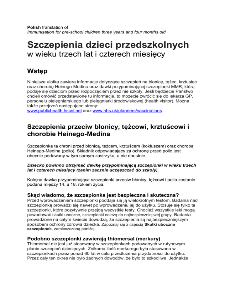 Polish translation of Immunisation for pre-school children three years and four months old Szczepienia dzieci przedszkolnych w wieku trzech lat i czterech miesięcy Wstęp Niniejsza ulotka zawiera informacje dotyczące szczepień na błonicę, tężec, krztusiec oraz chorobę Heinego-Medina oraz dawki przypominającej szczepionki MMR, którą podaje się dzieciom przed rozpoczęciem przez nie szkoły. Jeśli będziecie Państwo chcieli omówić przedstawione tu informacje, to możecie zwrócić się do lekarza GP, personelu pielęgniarskiego lub pielęgniarki środowiskowej (health visitor). Można także przejrzeć następujące strony: www.publichealth.hscni.net oraz www.nhs.uk/planners/vaccinations Szczepienia przeciw błonicy, tężcowi, krztuścowi i chorobie Heinego-Medina Szczepionka ta chroni przed błonicą, tężcem, krztuścem (kokluszem) oraz chorobą Heinego-Medina (polio). Składnik odpowiadający za ochronę przed polio jest obecnie podawany w tym samym zastrzyku, a nie doustnie. Dziecko powinno otrzymać dawkę przypominającą szczepionki w wieku trzech lat i czterech miesięcy (zanim zacznie uczęszczać do szkoły). Kolejna dawka przypominająca szczepionki przeciw błonicy, tężcowi i polio zostanie podana między 14. a 18. rokiem życia. Skąd wiadomo, że szczepionka jest bezpieczna i skuteczna? Przed wprowadzeniem szczepionki poddaje się ją wielokrotnym testom. Badania nad szczepionką prowadzi się nawet po wprowadzeniu jej do użytku. Stosuje się tylko te szczepionki, które pozytywnie przejdą wszystkie testy. Chociaż wszystkie leki mogą powodować skutki uboczne, szczepionki należą do najbezpieczniejszej grupy. Badania prowadzone na całym świecie dowodzą, że szczepienia są najbezpieczniejszym sposobem ochrony zdrowia dziecka. Zapoznaj się z częścią Skutki uboczne szczepionek, zamieszczoną poniżej. Podobno szczepionki zawierają thiomersal (merkury) Thiomersal nie jest już stosowany w szczepionkach podawanych w rutynowym planie szczepień dziecięcych. Znikoma ilość merkurego była stosowana w szczepionkach przez ponad 60 lat w celu przedłużenia przydatności do użytku. Przez cały ten okres nie było żadnych dowodów, że było to szkodliwe. Jednakże obecnie wycofuje się stosowanie tego pierwiastka, w ramach globalnego planu ograniczania kontaktu z merkurym ze źródeł, które da się wyeliminować. Jakim chorobom zapobiega ta szczepionka? Błonica Błonica to poważna choroba, która może szybko wywołać trudności z oddychaniem, oraz może spowodować uszkodzenie serca i układu nerwowego, a nawet śmierć. Zanim wprowadzono szczepienia na błonice, w Irlandii Północnej notowano do 1500 przypadków zachorowań rocznie. Tężec Tężec jest bolesną chorobą atakującą mięśnie oraz wywołującą problemy z oddychaniem. Chorobę wywołują zarazki, które przenikają z ziemi lub nawozu do ciała przez rany otwarte i oparzenia. Tężec atakuje system nerwowy i może doprowadzić do śmierci. Nie można się nim zarazić od innej osoby. 5 Krztusiec (koklusz) Krztusiec to choroba, w której zdarzają się długie ataki kaszlu i dławienia się, co bardzo utrudnia oddychanie. Choroba trwa do 10 tygodni i jest szczególnie niebezpieczna dla niemowląt. U dzieci poniżej pierwszego roku życia, może nawet wywołać zgon. Przed wprowadzeniem szczepień na krztusiec, w Irlandii Północnej notowano do 3500 przypadków zachorowań rocznie. Choroba Heinego-Medina (Polio) Chorobę Heinego-Medina wywołuje wirus, który atakuje układ nerwowy, co może doprowadzić do trwałego paraliżu mięśni. Jeśli choroba zaatakuje mięśnie klatki piersiowej lub mózg, może spowodować śmierć. Zanim wprowadzono szczepienia na chorobę Heinego-Medina, w Irlandii Północnej notowano do 1500 przypadków postaci porażennej tej choroby rocznie. Skutki uboczne szczepionki U większości dzieci nie występują skutki uboczne, jednak organizm każdego dziecka jest inny. U dziecka mogą wystąpić następujące skutki uboczne, które zazwyczaj są łagodne: • • • Rozdrażnienie utrzymujące się do 48 godzin po podaniu zastrzyku; Lekka gorączka (patrz strona 14); Niewielki guzek w miejscu podania zastrzyku. Może utrzymywać się do kilku tygodni, a później powoli zanika. Jeśli rodzic uważa, że u dziecka wystąpiła jakakolwiek inna, niepokojąca reakcja na szczepionkę przeciw błonicy, tężcowi, krztuścowi i polio, należy porozmawiać o tym z lekarzem pierwszego kontaktu, pielęgniarką w przychodni lub pielęgniarką środowiskową. Rodzice i opiekunowie mogą także zgłaszać podejrzewane przypadki skutków ubocznych szczepień i leków przez the Yellow Card Scheme, korzystając ze strony www.yellowcard.gov.uk lub telefonując na infolinię the Yellow Card lub pod bezpłatny numer 0808 100 3352 (linia czynna od poniedziałku do piątku 09:00 do 17:00).6 Bardzo rzadko po podaniu szczepionki dochodzi do reakcji alergicznej, np. wysypki lub swędzenia części lub całego ciała. Jeszcze rzadziej w kilka minut po podaniu szczepionki może dojść do poważnej reakcji, w której występują trudności z oddychaniem a nawet omdlenia. Taki stan nazywa się anafilaksją. Według najnowszych badań, do takiej reakcji dochodzi w jednym przypadku na pół miliona podanych szczepionek. Chociaż reakcje alergiczne mogą być niepokojące, zastosowanie leczenia prowadzi do szybkiego i pełnego wyzdrowienia. Bardzo rzadko w dzień lub dwa po podaniu szczepionki może dojść u dziecka do napadu drgawek. To zwykle wiąże się z bardzo wysoką temperaturą (zapoznaj się z częścią Co oznacza wysoka temperatura po zaszczepieniu dziecka? poniżej). Jeśli dojdzie do ataku, należy niezwłocznie zatelefonować do lekarza GP. Zazwyczaj ataki przechodzą dzieciom całkowicie w krótkim okresie. Małe dzieci mogą dostać drgawki w różnych momentach, a wystąpienie ataku po podaniu szczepionki niekoniecznie jest z nią związane. Lekarz powinien