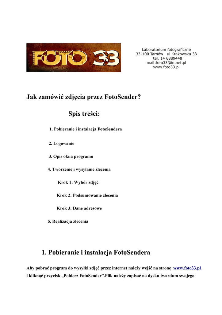 Jak zamówić zdjęcia przez FotoSender? Spis treści: 1. Pobieranie i instalacja FotoSendera 2. Logowanie 3. Opis okna programu 4. Tworzenie i wysyłanie zlecenia Krok 1: Wybór zdjęć Krok 2: Podsumowanie zlecenia Krok 3: Dane adresowe 5. Realizacja zlecenia 1. Pobieranie i instalacja FotoSendera Aby pobrać program do wysyłki zdjęć przez internet należy wejść na stronę www.foto33.pl i kliknąć przycisk „Pobierz FotoSender”.Plik należy zapisać na dysku twardum swojego komputera.Rozpocznie się pobieranie pliku FotoSender.exe, które może potrwać od kilku sekund do kilku minut. Po pobraniu pliku należy go uruchomić przez dwukrotne kliknięcie FotoSender jest prostym w obsłudze i co ważne darmowym programem umożliwiającym Państwu przesyłanie zdjęć do naszego zakładu fotograficznego. Wyposażony jest w przeglądarkę plików graficznych z możliwością podstawowej edycji Państwa zdjęć, kadrowania i redukcji czerwonych oczu oraz modułu do wysyłania tychże zdjęć. Dostępne funkcje graficzne - szybka przeglądarka plików graficznych, - edycja koloru, jasności, kontrastu zdjęcia, - kadrowanie do wybranego formatu, - usuwanie efektu czerwonych oczu. Dostępne funkcje dotyczące składania zleceń - wybór kilku formatów i różnych ilości odbitek dla każdego zdjęcia, - kadrowanie z dopasowaniem do wybranego formatu, - wybór sposobu kadrowania, - dodatkowe efekty (zdjęcie czarno-białe, sepia), - automatyczna aktualizacja programu przez internet, - automatyczne wysyłanie zakodowanych zdjęć do naszego studia, - kilka sposobów płatności, - zapewnione bezpieczeństwo Państwa danych, - kompresja zdjęć użytkownika do zadanej rozdzielczości. Aby wysłać zlecenie do laboratorium fotograficznego musisz mieć założone konto. Jest to niezbędne do weryfikacji twojej osoby i daje pewność, że osoby nieupoważnione nie będą wysyłać zdjęć w twoim imieniu. 1. Okno logowania Jeśli nie posiadasz konta, a chcesz wysłać zlecenie, uruchom program z opcją Nowy użytkownik i rozpocznij pracę z programem. Przed wysłaniem zdjęć do naszego laboratorium program poprosi cię o wprowadzenie danych adresowych, podanie loginu i hasła w celu utworzenia nowego użytkownika. Na wprowadzony adres e-mail otrzymasz wiadomość o przyjęciu zgłoszenia. Aby zakończyć proces rejestracji naciśnij link potwierdzający poprawność wprowadzonego adresu e-mail. Przy następnym uruchomieniu wprowadź swój login i hasło. Jeśli zapomnisz dane swojego konta naciśnij link „Zapomniałem hasła” i podaj adres e-mail, którego użyłeś przy rejestracji. W odpowiedzi otrzymasz e-mail zwrotny z danymi konta. Pole kod promocji służy do wprowadzenia specjalnych haseł umożliwiających dostęp do promocyjnych cenników. Wszystkie dane osobowe wykorzystywane są jedynie do realizacji transakcji i przesłania informacji dotyczących działania systemu. 3. Opis okna programu Okno aplikacji Ekran aplikacji składa się z trzech części: drzewo katalogów, podgląd miniaturek, podgląd zdjęcia/zlecenia z narzędziami edycyjnymi oraz umożliwiającymi dodawanie zdjęć do zlecenia. dostępne funkcje: - ukrycie/przywołanie drzewa katalogów - zaznaczenie wszystkich zdjęć w katalogu - odznaczenie zaznaczonych zdjęć - domyślny format, dodanie zaznaczonych zdjęć do zlecenia w wybranym formacie (po jednej odbitce) - podgląd zlecenia - powiększenie zdjęcia (ekran edycji) - obrót o 90o w lewo - obrót o 90o w prawo - powiększenie obrazu - pomniejszenie obrazu - oryginalny rozmiar zdjęcia - dopasowanie do rozmiarów okna podglądu - kadrowanie (dostępne tylko dla zdjęć dodanych do zlecenia) - edycja zdjęcia (nasycenie barw, jasność, kontrast) - cofnięcie zmian - usuwanie efektu czerwonych oczu - przyciski formatów dodające zaznaczone zdjęcie do zlecenia - okna do wprowadzania ilości odbitek dla danego formatu - podsumowanie zlecenia (rozmiar przesyłanych plików, ilość odbitek, kwota do zapłaty) Tworzenie zlecenia i wysyłanie zdjęć do laboratorium Krok 1: Dodawanie zdjęć do zlecenia - odszukaj katalog ze zdjęciami - zaznacz wybrane zdjęcie - naciśnij przycisk z formatem w jakim chcesz wywołać zdjęcie ustaw ilość odbitek dla danego formatu kolor oznacza jakość wykonanej odbitki w zależności od wybranego formatu i rozmiarów pliku: słaba, średnia, dobra. UWAGI: Aby szybko dodać zdjęcie do zlecenia wybierz domyślny format (widoczny nad oknem miniaturek zdjęć) i dwukrotnie kliknij na wybranym zdjęciu lewym przyciskiem myszy lub kliknij prawym przyciskiem myszy. Aby dodać do zlecenia większą liczbę zdjęć w tym samym formacie zaznacz wybrane zdjęcia trzymając lewy przycisk myszy i przeciągając w oknie miniaturek zaznaczając tym obszar działania. Po wciśnięciu przycisku formatu wszystkie zaznaczone zdjęcia dodadzą się do zlecenia. Modyfikacja ilości odbitek również działa na cały zaznaczony obszar. Aby zaznaczyć więcej niż jedno zdjęcie wciśnij lewy klawisz ctrl i zaznaczaj pojedyncze zdjęcia. Korzystając z dostępnych narzędzi możesz poprawić kolorystykę zdjęć, usunąć efekt czerwonych oczu lub wykadrować zdjęcie. Wszystkie operacje są robione na kopii pliku z zachowaniem oryginalnego zdjęcia. Przez cały czas składania zamówienia program informuje cię o ilości odbitek jakie zamówiłeś, rozmiaru wysyłanych plików i wartości zlecenia. W każdej chwili możesz podglądnąć zawartość zlecenia wciskając odpowiedni przycisk. Krok 2: Podsumowanie zlecenia Po zakończeniu wyboru zdjęć wciśnij przycisk „Wyślij zamówienie”. Na ekranie pojawi się podsumowanie zlecenia. Dla każdego zdjęcia możesz wybrać rodzaj papieru na jakim mają być wykonane odbitki, sposób kadrowania zdjęcia oraz ewentualne efekty typu zdjęcie czarno białe lub sepia. W tym miejscu możesz dokonać modyfikacji ilości odbitek. Jeśli chcesz zastosować zmiany dla wszystkich zdjęć w zleceni