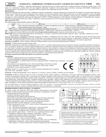 RADIOLINIA / ODBIORNIK CZTEROKANAŁOWY Z KODEM DYNAMICZNYM CH4H (PL) Radiolinia / odbiornik czterokanałowy(*) przeznaczone są do systemów alarmowych i zdalnego sterowania. Oferowane są jako zestawy, składające się z odbiornika i jednego pilota, lub jako oddzielne odbiorniki. Urządzenia wykorzystują system kodowania zmiennego KEELOQ(R). Współpracują ze wszystkimi pilotami i detektorami oraz z nadajnikiem RP501 produkcji Elmes Elektronik na pasmo 434 MHz. Opis działania Pobudzenie nadajnika lub pilota powoduje w odbiorniku załączenie przekaźnika i świecenie przypisanej mu diody LED. W zależności od ustawionego trybu pracy danego wyjścia, załączenie trwa przez zaprogramowany wcześniej czas (tryb monostabilny), lub do chwili ponownego użycia pilota (nadajnika), czyli na przemian w cyklu włącz / wyłącz przekaźnik (tryb bistabilny). Taki sposób pracy dotyczy większości typów nadajników. Inaczej jest przy współpracy z nadajnikiem RP501 pracującym w trybie przekaźnika radiowego lub detektorami CTX3H i CTX4H pracującymi w trybie detekcji otwarcia/zamknięcia. W przypadku tych urządzeń, niezależnie od ustawionego trybu pracy kanału w odbiorniku, załączenie kanału trwa aż do chwili jego wyłączenia w nadajniku. Opis zworek JP1..JP4: JP1 i JP2 określają sposób działania wyjścia S odbiornika: zworki JP2 zwarta JP2 rozwarta Przy włączeniu dowolnego przekaźnika, na wyjściu S pojawiają się dwa im- jeżeli w którymś z nadajników rozładuje się bateria, JP1 zwarta pulsy zwarcia do masy, przy wyłączeniu – jeden. wyjście S zostaje trwale zwarte do masy (nie ma impulsów na wyjściu S od przełączeń kanałów). JP1 rozwarta Jak wyżej, ale impulsy występują tylko przy przełączeniu kanału 1. JP3 – szybkość impulsów na wyjściu S (czas impulsu/czas przerwy) – zworka zwarta – 0,25s/0,25s, zworka rozwarta – 0,5s/0,5s. JP4 – po zdjęciu tej zworki odbiornik może pełnić funkcję bezprzewodowej mini-centrali w prostym systemie alarmowym - patrz niżej. Dioda LED: świeci na zielono gdy żaden kanał nie jest załączony, na czerwono - gdy chociaż jeden kanał jest załączony. Miga – gdy jeden z detektorów ma rozładowaną baterię – patrz opis niżej. Kontrola stanu baterii w nadajnikach: odbiornik sygnalizuje stan baterii w nadajnikach typu PTX, GBX, CTX i RP. Rozładowanie baterii poniżej bezpiecznego poziomu jest sygnalizowane miganiem diody LED w odbiorniku, a ilość mignięć wskazuje numer kanału urządzenia ze słabą baterią. Dodatkowo - gdy rozwarta jest zworka JP2 - na wyjściu S pojawia się stan zwarcia do masy. Po wymianie baterii na nową należy pobudzić nadajnik w celu zerowania tej sygnalizacji. Antysabotaż (TAMPER): otwarcie obudowy odbiornika CH4H powoduje rozwarcie obwodu antysabotażowego TAMPER. 12V Instalacja (według schematu przedstawionego obok) Odbiorniki mogą pracować wyłącznie w temperaturze od 0 do +40°C, wewnątrz suchych pomieszczeń, nie mogą być narażone na działanie czynników atmosferycznych, nie mogą być instalowane w pobliżu urządzeń elektrycznych i metalowych stanowiących ekran dla fal radiowych. Zasięg działania uzależniony jest od lokalizacji, stanu baterii w pilotach oraz poziomu lokalnych zakłóceń radiowych. Gęsta zabudowa, zawilgocone lub żelbetonowe ściany mogą znacznie ograniczyć zasięg. Przed każdą trwałą instalacją odbiornika należy przeprowadzić test zasięgu działania zestawu w miejscu instalacji. Do oceny poziomu sygnałów radiowych zaleca się stosować wskaźnik Elmes Elektronik RFM3. Przewodu antenowego odbiornika nie należy mocować i kleić do ścian. Tryby pracy kanałów NC (wyjścia normalnie zwarte) lub NO (wyjścia normalnie otwarte) ustawia się zworkami 1..4 dla każdego kanału oddzielnie. _ Buzzer + Procedury programowania odbiornika opisane są na odwrocie instrukcji. Wyjścia + D3 D2 S _ NC tamper wyjście NC Producent: ELMES ELEKTRONIK, 54-611 Wrocław, ul. Avicenny 2, tel (071) 7845961, 7845962, fax (071)7845963 NO NC NO NO NC NO UWAGA! Wyjście „S” zwiera do masy i nie może być łączone bezpośrednio do (+) zasilania. Atest Z.R.T.O.M. „TECHOM”– klasa C. D1 + D4 NC Specyfikacja - odbiornik i nadajniki przystosowane do pasma 433,92 MHz, - 4 wyjścia przekaźnikowe separowane galwanicznie o obciążalności: odbiornik CH4Hhet: 1A/30VDC lub 0,5A/125VAC; odbiornik CH4H: 1A/30VDC lub 1A/120VAC; na zamówienie: 1A/240VAC. - czas załączenia wyjść przekaźnikowych w trybie monostabilnym: od 0,25s do 4 godzin. - zasilanie odbiornika: 12VDC. Pobór prądu: spoczynkowy: 20mA, maks: 120mA, - obciążalność wyjścia sygnalizacyjnego S: 1A/60V, Płytka odbiornika Gwarancja: Producent udziela gwarancji na okres 12 miesięcy od daty zakupu urządzenia i zobowiązuje się do jego każdorazowej bezpłatnej naprawy, jeżeli w okresie gwarancyjnym wystąpią wady z winy producenta. Wadliwe urządzenie należy dostarczyć do miejsca zakupu czyste i na własny koszt wraz z niniejszą gwarancją z potwierdzoną datą zakupu i krótkim opisem uszkodzenia. Gwarancja nie obejmuje baterii oraz wszelkich uszkodzeń powstałych w wyniku nieprawidłowego użytkowania, samowolnych regulacji, uszkodzeń mechanicznych, przeróbek i napraw. Elmes Elektronik nie ponosi odpowiedzialności za ewentualne straty i szkody bezpośrednie lub pośrednie mogące powstać w wyniku nieprawidłowości w działaniu instalacji, systemów lub urządzeń, w których zastosowano jego produkty. Szczegółowe warunki udzielania gwarancji reguluje Rozporządzenie Rady Ministrów z dnia 30 maja 1995 r. Dz. U .Nr 64,poz.328. (*) Użyte gdziekolwiek w niniejszej instrukcji określenia „kanał” lub „kanałowy” nie oznaczają kanałów radiowych, lecz kanały sterowania i należy je rozumieć jako przyciski w pilotach, wejścia w nadajniku RP501 lub wyjścia przekaźnikowe w odbiorniku. e-mail: [email protected] internet: www.elmes.pl. Sygna