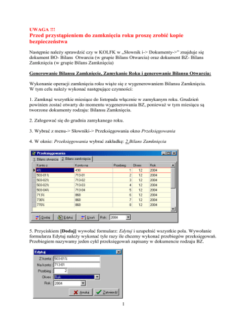 UWAGA !!! Przed przystąpieniem do zamknięcia roku proszę zrobić kopie bezpieczeństwa Następnie należy sprawdzić czy w KOLFK w „Słownik i-> Dokumenty->” znajduje się dokument BO- Bilans Otwarcia (w grupie Bilans Otwarcia) oraz dokument BZ- Bilans Zamknięcia (w grupie Bilans Zamknięcia) Generowanie Bilansu Zamknięcie, Zamykanie Roku i generowanie Bilansu Otwarcia: Wykonanie operacji zamknięcia roku wiąże się z wygenerowaniem Bilansu Zamknięcia. W tym celu należy wykonać następujące czynności: 1. Zamknąć wszystkie miesiące do listopada włącznie w zamykanym roku. Grudzień powinien zostać otwarty do momentu wygenerowania BZ, ponieważ w tym miesiącu są tworzone dokumenty rodzaju: Bilansu Zamknięcia. 2. Zalogować się do grudnia zamykanego roku. 3. Wybrać z menu-> Słowniki-> Przeksięgowania okno Przeksięgowania 4. W oknie: Przeksięgowania wybrać zakładkę: 2.Bilans Zamknięcia 5. Przyciskiem [Dodaj] wywołać formularz: Edytuj i uzupełnić wszystkie pola. Wywołanie formularza Edytuj należy wykonać tyle razy ile chcemy wykonać przebiegów przeksięgowań. Przebiegiem nazywamy jeden cykl przeksięgowań zapisany w dokumencie rodzaju BZ. 1 Opis pól formularza Edytuj: w pole Z konta: wpisujemy konto, z którego ma nastąpić wyksięgowanie. Znak % oznacza, że zostaną wyksięgowane salda wszystkich kont, których początek został wpisany w sposób jawny, a kończą się dowolnym ciągiem znaków. Takie same salda, zostaną zaksięgowane po stronie przeciwnej na koncie wpisanym w polu: Na konto: W pole Przebieg: należy wpisać numer kolejny wg, którego mają wykonać się przeksięgowania. W polu Okres: należy wybrać Rok W polu Rok: należy wybrać rok, dla którego wykonujemy BZ. 6. Po zdefiniowania przeksięgowań Bilansu Zamknięcie należy otworzyć z menu-> Administrator-> Zamknięcie Roku\ Generowanie Bilansu Zamknięcia-Otwarcia: formularz: Generuj bilans zamknięcia: Zamykanie roku odbywa się w dwóch krokach: 1. Generowanie BZ, wg ustawień w słowniku: Przeksięgowań 2. Zamknięcie Roku Generowanie BZ wykonujemy przyciskiem [Generuj] w sekcji formularza: Generowanie bilansu zamknięcia. Użytkownik może wygenerować jeden przebieg lub pozostawić domyślne ustawienia, wówczas zostanie wygenerowany BZ wg kolumny: Przebieg. Przebiegi już wygenerowane wyróżnione są kolorem zielonym. Przeksięgowania Bilansu Zamknięcia zapisywane są w dokumencie rodzaju Bilans Zamknięcie (menu-> Dokumenty -> Bilans Zamknięcia) w wybranym na formularzu MPZ. 2 Przeksięgowywane są salda dla każdego konta i MPK osobno. Każdy przebieg zapisany jest w osobnym dokumencie BZ. Bilansu Zamknięcia nie można wycofać automatycznie, natomiast można modyfikować, usuwać wytworzone przez automat dokumenty Bilansu Zamknięcia. 7. Przed wykonaniem operacji Zamknięcia Roku administrator systemu powinien ustawić w menu -> Administrator -> Parametry Systemu parametr: NIEDOZWOLONE_SALDA . Podczas instalacji systemu program domyślnie ustawia wartość parametru na: 5%,4%,7%. Co oznacza , że podczas zamykania roku na kontach zespołu 5,4,7 nie może być salda <> 0. Administrator może zmienić te wartości na inne lub usunąć wartości z pola i pozostawić je puste. 8. Po wygenerowaniu BZ należy zamknąć miesiąc grudzień zamykanego roku, po czym ponownie wywołać formularz: Generuj Bilans Zamknięcia i wykonać zamknięcie roku przyciskiem [Zamknij] w sekcji Zamkniecie roku. Program dopuszcza ponowne otworzenie roku: przyciskiem [Otwórz] widocznym w tej samej sekcji formularza. Generowanie Bilansu Otwarcia: W celu wygenerowania BO należy wykonać następujące czynności: 1. Zalogować się do roku, dla którego chcemy wygenerować BO. 2. Wybrać z menu-> Słowniki-> Przeksięgowania okno: Przeksięgowania 3. W oknie: Przeksięgowania wybrać zakładkę: 1.Bilans Otwarcia 3 Należy otworzyć formularza za pomocą przycisku [Dodaj], i wprowadzić w pole Z konta: konto z jakiego a w pole Na konto: konto na jakie mają się wykonać przeksięgowania Bilansu Otwarcia. w pole Rok: należy wpisać rok dla którego wykonujemy BO pole MPK: należy pozostawić puste jeżeli definiowane przeksięgowania mają dotyczyć całej firmy, lub należy wskazać MPK jeżeli przeksięgowania powinny wykonać się tylko dla wybranego MPK 4. Po zdefiniowania przeksięgowań Bilansu Otwarcia generowanie BO wykonujemy z menu> Administrator-> Zamknięcie Roku\ Generowanie Bilansu Zamknięcia-Otwarcia: z formularza: Generuj bilans zamknięcia Do tego celu służy przycisk [Generuj] w sekcji formularza: Generowanie Bilansu Otwarcia Jeżeli w słowniku Przeksięgowań nie zostanie zdefiniowane: z jakiego konta na jakie ma zostać wykonany BO to salda takich konta z poprzedniego roku przechodzą na saldo takich samych kont w roku następnym. Jeżeli w roku poprzednim istnieje konto, którego nie ma w roku, dla którego wykonywany jest BO, a w słowniku przeksięgowań nie zostanie wskazane na jakie konto powinny być przeksięgowane zapisy program wskaże błąd podczas generowania BO. Wygenerowany Bilans Otwarcia nie jest zapisywany w postaci dokumentu w programie tak jak Bilans Zamknięcia, ale jest pamiętany w bazie programu KOLFK. To sprawia, że generowany automatycznie BO nie może być modyfikowany przez użytkownika. Modyfikacji BO można dokonać poprzez tworzenie nowych zapisów księgowych w dokumentach rodzaju Bilans Otwarcia z menu-> Dokumenty-> Bilans Otwarcia. Wygenerowany automatycznie Bilans Otwarcia można wycofać przyciskiem [Wycofaj] w sekcji formularza: Generowanie Bilansu Otwarcia 4 5. Przeglądanie BZ odbywa się za pomocą: raportu wywołanego z menu -> Raporty-> Księga Główna-> Przeksięgowania Bilansu Zamknięcia. 6. Przeglądanie BO odbywa się za pomocą: raportu wywołanego z menu -> Raporty-> Księga Główna-> Bilans Otwarcia. 5