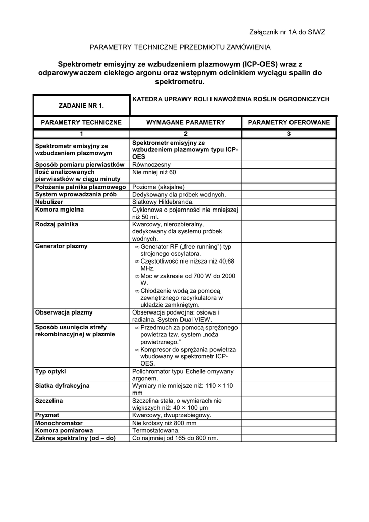 Załącznik nr 1A do SIWZ PARAMETRY TECHNICZNE PRZEDMIOTU ZAMÓWIENIA Spektrometr emisyjny ze wzbudzeniem plazmowym (ICP-OES) wraz z odparowywaczem ciekłego argonu oraz wstępnym odcinkiem wyciągu spalin do spektrometru. KATEDRA UPRAWY ROLI I NAWOśENIA ROŚLIN OGRODNICZYCH ZADANIE NR 1. PARAMETRY TECHNICZNE WYMAGANE PARAMETRY PARAMETRY OFEROWANE 1 2 Spektrometr emisyjny ze wzbudzeniem plazmowym typu ICPOES Równoczesny Nie mniej niŜ 60 3 Spektrometr emisyjny ze wzbudzeniem plazmowym Sposób pomiaru pierwiastków Ilość analizowanych pierwiastków w ciągu minuty PołoŜenie palnika plazmowego System wprowadzania prób Nebulizer Komora mgielna Rodzaj palnika Generator plazmy Obserwacja plazmy Sposób usunięcia strefy rekombinacyjnej w plazmie Typ optyki Siatka dyfrakcyjna Szczelina Pryzmat Monochromator Komora pomiarowa Zakres spektralny (od – do) Poziome (aksjalne) Dedykowany dla próbek wodnych. Siatkowy Hildebranda. Cyklonowa o pojemności nie mniejszej niŜ 50 ml. Kwarcowy, nierozbieralny, dedykowany dla systemu próbek wodnych. • Generator RF („free running”) typ strojonego oscylatora. • Częstotliwość nie niŜsza niŜ 40,68 MHz. • Moc w zakresie od 700 W do 2000 W. • Chłodzenie wodą za pomocą zewnętrznego recyrkulatora w układzie zamkniętym. Obserwacja podwójna: osiowa i radialna. System Dual VIEW. • Przedmuch za pomocą spręŜonego powietrza tzw. system „noŜa powietrznego.” • Kompresor do spręŜania powietrza wbudowany w spektrometr ICPOES. Polichromator typu Echelle omywany argonem. Wymiary nie mniejsze niŜ: 110 × 110 mm Szczelina stała, o wymiarach nie większych niŜ: 40 × 100 µm Kwarcowy, dwuprzebiegowy. Nie krótszy niŜ 800 mm Termostatowana. Co najmniej od 165 do 800 nm. Rozdzielczość optyczna Nie gorsza (nie wyŜsza) niŜ: a) 0,0048 nm przy długości fali 200 nm b) 0,0096 nm przy długości fali 400 nm c) 0,0192 nm przy długości fali 600 nm Rozdzielczość typy pixel – pixel Detektor półprzewodnikowy Nie gorsza (nie wyŜsza) niŜ 0,002 nm przy długości fali 200 nm. • Detektor typu CID – L-PAD. • Wymiary detektora – co najmniej 27 × 27 mm. • Liczba pixeli nie mniejsza niŜ 1000 × 1000 • Sumaryczna liczba aktywnych pixeli nie mniejsza niŜ 1 000 000. Chłodzenie do co najmniej do -30°C przy uŜyciu trójstopniowego układu Peltiera. 100 % System chłodzenia detektora Procentowy dostęp do widma światła Kalibracja aparatu Pompa perystaltyczna ZuŜycie argonu w czasie analizy ZuŜycie argonu do płukania optyki przed i po wykonywani analizy. Kontrolery przepływu argonu Kalibracja przy uŜyciu rtęciowej. • Liczba kanałów: 4 • Liczba rolek: 12 • Regulacja szybkości przepływu w zakresie 0,2 do 5 ml/min w krokach co 0,1 ml/min. Sumarycznie nie wyŜsze niŜ 22 3 dm /min w tym: 3 • - gaz plazmowy do 20 dm /min, 3 • - gaz do nebulizera do 1 dm /min, 3 • - gaz pomocniczy do 1 dm /min. 3 Tryb wolny – do 1 dm /min. 3 Tryb szybki – do 10 dm /min. Kontrola przepływu argonu z poziomu oprogramowania: • gaz plazmowy – kontroler masowy, • gaz nebulizujacy – kontroler objętościowy, • gaz pomocniczy – kontroler masowy. -3 Limity detekcji w µg · dm dla Limity detekcji dla poszczególnych 3σ pierwiastków nie gorsze niŜ (nie wyŜsze): As 1,50; Cd 0,10; Cu 0,35; Fe 0,20; Hg 1,50; Mo 0,4; Ni 0,30; Pb 1,10; Se 2,50; Ti 0,10; V 0,35. Akcesoria niezbędne do rozruchu, podłączenia i uŜywania zaoferowanego spektrometru INNE (wykonawca w oferowanych parametrach zobowiązany jest do dokładnego wyszczególnia) System wprowadzenia Palnik kwarcowy nierozbieralny, stęŜonych soli nebulizer typu Sea Spray, cyklonowa komora mgielna, nawilŜacz argonu. Zestaw do generacji wodorków Zestaw do generacji wodorków. Zestaw części zamiennych • Jeden standardowy palnik kwarcowy nierozbieralny, • WęŜyki do pompy perystaltycznej z PTFE (0,022’’ ID x 0,042’’) – 3 mb, • WęŜyki do pompy perystaltycznej z PCV 0,0045’’, red/red, 12 szt. • WęŜyki do pompy perystaltycznej z PCV 0,03’’ ID, black/black, 12 szt. • WęŜyki do pompy perystaltycznej z PTFE 0,030’’ ID x 0,062’’ - 3 m • Zaciski i kapilara do zasysania próbki z filtrem. Zestaw komputerowy do Komputer z procesorem Pentium D, sterowania systemem ICP-OES 1024 MB RAM, HDD 200 GB, FDD 1,44 MB, SVGA Color, monitor LCD 17”, karta, dźwiękowa, mysz optyczna, klawiatura, drukarka HP DJ 5940, oprogramowanie Win XP. Stolik na próby Stolik laboratoryjny na kółkach. Oprogramowanie do Oprogramowanie dostarczone na sterowania pracą ICP-OES i nośniku CD z licencją i kluczem na przetwarzania danych jedno stanowisko dedykowane dla systemu Windows XP. Oprogramowanie w języku polskim lub angielskim umoŜliwiające: • szybka analizę jakościowa i półilościowa nieznanej próbki – nie mniej niŜ 60 pierwiastków w 2 min, • bibliotekę co najmniej 25000 linii spektralnych, • stosowanie metody krzywej wzorcowej, dodatków, wzorca wewnętrznego, • kontrole jakości wyników (Quality Control Checking), • korekcje tła na bazie jednego lub dwóch punktów, • jednoczesny pomiar linii analitycznej oraz tła (w dowolnie wybranych miejscach), • moŜliwość oznaczania dodatkowych pierwiastków po zakończeniu analizy (dzięki dostępowi do wcześniej zarejestrowanych widm), • nakładanie widm, • statystyczne opracowanie otrzymanych wyników. Wyciąg spalin • Okap ze stali nierdzewnej nad spektrometrem ICP-OES, • 2 mb rury ze stal kwasoodpornej, • CichobieŜny wentylator zewnętrzny o wydajności nie mniejszej niŜ 170 3 m /h Odparowywacz ciekłego Zbiornik na ciekły argon z kółkami, argonu typ Euro-Cyl 180/24 pojemność netto 186 litrów, ciśnienie robocze 24 bar. Oferowana firma, typ, model , kraj rok produkcji Ilość szt/kpl. Cena netto Podatek VAT Wartość brutto O parametrach nie gorszych niŜ Prodigy DUAL VIEV Leeman-Labs 1 Mikrofalowy system przygotowania próbek do oznaczania na spekt