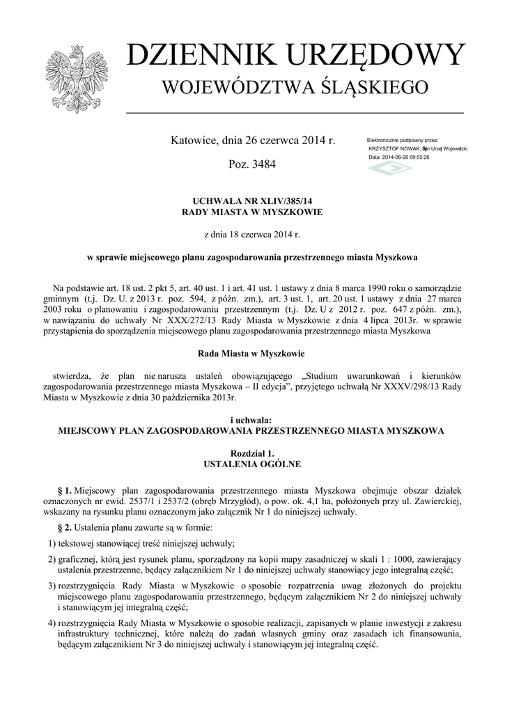 DZIENNIK URZĘDOWY WOJEWÓDZTWA ŚLĄSKIEGO Katowice, dnia 26 czerwca 2014 r. Elektronicznie podpisany przez: KRZYSZTOF NOWAK; Śląski Urząd Wojewódzki Poz. 3484 Data: 2014-06-26 09:55:26 UCHWAŁA NR XLIV/385/14 RADY MIASTA W MYSZKOWIE z dnia 18 czerwca 2014 r. w sprawie miejscowego planu zagospodarowania przestrzennego miasta Myszkowa Na podstawie art. 18 ust. 2 pkt 5, art. 40 ust. 1 i art. 41 ust. 1 ustawy z dnia 8 marca 1990 roku o samorządzie gminnym (t.j. Dz. U. z 2013 r. poz. 594, z późn. zm.), art. 3 ust. 1, art. 20 ust. 1 ustawy z dnia 27 marca 2003 roku o planowaniu i zagospodarowaniu przestrzennym (t.j. Dz. U z 2012 r. poz. 647 z późn. zm.), w nawiązaniu do uchwały Nr XXX/272/13 Rady Miasta w Myszkowie z dnia 4 lipca 2013r. w sprawie przystąpienia do sporządzenia miejscowego planu zagospodarowania przestrzennego miasta Myszkowa Rada Miasta w Myszkowie stwierdza, że plan nie narusza ustaleń obowiązującego „Studium uwarunkowań i kierunków zagospodarowania przestrzennego miasta Myszkowa – II edycja”, przyjętego uchwałą Nr XXXV/298/13 Rady Miasta w Myszkowie z dnia 30 października 2013r. i uchwala: MIEJSCOWY PLAN ZAGOSPODAROWANIA PRZESTRZENNEGO MIASTA MYSZKOWA Rozdział 1. USTALENIA OGÓLNE § 1. Miejscowy plan zagospodarowania przestrzennego miasta Myszkowa obejmuje obszar działek oznaczonych nr ewid. 2537/1 i 2537/2 (obręb Mrzygłód), o pow. ok. 4,1 ha, położonych przy ul. Zawierckiej, wskazany na rysunku planu oznaczonym jako załącznik Nr 1 do niniejszej uchwały. § 2. Ustalenia planu zawarte są w formie: 1) tekstowej stanowiącej treść niniejszej uchwały; 2) graficznej, którą jest rysunek planu, sporządzony na kopii mapy zasadniczej w skali 1 : 1000, zawierający ustalenia przestrzenne, będący załącznikiem Nr 1 do niniejszej uchwały stanowiący jego integralną część; 3) rozstrzygnięcia Rady Miasta w Myszkowie o sposobie rozpatrzenia uwag złożonych do projektu miejscowego planu zagospodarowania przestrzennego, będącym załącznikiem Nr 2 do niniejszej uchwały i stanowiącym jej integralną część; 4) rozstrzygnięcia Rady Miasta w Myszkowie o sposobie realizacji, zapisanych w planie inwestycji z zakresu infrastruktury technicznej, które należą do zadań własnych gminy oraz zasadach ich finansowania, będącym załącznikiem Nr 3 do niniejszej uchwały i stanowiącym jej integralną część. Dziennik Urzędowy Województwa Śląskiego –2– Poz. 3484 § 3. Na rysunku planu, stanowiącym załącznik Nr 1 do uchwały, obowiązują następujące oznaczenia graficzne będące ustaleniami planu: 1) granica obszaru objętego planem; 2) linie rozgraniczające tereny o różnym przeznaczeniu lub różnych zasadach zagospodarowania; 3) nieprzekraczalne linie zabudowy; 4) symbole cyfrowo-literowe identyfikujące tereny o ustalonym przeznaczeniu: a) 1U – tereny zabudowy usługowej, b) 1ZL – tereny lasów, c) 1KDG – tereny dróg publicznych klasy G, d) 1KDW – tereny dróg wewnętrznych. § 4. Ustalenia planu określają: 1) ustalenia szczegółowe odnoszące się do całego obszaru planu określone w §1 do §16; 2) ustalenia szczegółowe w zakresie przeznaczenia terenów, parametrów i wskaźników kształtowania zabudowy i zagospodarowania terenu określone w §17 do §20; 3) ustalenia końcowe określone w §21 do §24. § 5. Ilekroć w dalszych przepisach niniejszej uchwały jest mowa o: 1) rysunku planu – należy przez to rozumieć ustalenia planu zawarte w formie graficznej; 2) terenie – należy przez to rozumieć obszar wyznaczony na rysunku planu liniami rozgraniczającymi, oznaczony symbolem identyfikującym: liczbowym i literowym, określającym jego przeznaczenie; 3) przeznaczeniu podstawowym – należy przez to rozumieć takie przeznaczenie terenu, które przeważa funkcjonalnie na działce budowlanej (na terenach zabudowy) lub działce (na terenach z zakazem zabudowy); 4) przeznaczeniu uzupełniającym – należy przez to rozumieć przeznaczenie działki budowlanej (na terenach zabudowy) lub działki (na terenach z zakazem zabudowy), które uzupełnia przeznaczenie podstawowe lub może z nim współistnieć na zasadach określonych w planie; 5) wskaźniku zabudowy – należy przez to rozumieć stosunek sumy powierzchni zabudowy wszystkich budynków zlokalizowanych w obrębie działki budowlanej do powierzchni tej działki budowlanej; 6) powierzchni zabudowy budynku – należy przez to rozumieć powierzchnię kondygnacji parterowej liczonej po zewnętrznym obrysie budynku w poziomie terenu bez: części obiektów budowlanych nie wystających ponad powierzchnię terenu, schodów zewnętrznych, tarasów, podjazdów; 7) nieprzekraczalnej linii zabudowy - należy przez to rozumieć wyznaczoną na rysunku planu linię, w której może być usytuowana ściana budynku, bez prawa jej przekroczenia w kierunku linii rozgraniczającej terenu, przy czym dopuszczalne jest wysunięcie poza wyznaczoną linię zabudowy, na odległość nie większą niż 1,5m, elementów takich jak: nieobudowane balkony, okapy, loggie, ryzality, gzymsy, wykusze, rynny i rury spustowe, elementy wejść do budynków i inne elementy wystroju architektonicznego elewacji; 8) wysokości całkowitej budynku – należy przez to rozumieć wysokość budynku wraz z instalacjami i urządzeniami na dachu; 9) dachu płaskim - należy przez to rozumieć dach o nachyleniu połaci dachowych nieprzekraczającym 5º; 10) reklamie wielkoformatowej – należy przez to rozumieć nośnik reklamowy, w tym wolnostojący, o powierzchni reklamowej powyżej 6 m2; 11) infrastrukturze technicznej – należy przez to rozumieć sieci przesyłowe (podziemne, naziemne lub nadziemne), urządzenia i związane z nim obiekty służące w szczególności do obsługi obszaru objętego planem w zakresie komunikacji, zaopatrzenia w wodę, ciepło, energię elektryczną i paliwa gazowe, Dziennik Urzędowy Województwa Śląskiego –3– Poz. 3484 odprowadzenia ściek