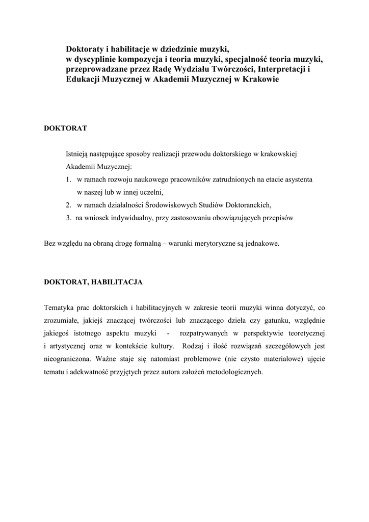 Doktoraty i habilitacje w dziedzinie muzyki, w dyscyplinie kompozycja i teoria muzyki, specjalność teoria muzyki, przeprowadzane przez Radę Wydziału Twórczości, Interpretacji i Edukacji Muzycznej w Akademii Muzycznej w Krakowie DOKTORAT Istnieją następujące sposoby realizacji przewodu doktorskiego w krakowskiej Akademii Muzycznej: 1. w ramach rozwoju naukowego pracowników zatrudnionych na etacie asystenta w naszej lub w innej uczelni, 2. w ramach działalności Środowiskowych Studiów Doktoranckich, 3. na wniosek indywidualny, przy zastosowaniu obowiązujących przepisów Bez względu na obraną drogę formalną – warunki merytoryczne są jednakowe. DOKTORAT, HABILITACJA Tematyka prac doktorskich i habilitacyjnych w zakresie teorii muzyki winna dotyczyć, co zrozumiałe, jakiejś znaczącej twórczości lub znaczącego dzieła czy gatunku, względnie jakiegoś istotnego aspektu muzyki - i artystycznej oraz w kontekście kultury. rozpatrywanych w perspektywie teoretycznej Rodzaj i ilość rozwiązań szczegółowych jest nieograniczona. Ważne staje się natomiast problemowe (nie czysto materiałowe) ujęcie tematu i adekwatność przyjętych przez autora założeń metodologicznych. ZAKRESY TEMATYCZNE: ● Dzieło muzyczne - usytuowane w kontekście kultury i funkcjonujące w przestrzeni życia muzycznego - poddane wielostronnej analizie i interpretacji. Analogicznie: grupa dzieł danego kompozytora stanowiąca pewną całość, np. reprezentująca określony gatunek czy inny sensowny zbiór. ● Całokształt twórczości kompozytora - znaczącego dla swego miejsca i czasu - w ujęciu monograficznym. Analogicznie: monograficzne ujęcie jakiegoś gatunku, rodzaju, genre’u, modusu czy stylu - specyficznego i ważnego dla kultury muzycznej określonej epoki. ● Zespół aspektów formalnych i technicznych twórczości muzycznej, ich specyfika i funkcja w perspektywie synchronicznej wzgl. diachronicznej.. ● Zagadnienia wchodzące w zakres poetyki muzycznej. ● Problematyka badawcza interpretacji artystycznej (dźwiękowej) dzieła muzycznego. ● Problematyka badawcza percepcji słuchowej i recepcji kulturowej dzieła muzycznego. ● Problematyka relacji zachodzących między muzyką a literaturą, teatrem i innymi sztukami. Aspekty intermedialne i intertekstualne dzieła muzycznego.. TEMATY PRAC DOKTORSKICH I HABILITACYJNYCH realizowanych na Wydziale Twórczości, Interpretacji i Edukacji Muzycznej w Akademii Muzycznej w Krakowie: ■ Wykaz tematów prac habilitacyjnych: Dyrygentura Delimat Wiesław: Zapomniane kantaty kościelne Georga Antona Bendy ze zbiorów SingAkademie zu Berlin, wyd. Wydawnictwo naukowe PAT, 2008 rok; nr ISBN 978-83-7438-2 Górski Waldemar: „Kantata” w Elblągu, wyd. przez Elbląska Uczelnia HumanistycznoEkonomiczna, 2005 rok; ISBN 83-89113-13-9 Teoria muzyki Granat – Janki Anna: Twórczość kompozytorów wrocławskich w latach 1945-2000, wyd. Akademia Muzyczna im. Lipińskiego we Wrocławiu, Wrocław 2003; ISBN 83-8653422-2 ■ Wykaz tematów prac doktorskich: Teoria muzyki Bilica Krzysztof: Kadencja polska w utworach Fryderyka Chopina jako wyraz oddziaływania systemu akcentuacyjnego XIX-wiecznej polszczyzny na muzykę narodową Borowiecka Renata: Stabat Mater w twórczości kompozytorów włoskich XVIII wieku. Od słowa do muzycznej interpretacji. Czachorowska – Zygor Ewa: Oblicza twórcze Adama Walacińskiego. Muzyka autonomiczna. Muzyka funkcjonalna. Publicystyka. Draus Agnieszka, Cykl sceniczny Licht Karlheinza Stockhausena. Muzyczny teatr świata. Hendrich Joanna: Układy symetryczne w twórczości symfonicznej Witolda Lutosławskiego w świetle przemian stylu Jarosz Karolina, Polska miniatura skrzypcowa od Karola Lipińskiego do Grażyny Bacewicz Kaczmarczyk Katarzyna, Relacje muzyki i malarstwa w polskiej twórczości instrumentalnej drugiej połowy XX wieku. Kiwała Kinga: Symfonie Lutosławskiego, Pendereckiego i Góreckiego w świetle polskich koncepcji fenomenologicznych. Sopata Natalia, Między tradycją a awangardą. Muzyka Pawła Szymańskiego Szczurko Elżbieta, Twórczość Antoniego Szałowskiego w kontekście muzyki XX wieku. Wójtowicz Ewa: Twórczość symfoniczna Ludomira Michała Rogowskiego: od genezy do recepcji Kompozycja Czerniewicz Marek, Idea collage’u w utworze Ab initio per Coro misto, Coro di Balbini, pianoforte e orchestra Jabri Zaid, Kantata do tekstów aramejskich. Cechy mojego języka muzycznego. Lee HyeOne: Elementy tradycyjnej muzyki koreańskiej w mojej kompozycji Poemat na orkiestrę symfoniczną Łuczkowski Radosław, Sinfonietta per orchestra. Materiał dźwiękowy i jego organizacja jako wyznacznik stylu kompozytorskiego. Pawełek Michał, Ephreia na zespół kameralny i elektronikę jako przykład wielkiej formy jednoczęściowej ujętej w zapis partyturowy z zastosowaniem systemów interaktywnych w procesie sterowania przetworzeniem dźwięku, a także w procesie selekcji i modyfikacji materiału dźwiękowego. Zych Wojciech: Sposoby strukturalnej i formalnej integracji wielkiej formy muzycznej w mojej II Symfonii. Autoanaliza dzieła w kontekście inspiracji rozwiązaniami fakturalnymi i formalnymi w wybranych utworach na orkiestrę i na instrument solowy z orkiestrą Alfreda Schnidtke z lat 1984 – 1994. Dyrygentura Chyła Małgorzata: Utwory o tematyce maryjnej w polskiej muzyce chóralnej a cappella XX i XXI wieku na przykładzie utworów H. J. Botora, H. M. Góreckiego, A. Koszewskiego, T. Szeligowskiego, R. Twardowskiego, W. Widłaka Citak Andrzej, Henryk Jan Botor i jego muzyka chóralna: idee – konteksty – zagadnienia wykonawcze na przykładzie „Misericordias Domini” oraz „Missa de Misericordia Domini” Diakun Marzena: Przemiany stylistyczne w twórczości symfonicznej polskich kompozytorów okresu klasycyzmu. Problematyka interpretacji wykonawczej na przykładzie opublikowanych i nagranych utworów Michniewski Wojciech: Praca dyrygenta nad materiałem muzycznym nie okreś