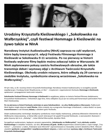 Urodziny Krzysztofa Kieślowskiego i „Sokołowsko na Wałbrzyskiej”,czyli festiwal Hommage à Kieślowski na żywo także w NInA Narodowy Instytut Audiowizualny (NInA) zaprasza na cykl wydarzeń, które będą towarzyszyć 6. edycji Festiwalu Filmowego Hommage à Kieślowski w Sokołowsku 9-11 września. Po raz pierwszy w historii festiwalu wybrane filmy będzie można zobaczyć także w Warszawie. W NInA zaplanowano pokazy sześciu festiwalowych obrazów, ale także transmisje debat i wystawę zdjęć z Archiwum Twórczości Krzysztofa Kieślowskiego. Obchody urodzin reżysera, które odbędą się 29 czerwca w siedzibie Instytutu, symbolicznie otworzą wrześniowe „Sokołowsko na Wałbrzyskiej”. W tym roku, w 20. rocznicę śmierci Krzysztofa Kieślowskiego Narodowy Instytut Audiowizualny w szczególny sposób współpracuje z Fundacją Sztuki Współczesnej „In Situ” – inicjatorem i organizatorem festiwalu Hommage à Kieślowski, opiekunem i propagatorem twórczości reżysera. Sokołowsko Festiwal Filmowy Hommage à Kieślowski to wyjątkowy, jedyny na świecie festiwal filmowy dedykowany Krzysztofowi Kieślowskiemu i miłośnikom jego kina, który odbędzie się już po raz szósty pod honorowym patronatem Pani Marii Kieślowskiej. Po raz pierwszy w historii festiwalu zaistnieje on poza Sokołowskiem - na ulicy Wałbrzyskiej w Warszawie. Publiczność NInA będzie mogła obejrzeć sześć filmów, które znalazły się w programie Hommage à Kieślowski, a także śledzić na żywo, transmitowane w sali kinowej debaty z udziałem gości festiwalu. Dzięki audiowizualnej technologii zbudujemy symboliczny most między malowniczą, położoną kilkanaście kilometrów od Wałbrzycha miejscowością, w której kilka swoich dziecięcych lat spędził Krzysztof Kieślowski, a warszawskim Służewem – gdzie kręcony był m.in. „Dekalog” – mówi Michał Merczyński, dyrektor NInA. Szczególnym wydarzeniem, będącym zarazem zapowiedzią „Sokołowska na Wałbrzyskiej”, będą obchody urodzin Kieślowskiego w siedzibie Instytutu. Już dziś, 29 czerwca od godz. 18.00 przypomniana zostanie jedna z części trylogii „Trzy Kolory” – „Czerwony”, a także „Podwójne życie Weroniki” zaprezentowane w niezwykłej scenerii dziedzińca NInA. Wieczór uświetni spotkanie z przyjaciółmi i współpracownikami reżysera, a także wernisaż wystawy zdjęć z Archiwum Twórczości Krzysztofa Kieślowskiego. Urodziny Krzysztofa Kieślowskiego w NInA, 29 czerwca 2016 Gdyby Krzysztof Kieślowski żył, 27 czerwca 2016 roku skończyłby 75 lat. W środę 29 czerwca Narodowy Instytut Audiowizualny (NInA) zaprasza na bardzo wyjątkowy wieczór poświęcony reżyserowi. O godzinie 18.00 w sali kinowej Instytutu przypominany zostanie „Czerwony”, ostatni film w karierze Kieślowskiego, który po ponad 20 latach od premiery zyskuje na nowo aktualność. Plan osobistej introspekcji przenika się tu z kontekstem społecznym – odpowiedzialności za zbiorowość, powiązania losu z wydarzeniami, na które nie mamy wpływu. W głównych rolach wystąpili Irène Jacob oraz Jean-Louisem Trintignant. Film otrzymał aż trzy nominacje do Oskara – za scenariusz, reżyserię i zdjęcia. Po projekcji odbędzie się niezwykłe spotkanie z przyjaciółmi i współpracownikami reżysera wokół aktualności „Trzech kolorów”, m.in. tego czy możliwe jest utrzymanie triady wartości „wolność, równość, braterstwo” w rzeczywistości współczesnej Europy. W spotkaniu, które poprowadzi Grażyna Torbicka, udział wezmą: Artur Barciś, Krzysztof Bednarski, Violetta Buhl, Andrzej Jurga, Maja Komorowska, Bogusław Linda, Magdalena Łazarkiewicz, Dorota Paciarelli, Jacek Petrycki, Krzysztof Piesiewicz, Irena Strzałkowska, Zbigniew Zamachowski, Krzysztof Zanussi i Michał Żarnecki. O 21.15 w przestrzeni Café Gorączka odbędzie się wernisaż wystawy zdjęć z Archiwum Twórczości Krzysztofa Kieślowskiego, będącej wyborem fotosów z planu, migawek z życia prywatnego i zawodowego, w którym Kieślowski pokazany jest jako człowiek wśród innych ludzi – znajomych, współpracowników, w skupieniu, zadumie, zmęczeniu. Wystawę w siedzibie NInA będzie można oglądać do 12 września. Zwieńczeniem wieczoru będzie plenerowy pokaz „Podwójnego życia Weroniki”, pierwszego filmu reżysera zrealizowanego poza granicami Polski. Film wyprodukowany w 1991 roku, według krytyków, otworzył nowy rozdział w twórczości Krzysztofa Kieślowskiego. Na Festiwalu Filmowym w Cannes film został uhonorowany potrójnie: nagrodą dla Irène Jacob za najlepszą rolę kobiecą, nagrodą FIPRESCI dla Krzysztofa Kieślowskiego oraz nagrodą Jury Ekumenicznego. Pokaz na zielonym dziedzińcu NInA rozpocznie się o godz. 21.30. Warto zabrać dokument ze zdjęciem – będzie niezbędny do wypożyczenia słuchawek. W razie niesprzyjającej pogody, pokaz filmu odbędzie się w sali kinowej. Wstęp na wydarzenie jest wolny. Sala ma ograniczoną liczbę miejsc (120), warto więc przyjść trochę wcześniej. Partnerem urodzin Krzysztofa Kieślowskiego w NInA jest Fundacja Sztuki Współczesnej „In Situ”. „Sokołowsko na Wałbrzyskiej”, 9-11 września 2016, Narodowy Instytut Audiowizualny ul. Wałbrzyska 3/5, Warszawa Dzięki współpracy Fundacji Sztuki Współczesnej „In Situ” i Narodowego Instytutu Audiowizualnego, partnera festiwalu, część wydarzeń będzie dostępna także w stolicy. Warszawska publiczność będzie mogła śledzić debaty z gośćmi, dzięki transmisjom w siedzibie Instytutu. Równolegle w Sokołowsku i w NInA będzie można także obejrzeć następujące filmy: „Bez końca”, reż. Krzysztof Kieślowski, Polska 1984 (103 min.) Filmowe rozliczenie Krzysztofa Kieślowskiego ze stanem wojennym w Polsce i zarazem pierwszy film, którego scenariusz współtworzył Krzysztof Piesiewicz. Wdowa po adwokacie broniącym uwięzionych opozycjonistów nie może 