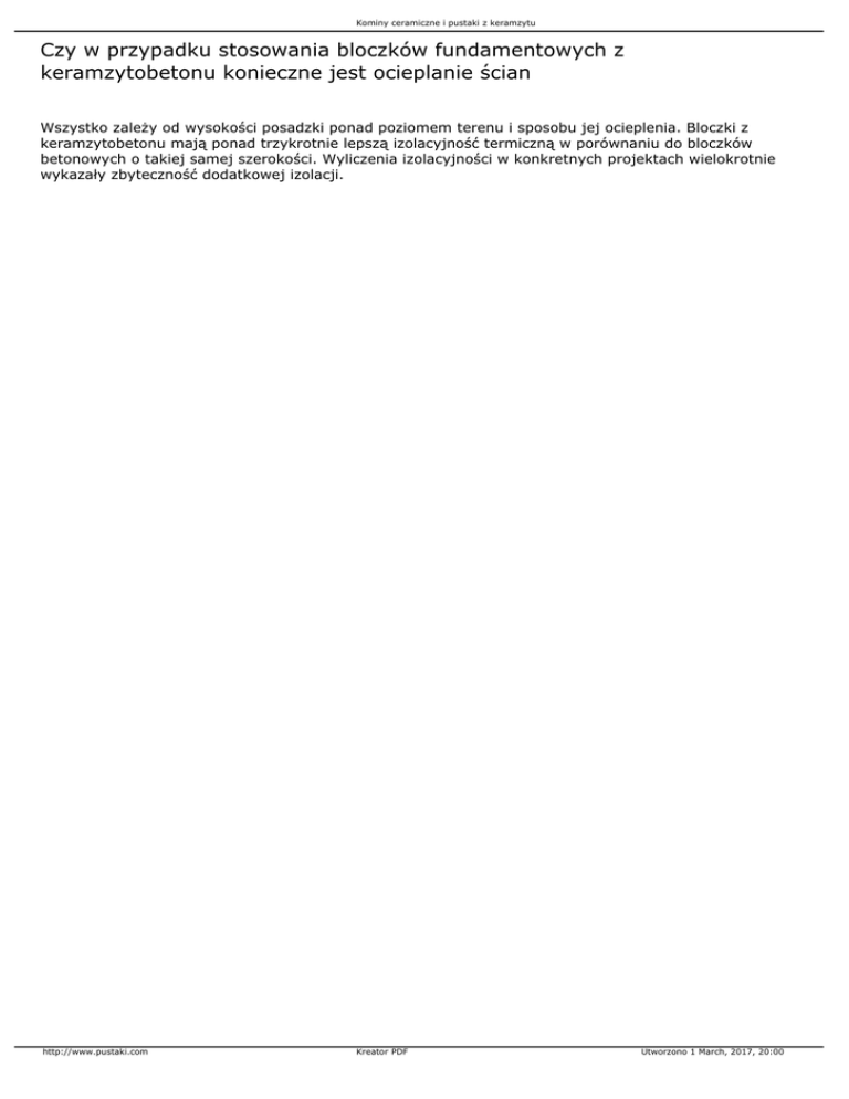 Kominy ceramiczne i pustaki z keramzytu Czy w przypadku stosowania bloczków fundamentowych z keramzytobetonu konieczne jest ocieplanie ścian Wszystko zależy od wysokości posadzki ponad poziomem terenu i sposobu jej ocieplenia. Bloczki z keramzytobetonu mają ponad trzykrotnie lepszą izolacyjność termiczną w porównaniu do bloczków betonowych o takiej samej szerokości. Wyliczenia izolacyjności w konkretnych projektach wielokrotnie wykazały zbyteczność dodatkowej izolacji. http://www.pustaki.com Kreator PDF Utworzono 1 March, 2017, 20:00