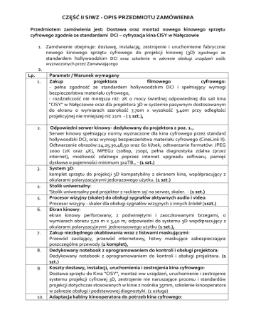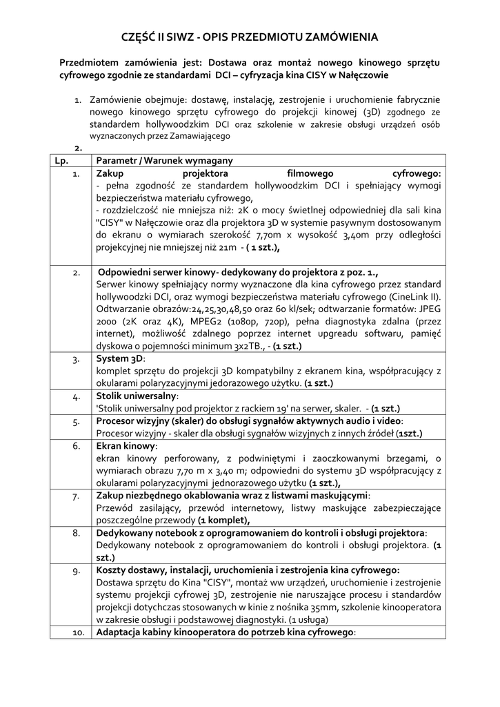 CZĘŚĆ II SIWZ - OPIS PRZEDMIOTU ZAMÓWIENIA Przedmiotem zamówienia jest: Dostawa oraz montaż nowego kinowego sprzętu cyfrowego zgodnie ze standardami DCI – cyfryzacja kina CISY w Nałęczowie 1. Zamówienie obejmuje: dostawę, instalację, zestrojenie i uruchomienie fabrycznie nowego kinowego sprzętu cyfrowego do projekcji kinowej (3D) zgodnego ze standardem hollywoodzkim DCI oraz szkolenie w zakresie obsługi urządzeń osób wyznaczonych przez Zamawiającego 2. Lp. 1. 2. 3. 4. 5. 6. 7. 8. 9. 10. Parametr / Warunek wymagany Zakup projektora filmowego cyfrowego: - pełna zgodność ze standardem hollywoodzkim DCI i spełniający wymogi bezpieczeństwa materiału cyfrowego, - rozdzielczość nie mniejsza niż: 2K o mocy świetlnej odpowiedniej dla sali kina "CISY" w Nałęczowie oraz dla projektora 3D w systemie pasywnym dostosowanym do ekranu o wymiarach szerokość 7,70m x wysokość 3,40m przy odległości projekcyjnej nie mniejszej niż 21m - ( 1 szt.), Odpowiedni serwer kinowy- dedykowany do projektora z poz. 1., Serwer kinowy spełniający normy wyznaczone dla kina cyfrowego przez standard hollywoodzki DCI, oraz wymogi bezpieczeństwa materiału cyfrowego (CineLink II). Odtwarzanie obrazów:24,25,30,48,50 oraz 60 kl/sek; odtwarzanie formatów: JPEG 2000 (2K oraz 4K), MPEG2 (1080p, 720p), pełna diagnostyka zdalna (przez internet), możliwość zdalnego poprzez internet upgreadu softwaru, pamięć dyskowa o pojemności minimum 3x2TB., - (1 szt.) System 3D: komplet sprzętu do projekcji 3D kompatybilny z ekranem kina, współpracujący z okularami polaryzacyjnymi jedorazowego użytku. (1 szt.) Stolik uniwersalny: 'Stolik uniwersalny pod projektor z rackiem 19' na serwer, skaler. - (1 szt.) Procesor wizyjny (skaler) do obsługi sygnałów aktywnych audio i video: Procesor wizyjny - skaler dla obsługi sygnałów wizyjnych z innych źródeł (1szt.) Ekran kinowy: ekran kinowy perforowany, z podwiniętymi i zaoczkowanymi brzegami, o wymiarach obrazu 7,70 m x 3,40 m; odpowiedni do systemu 3D współpracujący z okularami polaryzacyjnymi jednorazowego użytku (1 szt.), Zakup niezbędnego okablowania wraz z listwami maskującymi: Przewód zasilający, przewód internetowy, listwy maskujące zabezpieczające poszczególne przewody (1 komplet), Dedykowany notebook z oprogramowaniem do kontroli i obsługi projektora: Dedykowany notebook z oprogramowaniem do kontroli i obsługi projektora. (1 szt.) Koszty dostawy, instalacji, uruchomienia i zestrojenia kina cyfrowego: Dostawa sprzętu do Kina "CISY", montaż ww urządzeń, uruchomienie i zestrojenie systemu projekcji cyfrowej 3D, zestrojenie nie naruszające procesu i standardów projekcji dotychczas stosowanych w kinie z nośnika 35mm, szkolenie kinooperatora w zakresie obsługi i podstawowej diagnostyki. (1 usługa) Adaptacja kabiny kinooperatora do potrzeb kina cyfrowego: 11. Usługa polegająca na dostosowaniu kabiny kinooperatora do potrzeb instalacji sprzętu cyfrowego. (1 usługa) Wymagane jest, aby Wykonawca przed złożeniem oferty, dokonał wizji lokalnej kabiny kinooperatora i prawidłowo skalkulował wartość prac niezbędnych do przystosowania kabiny w zależności od typu proponowanego sprzętu do montażu w ramach zamówienia. Zakup okularów pasywnych: Okulary pasywne jednorazowego użytku do systemu 3D w różnej wielkości. (1000 szt.) 2. Zamawiający wymaga, aby dostarczony przedmiot zamówienia, tj. kinowy sprzęt cyfrowy do projekcji kinowej 3D w rozdzielczości 2K dla Kina „CISY”, był zgodny ze standardami DCI i wymaganiami stawianymi dla zawodowego kina cyfrowego. 3. Przedmiot zamówienia musi być dostosowany do wymiarów, warunków i wyposażenia sali kinowej kina CISY w Nałęczowie. Poniżej przedstawiamy parametry: a) liczba miejsc siedzących sali kinowej – 198 szt. b) szerokość ekranu – 7,50 m c) wysokość ekranu – 3,40 m d) odległość projekcyjna od okienka projekcyjnego – 21 m 4. Przedmiot zamówienia musi być kompatybilny z kinowym systemem dźwiękowym Dolby SR dla kina „CISY” w Nałęczowie, tj. procesorem dźwięku DOLBY CP 650 D. 5. Zamawiający w ramach zamówienia wymaga dostawy oryginalnego sprzętu, fabrycznie nowego, nieużywanego, nieuszkodzonego i oryginalnie zapakowanego, nie noszącego śladów uszkodzeń, użytkowania. W przypadku stwierdzenia, że dostarczone elementy wyposażenia nie spełniają powyższych wymogów, Zamawiający odmówi odbioru, sporządzając protokół zawierający przyczyny odmowy odbioru. Zamawiający wyznaczy termin dostarczenia urządzeń nowych, wolnych od wad. Procedura czynności odbioru zostanie powtórzona. 6. Przedmiot zamówienia winien być dostarczony (w ilości wskazanej w ofercie) do kina Cisy w Nałęczowie i zamontowany w kabinie operatora kina w sposób umożliwiający rozpoczęcie projekcji. 7. Dostawa i montaż nowych urządzeń na miejsce realizacji zamówienia, wskazane przez Zamawiającego, realizowane będą przez Wykonawcę w ramach ceny ofertowej. 8. W ramach zamówienia Wykonawca przeszkoli wyznaczone przez Zamawiającego osoby w zakresie obsługi oferowanego sprzętu w siedzibie Zamawiającego. 9. Potwierdzeniem kompletności dostawy urządzeń wraz z dokumentacją instalacji jak również montażu, integracji urządzeń i ich uruchomienia oraz przeszkolenia pracowników będzie podpisany przez obie strony protokół odbioru technicznego. W terminie 7 dni od dnia sporządzenia protokołu odbioru technicznego Wykonawca zorganizuje dla Zamawiającego projekcję po której zostanie sporządzony protokół odbioru jakościowego służący stwierdzeniu, czy dostarczone urządzenia spełniają wymogi jakościowe oraz parametry techniczne sprzętu, zgodnie z warunkami SIWZ i ofertą Wykonawcy 10. Wykonawca zobowiązany jest bez dodatkowego wezwania, w dniu podpisania protokołu odbioru technicznego do dostarczenia Zamawiającemu kompletu dokumentów dopuszczających wyroby do użytku, zgodnie z obowiązującymi przepisami w