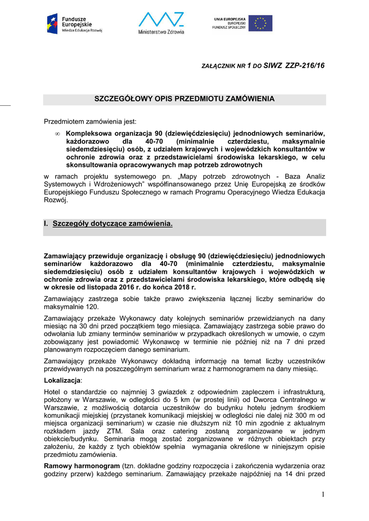 ZAŁĄCZNIK NR 1 DO SIWZ ZZP-216/16 SZCZEGÓŁOWY OPIS PRZEDMIOTU ZAMÓWIENIA Przedmiotem zamówienia jest: • Kompleksowa organizacja 90 (dziewięćdziesięciu) jednodniowych seminariów, każdorazowo dla 40-70 (minimalnie czterdziestu, maksymalnie siedemdziesięciu) osób, z udziałem krajowych i wojewódzkich konsultantów w ochronie zdrowia oraz z przedstawicielami środowiska lekarskiego, w celu skonsultowania opracowywanych map potrzeb zdrowotnych w ramach projektu systemowego pn. „Mapy potrzeb zdrowotnych - Baza Analiz Systemowych i Wdrożeniowych” współfinansowanego przez Unię Europejską ze środków Europejskiego Funduszu Społecznego w ramach Programu Operacyjnego Wiedza Edukacja Rozwój. I. Szczegóły dotyczące zamówienia. Zamawiający przewiduje organizację i obsługę 90 (dziewięćdziesięciu) jednodniowych seminariów każdorazowo dla 40-70 (minimalnie czterdziestu, maksymalnie siedemdziesięciu) osób z udziałem konsultantów krajowych i wojewódzkich w ochronie zdrowia oraz z przedstawicielami środowiska lekarskiego, które odbędą się w okresie od listopada 2016 r. do końca 2018 r. Zamawiający zastrzega sobie także prawo zwiększenia łącznej liczby seminariów do maksymalnie 120. Zamawiający przekaże Wykonawcy daty kolejnych seminariów przewidzianych na dany miesiąc na 30 dni przed początkiem tego miesiąca. Zamawiający zastrzega sobie prawo do odwołania lub zmiany terminów seminariów w przypadkach określonych w umowie, o czym zobowiązany jest powiadomić Wykonawcę w terminie nie później niż na 7 dni przed planowanym rozpoczęciem danego seminarium. Zamawiający przekaże Wykonawcy dokładną informację na temat liczby uczestników przewidywanych na poszczególnym seminarium wraz z harmonogramem na dany miesiąc. Lokalizacja: Hotel o standardzie co najmniej 3 gwiazdek z odpowiednim zapleczem i infrastrukturą, położony w Warszawie, w odległości do 5 km (w prostej linii) od Dworca Centralnego w Warszawie, z możliwością dotarcia uczestników do budynku hotelu jednym środkiem komunikacji miejskiej (przystanek komunikacji miejskiej w odległości nie dalej niż 300 m od miejsca organizacji seminarium) w czasie nie dłuższym niż 10 min zgodnie z aktualnym rozkładem jazdy ZTM. Sala oraz catering zostaną zorganizowane w jednym obiekcie/budynku. Seminaria mogą zostać zorganizowane w różnych obiektach przy założeniu, że każdy z tych obiektów spełnia wymagania określone w niniejszym opisie przedmiotu zamówienia. Ramowy harmonogram (tzn. dokładne godziny rozpoczęcia i zakończenia wydarzenia oraz godziny przerw) każdego seminarium. Zamawiający przekaże najpóźniej na 14 dni przed 1 jego datą. W przypadku gdy zawarcie umowy nastąpi w terminie późniejszym, Zamawiający przekaże harmonogram w dniu zawarcia umowy. Zamówienie obejmuje: 1. Zapewnienie sali wraz z odpowiednim wyposażeniem. 2. Oznaczenie miejsca wydarzenia. 3. Zapewnienie miejsca na recepcję i jej obsługę. 4. Zapewnienie usługi cateringowej i kelnerskiej oraz zapewnienie sali wraz z odpowiednim wyposażeniem w ramach tej usługi. 5. Zapewnienie bezpłatnej szatni dla uczestników seminariów. 6. Zapewnienie bezpłatnych miejsc parkingowych dla uczestników seminariów przyjeżdżających własnym środkiem lokomocji. 7. Przygotowanie materiałów dla uczestników seminariów 8. Zapewnienie sprzętu komputerowego oraz przyłącza internetowego. Ad. 1. Zapewnienie sali wraz z odpowiednim wyposażeniem. Wykonawca będzie zobowiązany do zapewnienia klimatyzowanej sali na każde z 90 (dziewięćdziesięciu) seminariów, dostosowanej do liczby około 40-70 osób, z odpowiednim wyposażeniem, do wykorzystania w ramach prowadzonych seminariów w postaci: • stoły oraz fotele dla uczestników i prowadzących (łącznie dla minimum 45, maksymalnie 75 osób, w tym 40-70 uczestników oraz około 5 osób ze strony Zamawiającego). Dokładne ustawienie stołów i miejsc na sali zostanie uzgodnione pomiędzy Zamawiającym a Wykonawcą, • dostęp do światła dziennego z możliwością zaćmienia sali oraz zapewnienia oświetlenia sztucznego, • tablica flipchart z minimum 4 pisakami (różne kolory), • rzutnik multimedialny wraz z ekranem, • laptop z dostępem do internetu (zgodnie z opisem w pkt. 8.), • odpowiednie nagłośnienie, • możliwość korzystania z mikrofonu (zapewnienie min. 3 sztuk mikrofonów bezprzewodowych oraz 2 stacjonarnych), • zaplecze sanitarne na tym samym piętrze co sala, • zapewnienie obsługi technicznej na 1 godzinę przed i w trakcie każdego seminarium. Sala i jej lokalizacja w budynku musi spełniać warunki umożliwiające dostęp dla osób niepełnosprawnych (tzn. brak barier architektonicznych, parter lub piętro z windą dostosowaną do przewozu osób niepełnosprawnych). Sala, w której odbywać się będą seminaria będzie zamykana na czas przerw i zabezpieczona przed niepowołanym dostępem. Za ewentualne szkody związane ze zniszczeniem lub kradzieżą sprzętu komputerowego Zamawiającego oraz ww. wyposażenia sali odpowiada Wykonawca. Ad. 2. Oznaczenie miejsca wydarzenia. Wykonawca jest zobowiązany do przygotowania oznaczeń: 2 • sali, sali cateringowej oraz szatni, • ciągów pieszych na terenie obiektu, w którym odbywać się będzie seminarium, ułatwiających dotarcie uczestników do sali, sali cateringowej i szatni od wejścia głównego obiektu oraz z parkingu. Oznaczenia muszą zawierać system identyfikacji wizualnej zgodny z zasadami z Księgi identyfikacji wizualnej znaku marki Fundusze Europejskie i znaków programów polityki spójności na lata 2014-2020. Wykonawca jest zobowiązany do przekazania wersji elektronicznej oznaczeń do akceptacji Zamawiającego na minimum 3 dni przed planowaną datą organizacji pierwszego seminarium Ad. 3. Zapewnienie miejsca na recepcję i jej obsługa. Wykonawca będzie zobowiązany zapewnić w bezpośrednim sąsiedztwie wejścia do sali miejsce wra