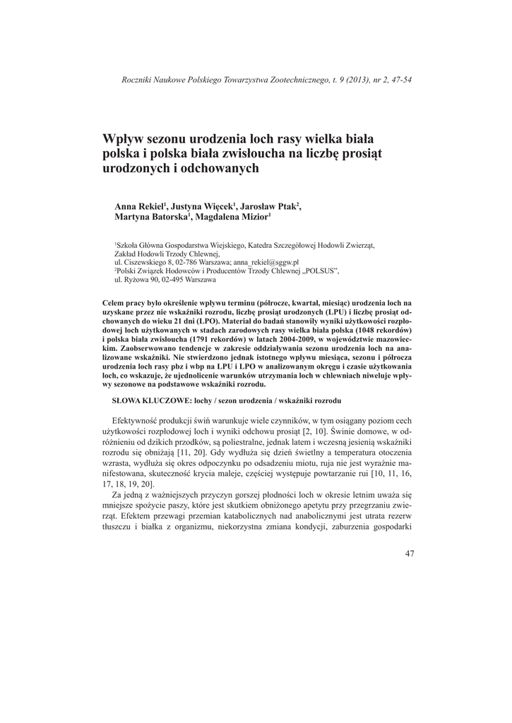 Wpływ sezonu urodzenia loch rasy wielka biała polska i polska biała