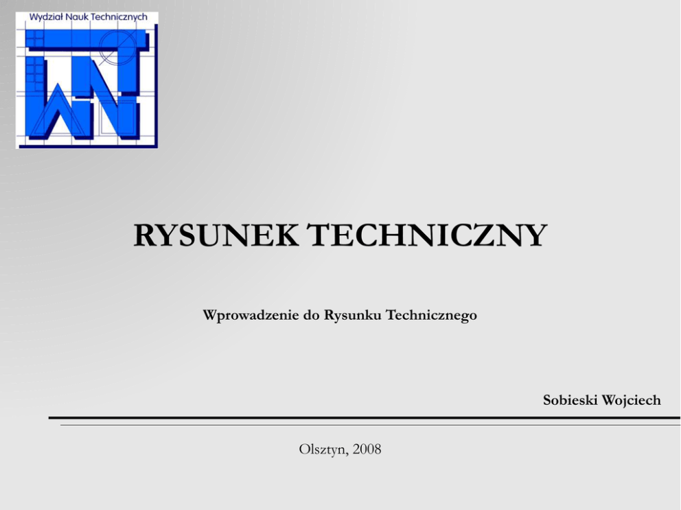 RYSUNEK TECHNICZNY Wprowadzenie do Rysunku Technicznego Sobieski Wojciech Olsztyn, 2008 Literatura Tematy wykładów: ● ● ● ● Wprowadzenie do Rysunku Technicznego Zapis geometrii w Rysunku Technicznym Wymiarowanie w Rysunku Technicznym Tolerowanie wymiarów oraz kształtu i położenia. Chropowatość powierzchni. Cykl powstał na podstawie: ● ● ● ● książki T. Dobrzańskiego „Rysunek Techniczny i Maszynowy” (wyd. 24) skryptu P. Bernata „Chropowatość Powierzchni w Rysunku Technicznym” autorskich ćwiczeń z Geometrii Wykreślnej i Rysunku Technicznego wybranych materiałów Internetowych Literatura UWAGA: Niektóre prezentowane tu informacje mogą być niezgodne z Polskimi Normami (jako już nieaktualne) – wynika to z faktu, że cykl oparto na ogólnie dostępnej literaturze (głównie książce T. Dobrzańskiego w wydaniu 24), a nie bezpośrednio na tekstach norm, które są płatne. Ze względu na znaczną cenę Polskich Norm nie będę wymagał od Studentów ich zakupu oraz znajomości zmian dokonujących się w Polskich Normach. Przyjmuję tu założenie, że podejście takie jest na cele dydaktyczne wystarczające. Rzutowanie prostokątne z widok z przodu widok z boku A'' A A''' x A' y widok z góry Rzutowanie prostokątne z widok z przodu widok z boku A'' A''' x A' y widok z góry y Rzutowanie prostokątne z widok z przodu widok z boku A''' A'' x y A' widok z góry y Rzutowanie prostokątne widok z przodu z widok z boku x y widok z góry y Rzutowanie prostokątne widok z przodu z widok z boku x y widok z góry y Rzutowanie prostokątne widok z przodu z widok z boku x y widok z góry y Rzutowanie prostokątne widok z przodu z widok z boku x y widok z góry y Rzutowanie prostokątne widok z przodu widok z dołu widok z prawej strony widok z góry widok z tyłu widok z lewej strony Przykład rzutowania europejskiego Rzutowanie prostokątne widok z przodu z widok z boku x y widok z góry y Rzutowanie prostokątne widok z przodu z widok z boku x y widok z góry y Rzutowanie prostokątne widok z przodu z widok z boku x y widok z góry y Rzutowanie prostokątne widok z przodu z widok z boku x y widok z góry y Rzutowanie prostokątne widok z przodu widok z dołu widok z prawej strony widok z góry widok z tyłu widok z lewej strony Przykład rzutowania europejskiego Rzutowanie europejskie i amerykańskie rzutowanie europejskie E (przedmiot jest między obserwatorem a rzutnią) rzutowanie amerykańskie A (rzutnia jest między obserwatorem a przedmiotem) Podstawowe definicje Rysunek techniczny – jest to informacja techniczna podana na nośniku informacji, przedstawiona graficznie zgodnie z przyjętymi zasadami i zwykle w podziałce. Szkic – jest to rysunek techniczny wykonany na ogół odręcznie i niekoniecznie w podziałce. Rysunek wykonawczy – jest to rysunek, na ogół opracowany na podstawie danych projektowych, zawierający wszystkie informacje potrzebne do wykonania. Rysunek złożeniowy – jest to rysunek przedstawiający wzajemne usytuowanie i/lub kształt zespołu na wyższym poziomie strukturalnym zestawianych części. Formaty arkuszy W rysunku technicznym maszynowym stosuje się standardowe i pochodne wymiary arkuszy papieru. formaty podstawowe Tabliczki rysunkowe Zwykle tylko część obszaru arkusza wypełniona jest przez rysunek. Zawsze pozostawia się pewien margines: 5 mm na formatach A3 oraz 7-10 mm na formatach większych. Papierowy oryginał rysunku powinien być dodatkowo zabezpieczony przed uszkadzaniem się krawędzi kalki. Tabliczki rysunkowe Tabliczka rysunkowa – rodzaj tabeli, w której zamieszczone są podstawowe informacje o rysunku: tytuł, numer podziałki; o projekcie, osobach projektujących i kreślących, o zmianach dokonanych na rysunku itp. Rozróżnia się tabliczki: • • • podstawowe (min. 185 × 55 mm) zmniejszone (min. 185 × 40 mm) uproszczone (min. 185 × 15 mm) Tabliczki należy umieszczać w dolnym prawym rogu arkusza. Tabliczki rysunkowe Tabliczki podstawowe – zawierające najwięcej informacji i przeznaczone do rysunków wykonawczych części oraz do rysunków złożeniowych, montażowych i ogólnowymiarowych. Tabliczki zmniejszone – o mniejszej ilości informacji, umieszczane na schematach i na pierwszych arkuszach dokumentów tekstowych (nie rysunków). Tabliczki uproszczone – o jeszcze mniejszej ilości informacji, umieszczane na drugich i dalszych arkuszach dokumentów tekstowych; tabliczki te wolno również umieszczać na drugich i dalszych arkuszach rysunków i schematów kilkuarkuszowych. Tabliczki rysunkowe Informacje podawane w tablice podstawowej grupować należy w trzech strefach A, B i C, które mogą być umieszczone jak na rysunku poniżej. B C B A C C B A A Na rysunkach złożeniowych tabliczkę rysunkową podstawową uzupełnia się umieszczonym nad nią wykazem części, zawierającym kolumny: numer, nazwa, ilość, oznaczenie, materiał i uwagi. Tabliczki rysunkowe Przykład tabliczki rysunkowej Rodzaje linii Rodzaje linii stosowanych na rysunkach: • • • • • • linia ciągła linia kreskowa linia punktowa linia dwupunktowa linia falista linia zygzakowa Rozróżnia się ponadto linie bardzo grube, grube oraz cienkie. Rodzaje linii Linia ciągła bardzo gruba służy do rysowania: • • połączeń lutowanych i klejonych (a i b) linii wykresowych a) b) Rodzaje linii Linia ciągła gruba służy do rysowania: • • • • • • a) widocznych krawędzi i wyraźnych zarysów przedmiotów w widokach i przekrojach (a) zarysów kładów przesuniętych (b) krótkich kresek oznaczających końce śladów płaszczyzn przekrojów i miejsc załamania tych płaszczyzn (c) zarysów powierzchni obrabianych na rysunkach operacyjnych i zabiegowych (d) linii obramowania arkusza linii wykresowych b) ` c) d) Rodzaje linii Linia ciągła cienka służy do rysowania: • • • • • • a) linii wymiarowych (a) pomocniczych linii wymiarowych (a) innych linii pomocniczych (b) kr