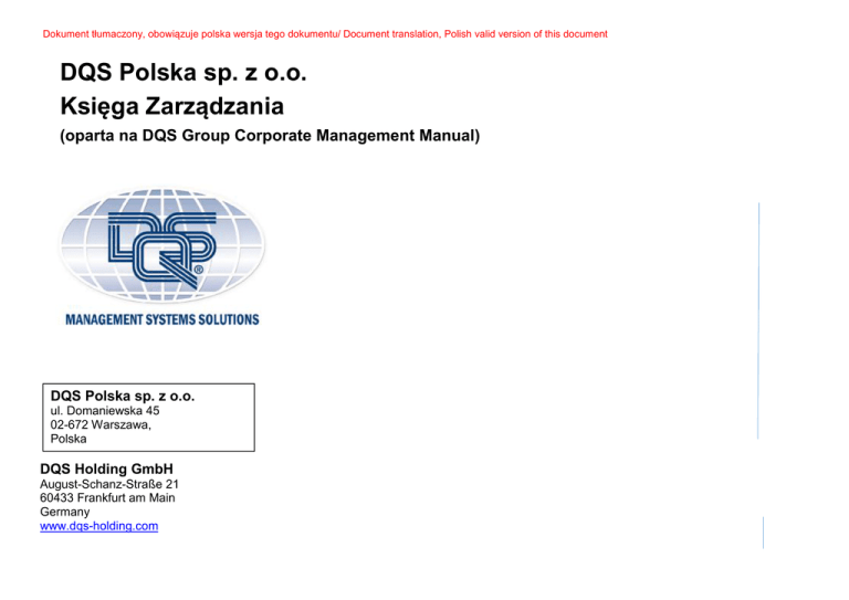 Dokument tłumaczony, obowiązuje polska wersja tego dokumentu/ Document translation, Polish valid version of this document DQS Polska sp. z o.o. Księga Zarządzania (oparta na DQS Group Corporate Management Manual) DQS Polska sp. z o.o. ul. Domaniewska 45 02-672 Warszawa, Polska DQS Holding GmbH August-Schanz-Straße 21 60433 Frankfurt am Main Germany www.dqs-holding.com Dokument tłumaczony, obowiązuje polska wersja tego dokumentu/ Document translation, Polish valid version of this document © 2016, DQS Holding GmbH, Frankfurt, Germany/ DQS Polska sp. z o.o., Warszawa, Polska Table of Contents FOREWORD GROUP PROFILE PART A: STRATEGY, LEADERSHIP, ORGANIZATION A.1 – External and internal issues A.2 – Interested parties and corporate policies A.3 - Corporate values A.4 – Vision, strategy and key indicators A.5 - Scope and Services A.6 - Organization and Structure A.7 - Communication A.8 - Management system A.9 - IQNet Network 8 8 157 17 20 22 26 29 34 PART B: DQS PROCESSES B.1 - Process map B.2 - Key processes B.3 - Management processes B.4 - Support processes 35 36 48 52 PART C: DOCUMENT MANAGEMENT 59 PART D: REMARKS 61 D.1 - Coverage D.2 - Personal designations D.3 - Terms D.4 - Readers’ comments D.5 - Management Manual CM 01 Księga Zarządzania (oparta na Corporate Management Manual DQS Group 2016-01-06) wydanie 09/2016 2/69 Dokument tłumaczony, obowiązuje polska wersja tego dokumentu/ Document translation, Polish valid version of this document Annex 1 Correspondence matrix: DQS Corporate Management Manual and ISO/IEC 17021-1 Annex 2 Correspondence matrix: DQS Corporate Management Manual and ISO 9001 Annex 3: List of Corporate Directives & Procedures CM 01 Księga Zarządzania (oparta na Corporate Management Manual DQS Group 2016-01-06) 64 66 68 wydanie 09/2016 3/69 Dokument tłumaczony, obowiązuje polska wersja tego dokumentu/ Document translation, Polish valid version of this document FOREWORD PRZEDMOWA This Corporate Management Manual provides a fundamental description of the global management system of DQS and introduces binding specifications in this respect at the Group level. It sets out rules and guidelines to be followed in the introduction, development, and improvement of management systems in companies under DQS Holding GmbH (DQS), branding under the name DQS. It also defines group-wide minimum requirements in terms of values, management, quality, occupational safety and health, environmental Korporacyjna Księga Zarządzania zapewnia podstawowy opis globalnego systemu zarządzania Grupy DQS oraz wprowadza wymagania w tym zakresie obowiązujące na poziomie Grupy. Księga ta przedstawia zasady i wytyczne, które są stosowane podczas wprowadzania, rozwoju i doskonalenia systemów zarządzania w DQS Holding GmbH (DQS), czy też pod nazwami DQS. Księga określa minimalne wymogi dla firm DQS pod względem wartości, zarządzania, jakości, higieny i bezpieczeństwa pracy, ochrony środowiska i spełnienia wymagań akredytacyjnych. This Manual and the requirements it sets out constitute binding instructions to all affected employees and partners of the DQS The companies involved are required to adopt these rules independently. They are intended to serve as a basis for the individual management systems manuals published by the companies that belong to the DQS. The Executive Board of DQS Holding GmbH Michael Drechsel CM 01 Księga Zarządzania (oparta na Corporate Management Manual DQS Group 2016-01-06) Niniejsza Księga, jak również jej wymagania, opisują ustanowione i obowiązujące instrukcje dotyczące wszystkich pracowników oraz partnerów DQS. Członkowie Grupy muszą przyjąć powyższe zasady i przenieść je do własnych systemów i dokumentacji systemu zarządzania. Zarząd DQS Holding GmbH Stefan Heinloth wydanie 09/2016 4/69 Dokument tłumaczony, obowiązuje polska wersja tego dokumentu/ Document translation, Polish valid version of this document Zarząd DQS Polska sp. z o.o. Prezes Zarządu Członek Zarządu Jacek Jan Pietrzak Włodzimierz A.Smolak CM 01 Księga Zarządzania (oparta na Corporate Management Manual DQS Group 2016-01-06) wydanie 09/2016 5/69 Dokument tłumaczony, obowiązuje polska wersja tego dokumentu/ Document translation, Polish valid version of this document Group Profile Profil grupy The founding of DQS (German Registrar for Management Systems) by DGQ (German Society for Quality) and DIN (German Institute for Standardization) in 1985 was the first step towards today’s DQS Group. Later, the German industry associations HDB, SPECTARIS, VDMA and ZVEI, and in 2008, the American product testing organization UL (Underwriters Laboratories) also became shareholders of the company. Powołanie DQS (Niemiecki Rejestrator Systemów Zarządzania) przez DGQ (Niemieckie Stowarzyszenie ds. Jakości) i DIN (Niemiecki Instytut Normalizacji) w 1985 roku stanowiło pierwszy krok w kierunku stworzenia dzisiejszej grupy Grupy DQS. Udziałowcami DQS są też Niemieckie Stowarzyszenia Przemysłowe HDB, SPECTARIS, VDMA i ZVEI oraz od 2008 amerykańska organizacja badań wyrobów UL (Underwriters Laboratories). DQS Holding GmbH, under which the companies of the DQS Group operate, is headquartered in Frankfurt/Main, Germany. Today, DQS is present globally with more than 75 offices in 55 countries. Among the major certification bodies, DQS is the only organization to focus entirely on the certification and assessment of management systems and processes in companies and organizations. DQS Holding GmbH ma siedzibę we Frankfurcie nad Menem w Niemczech. Obecnie, DQS z ponad 75 biurami w 55 krajach, ma zasięg globalny. Pośród głównych jednostek certyfikujących, DQS jest jedyną organizacją, która skupia się całkowicie na certyfikacji i ocenie procesów i systemów zarządzania w firmach i organizacjach. Approximately 2.500 employees including more than 2.300 auditors serve approximately 20.000 customers in more than 100 countries in all significant 
