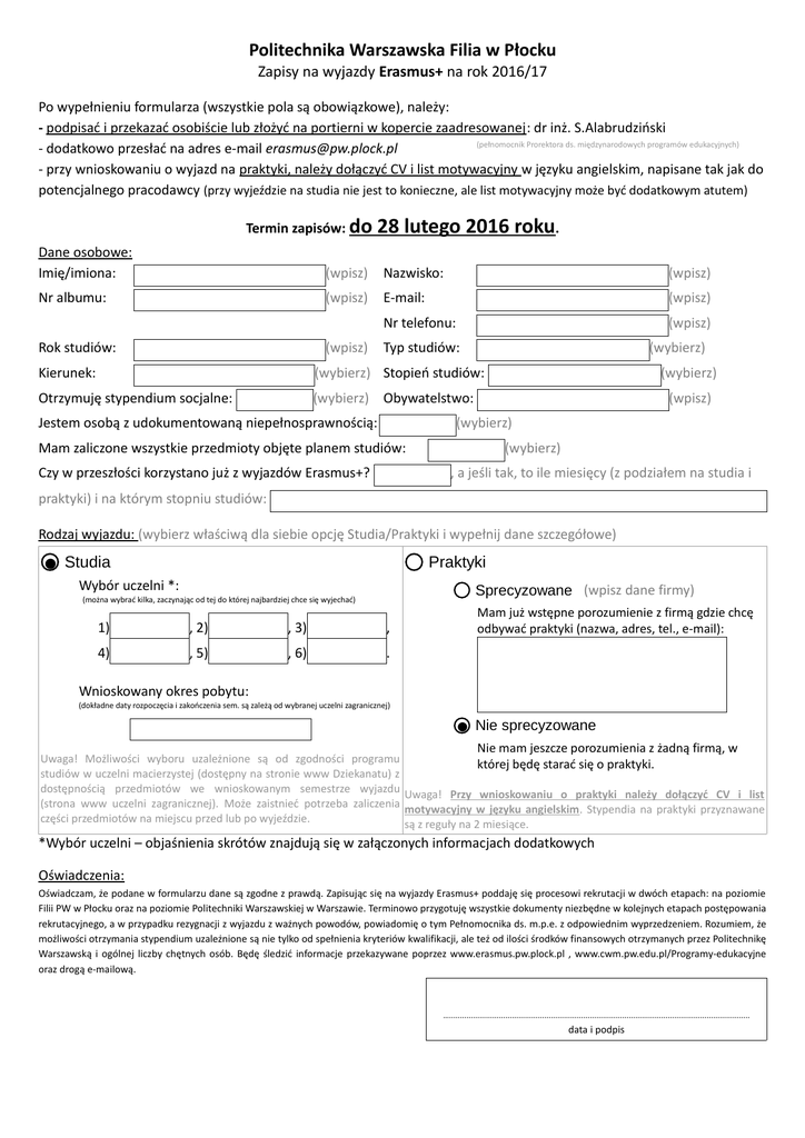 Politechnika Warszawska Filia w Płocku Zapisy na wyjazdy Erasmus+ na rok 2016/17 Po wypełnieniu formularza (wszystkie pola są obowiązkowe), należy: - podpisać i przekazać osobiście lub złożyć na portierni w kopercie zaadresowanej: dr inż. S.Alabrudziński (pełnomocnik Prorektora ds. międzynarodowych programów edukacyjnych) - dodatkowo przesłać na adres e-mail [email protected] - przy wnioskowaniu o wyjazd na praktyki, należy dołączyć CV i list motywacyjny w języku angielskim, napisane tak jak do potencjalnego pracodawcy (przy wyjeździe na studia nie jest to konieczne, ale list motywacyjny może być dodatkowym atutem) Termin zapisów: do 28 lutego 2016 roku. Dane osobowe: Imię/imiona: (wpisz) Nazwisko: (wpisz) Nr albumu: (wpisz) E-mail: (wpisz) Nr telefonu: (wpisz) Rok studiów: (wpisz) Typ studiów: (wybierz) Kierunek: (wybierz) Stopień studiów: Otrzymuję stypendium socjalne: (wybierz) Obywatelstwo: Jestem osobą z udokumentowaną niepełnosprawnością: (wybierz) (wpisz) (wybierz) Mam zaliczone wszystkie przedmioty objęte planem studiów: Czy w przeszłości korzystano już z wyjazdów Erasmus+? (wybierz) , a jeśli tak, to ile miesięcy (z podziałem na studia i praktyki) i na którym stopniu studiów: Rodzaj wyjazdu: (wybierz właściwą dla siebie opcję Studia/Praktyki i wypełnij dane szczegółowe) ● Studia Praktyki Wybór uczelni *: Sprecyzowane (wpisz dane firmy) (można wybrać kilka, zaczynając od tej do której najbardziej chce się wyjechać) 1) , 2) , 3) , 4) , 5) , 6) . Mam już wstępne porozumienie z firmą gdzie chcę odbywać praktyki (nazwa, adres, tel., e-mail): Wnioskowany okres pobytu: (dokładne daty rozpoczęcia i zakończenia sem. są zależą od wybranej uczelni zagranicznej) ● Nie sprecyzowane Nie mam jeszcze porozumienia z żadną firmą, w Uwaga! Możliwości wyboru uzależnione są od zgodności programu której będę starać się o praktyki. studiów w uczelni macierzystej (dostępny na stronie www Dziekanatu) z dostępnością przedmiotów we wnioskowanym semestrze wyjazdu Uwaga! Przy wnioskowaniu o praktyki należy dołączyć CV i list (strona www uczelni zagranicznej). Może zaistnieć potrzeba zaliczenia motywacyjny w języku angielskim. Stypendia na praktyki przyznawane części przedmiotów na miejscu przed lub po wyjeździe. są z reguły na 2 miesiące. *Wybór uczelni – objaśnienia skrótów znajdują się w załączonych informacjach dodatkowych Oświadczenia: Oświadczam, że podane w formularzu dane są zgodne z prawdą. Zapisując się na wyjazdy Erasmus+ poddaję się procesowi rekrutacji w dwóch etapach: na poziomie Filii PW w Płocku oraz na poziomie Politechniki Warszawskiej w Warszawie. Terminowo przygotuję wszystkie dokumenty niezbędne w kolejnych etapach postępowania rekrutacyjnego, a w przypadku rezygnacji z wyjazdu z ważnych powodów, powiadomię o tym Pełnomocnika ds. m.p.e. z odpowiednim wyprzedzeniem. Rozumiem, że możliwości otrzymania stypendium uzależnione są nie tylko od spełnienia kryteriów kwalifikacji, ale też od ilości środków finansowych otrzymanych przez Politechnikę Warszawską i ogólnej liczby chętnych osób. Będę śledzić informacje przekazywane poprzez www.erasmus.pw.plock.pl , www.cwm.pw.edu.pl/Programy-edukacyjne oraz drogą e-mailową. …........................................................................................................................................... data i podpis Zapisy na wyjazdy Erasmus+ na rok 2016/17 Informacje dodatkowe Kwalifikacja odbywa się raz w roku i dotyczy wyjazdów w kolejnym roku akademickim 2016/17 (semestr zimowy lub letni). O wyjazd mogą ubiegać się studenci z pełną rejestracją na studiach prowadzących do uzyskania stopnia/dyplomu licencjata, inżyniera, magistra i doktoranci (w ramach istniejących umów z uczelniami zagranicznymi). Pełna rejestracja oznacza m.in., że student ma zaliczone wszystkie przedmioty objęte programem studiów, a także, że ma pełne prawa studenckie (istotne szczególnie dla osób o innej narodowości niż polska). Warunkowo do kwalifikacji mogą zostać dopuszczone osoby, które nie mają zaliczonego jednego przedmiotu, ale przedstawią oświadczenie o możliwościach organizacyjnych uzyskania zaliczenia do dnia 1 maja 2016 roku, potwierdzone przez prowadzącego przedmiot i/lub inną osobę uprawnioną. Osoby, które spełniają warunki kwalifikacji mogą ubiegać się o wyjazd na studia lub na praktyki. Wyjazd na studia musi zawierać się w okresie objętym planem studiów, a w przypadku wyjazdu na praktyki okres ten jest przedłużony do 12 miesięcy po zakończeniu studiów. Zapisy potrwają od 11.01 do 28.02.2016 roku. W podanym czasie należy złożyć wypełniony i podpisany formularz osobiście (terminy konsultacji zostaną ogłoszone na stronie www.erasmus.pw.plock.pl) lub na Portierni gmachu przy ul. Jachowicza 2. Dodatkowo należy wysłać formularz na adres [email protected]. Plany studiów dostępne są pod adresem: WBMiP - http://www.pw.plock.pl/index.php/Studenci/Dziekanat-WBMiP/Plany-studiow KNES - http://www.pw.plock.pl/Studenci/Sekretariat-KNEiS/Plany-studiow Uczelnie zagraniczne do których można wnioskować wyjazd na studia: Skrót: UBI Nazwa uczelni: Universidade da Beira Interior Miejscowość: Covilhã, Portugalia www: www.ubi.pt Kierunki studiowania: Wszystkie kierunki WBMiP (5 osób/rok przez 1 semestr) Ekonomia (5 osób/rok przez 1 semestr) Skrót: Nazwa uczelni: Skrót: Nazwa uczelni: Miejscowość: www: Kierunki studiowania: Stopień studiów: Skrót: Nazwa uczelni: Miejscowość: www: Kierunki studiowania: Stopień studiów: UL University of Latvia Riga, Łotwa www.lu.lv/eng/istudents/exchange/ Ekonomia (2 osoby/rok przez 1 semestr) 1 Skrót: CULS Nazwa uczelni: Czech University of Life Sciences Miejscowość: Praha, Czechy www: www.czu.cz Kierunki studiowania: Wszystkie kierunki WBMiP (1 i 2 stopień - 1 osoba/rok przez 1 semestr) (3 stopie