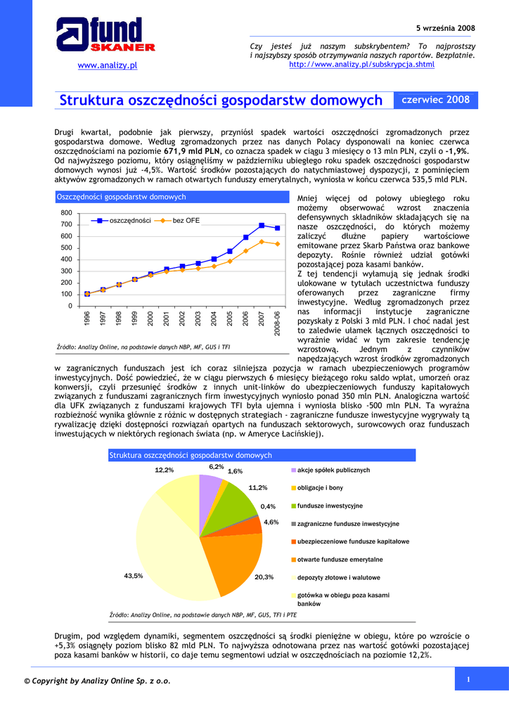 5 września 2008 Czy jesteś już naszym subskrybentem? To najprostszy i najszybszy sposób otrzymywania naszych raportów. Bezpłatnie. http://www.analizy.pl/subskrypcja.shtml www.analizy.pl Struktura oszczędności gospodarstw domowych czerwiec 2008 Drugi kwartał, podobnie jak pierwszy, przyniósł spadek wartości oszczędności zgromadzonych przez gospodarstwa domowe. Według zgromadzonych przez nas danych Polacy dysponowali na koniec czerwca oszczędnościami na poziomie 671,9 mld PLN, co oznacza spadek w ciągu 3 miesięcy o 13 mln PLN, czyli o -1,9%. Od najwyższego poziomu, który osiągnęliśmy w październiku ubiegłego roku spadek oszczędności gospodarstw domowych wynosi już -4,5%. Wartość środków pozostających do natychmiastowej dyspozycji, z pominięciem aktywów zgromadzonych w ramach otwartych funduszy emerytalnych, wyniosła w końcu czerwca 535,5 mld PLN. Oszczędności gospodarstw domowych 2008-06 2007 2006 2005 2004 2003 2002 2001 2000 1999 1998 1997 1996 Mniej więcej od połowy ubiegłego roku możemy obserwować wzrost znaczenia 800 defensywnych składników składających się na oszczędności bez OFE 700 nasze oszczędności, do których możemy 600 zaliczyć dłużne papiery wartościowe emitowane przez Skarb Państwa oraz bankowe 500 depozyty. Rośnie również udział gotówki 400 pozostającej poza kasami banków. 300 Z tej tendencji wyłamują się jednak środki 200 ulokowane w tytułach uczestnictwa funduszy oferowanych przez zagraniczne firmy 100 inwestycyjne. Według zgromadzonych przez 0 nas informacji instytucje zagraniczne pozyskały z Polski 3 mld PLN. I choć nadal jest to zaledwie ułamek łącznych oszczędności to wyraźnie widać w tym zakresie tendencję Źródło: Analizy Online, na podstawie danych NBP, MF, GUS i TFI wzrostową. Jednym z czynników napędzających wzrost środków zgromadzonych w zagranicznych funduszach jest ich coraz silniejsza pozycja w ramach ubezpieczeniowych programów inwestycyjnych. Dość powiedzieć, że w ciągu pierwszych 6 miesięcy bieżącego roku saldo wpłat, umorzeń oraz konwersji, czyli przesunięć środków z innych unit-linków do ubezpieczeniowych funduszy kapitałowych związanych z funduszami zagranicznych firm inwestycyjnych wyniosło ponad 350 mln PLN. Analogiczna wartość dla UFK związanych z funduszami krajowych TFI była ujemna i wyniosła blisko -500 mln PLN. Ta wyraźna rozbieżność wynika głównie z różnic w dostępnych strategiach - zagraniczne fundusze inwestycyjne wygrywały tą rywalizację dzięki dostępności rozwiązań opartych na funduszach sektorowych, surowcowych oraz funduszach inwestujących w niektórych regionach świata (np. w Ameryce Łacińskiej). Struktura oszczędności gospodarstw domowych 12,2% 6,2% akcje spółek publicznych 1,6% 11,2% 0,4% 4,6% obligacje i bony fundusze inwestycyjne zagraniczne fundusze inwestycyjne ubezpieczeniowe fundusze kapitałowe otwarte fundusze emerytalne 43,5% 20,3% depozyty złotowe i walutowe gotówka w obiegu poza kasami banków Źródło: Analizy Online, na podstawie danych NBP, MF, GUS, TFI i PTE Drugim, pod względem dynamiki, segmentem oszczędności są środki pieniężne w obiegu, które po wzroście o +5,3% osiągnęły poziom blisko 82 mld PLN. To najwyższa odnotowana przez nas wartość gotówki pozostającej poza kasami banków w historii, co daje temu segmentowi udział w oszczędnościach na poziomie 12,2%. © Copyright by Analizy Online Sp. z o.o. 1 5 września 2008 www.analizy.pl Czy jesteś już naszym subskrybentem? To najprostszy i najszybszy sposób otrzymywania naszych raportów. Bezpłatnie. http://www.analizy.pl/subskrypcja.shtml Mimo znacznie niższej dynamiki, największymi wygranymi w walce o oszczędności gospodarstw domowych w drugim kwartale 2008 roku wydają się być banki. W ich przypadku wzrost w ciągu 3 miesięcy wyniósł +2,6% co pozwoliło zwiększyć udział w oszczędnościach ogółem do poziomu 43,5%. To najwyższy wskaźnik od czerwca 2006, gdy udział bankowych depozytów oraz środków na rachunkach bieżących wynosił 43,7%. Ponad połowę z 292 mln PLN trzymanych w bankach stanowiły środki ulokowane na rachunkach bieżących (152,6 mln PLN), które odnotowały w skali 2 kwartału wzrost o +5,4%. To konsekwencja poszerzającej się oferty w zakresie kont oszczędnościowych, które do swojej oferty włącza coraz więcej banków i które spotykają się z coraz większym zainteresowaniem ze strony klientów. Jednak najszybszy wzrost w segmencie oszczędności bankowych odnotowaliśmy w przypadku depozytów z terminem zapadalności od 12 do 24 miesięcy, których wartość zwiększyła się o +10,5%. To z kolei rezultat aktywności, jaką na tym polu w walce o środki umożliwiające dalszy rozwój akcji kredytowej, podjęło kilka banków, oferując dla dwuletnich depozytów oprocentowanie na poziomie 8% rocznie. W przypadku pozostałych segmentów drugi kwartał przyniósł spadek zgromadzonych w nich środków. Największa zniżka stała się udziałem bezpośrednich inwestycji na rynku akcji, których wartość po spadku o -18% wyniosła według naszych szacunków 41,7 mld PLN. Dwucyfrowy spadek dotyczył również środków zgromadzonych przez osoby fizyczne w funduszach inwestycyjnych oferowanych przez krajowe TFI, które w ten sposób spadły na czwarte miejsce pod względem udziału w oszczędnościach ogółem. Tomasz Publicewicz Analizy Online Spółka Analizy Online jest niezależną firmą analityczną zajmującą się monitoringiem rynku polskich i zagranicznych instytucji zbiorowego lokowania środków: funduszy inwestycyjnych, emerytalnych oraz ubezpieczeniowych funduszy kapitałowych). W zakres analiz rynku funduszy wchodzą między innymi rankingi funduszy, ocena efektywności działań zarządzających oraz analiza ich wpływu na polski rynek finansowy. Zakres działalności firmy obejmuje również monitoring rynku produktów strukturyzowanych, zmian akcj