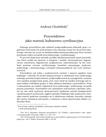 Studia Gdańskie. Wizje i rzeczywistość, t. XI Andrzej Chodubski∗ Przywództwo jako wartość kulturowo-cywilizacyjna Pojmując przywództwo jako zdolność podporządkowania jednostek, grup i organizacji, kierowania ich zachowaniami oraz odnosząc termin ten do procesu dziejowego, zauważa się, że jest on fundamentalną instytucją polityczną, która wywiera przemożny wpływ na kształt życia kulturowego i cywilizacyjnego1. W procesie dziejowym ujawniło się kilka charakterystycznych typów przywództwa, które zwykło się ujmować w kategorie i modele: charyzmatyczne, hegemoniczne, autorytarne, dogmatyczne, pragmatyczne, reprezentacyjne. Są one wynikiem poziomu rozwoju cywilizacyjnego, kontekstu sytuacyjnego, społecznopolitycznego i ekonomicznego, rozwiązań instytucjonalnych oraz cech osobowościowych. Przywództwo jest jedną z podstawowych wartości i stanowi regulator życia ludzkiego1. Człowiek od zarania funkcjonowania w strukturach życia społecznego, realizując potrzebę bezpieczeństwa, podporządkowywał się wymaganiom, normom oraz zasadom postępowania grupy, przy czym starał się uzyskać przewagę nad innymi ludźmi (członkami grupy) w imię zdobycia dominacji i przywództwa. Wraz z umacnianiem się struktur organizacji życia społecznego i politycznego wzrastała pozycja przywódcy. Przywództwo jest naturalnym zachowaniem człowieka: ujawnia się ono obok zachowań ekonomicznych (spełnienie potrzeb biologicznych) i prokreacyjnych (zachowanie ciągłości gatunku ludzkiego) jako podstawowa naturalna wartość społeczna wyrażająca się w zdobywaniu zaufania, szacunku, uznania dla czynów, dominacji nad innymi, a zwłaszcza w sferze sprawowania władzy i zyskiwania sławy. ∗ Prof. dr hab. Andrzej Chodubski, Uniwersytet Gdański, Gdańsk e-mail: [email protected] 1 Por. M. G. Hermann, Elementy przywództwa, [w:] Władza i społeczeństwo, wyb., oprac. J. Szczupaczyński, Warszawa 1998, t. 2, s. 297–313. 1 Por. B. Kaczmarek, Przywództwo polityczne a przywództwo organizacyjne, [w:] Przywództwo polityczne, red. T. Bodio, Warszawa 2001, s. 50–96 Andrzej Chodubski W procesie dziejowym najstarszy model przywództwa wyznaczały tzw. cechy charyzmatyczne2. Uznawano, że przywództwo zdobywały jednostki wyróżniające się w społecznościach rzadkimi umiejętnościami, zdolnościami, temperamentem; te rzadkie cechy zwane charyzmą wynikały z objawienia, mocy magicznych, bohaterstwa, nadzwyczajnych umiejętności. W charyzmatycznym modelu wyróżnić można typy: mityczny, sakralny (proroczy), wodzowski, władczy, przewodniczy. Model charyzmatyczny przywództwa sytuuje się szczególnie w sferze życia politycznego, jako że (…) charyzmat ma oznaczać uchodzącą za niepowszednią (pierwotnie zarówno u proroków, jak i u mędrców obeznanych z lecznictwem lub z prawem u przewodników na polowaniach i bohaterów wojennych, uwarunkowaną magicznie) właściwość pewnej jednostki, dzięki której jednostka ta uchodzi za obdarzoną nadprzyrodzonymi czy też nadludzkimi lub co najmniej specyficznie niepowszednimi, nie każdemu dostępnymi siłami i cechami i traktowana jest albo jako zesłana od Boga, albo jako wzór dla innych, a więc jako „wódz”3. Przywódca charyzmatyczny cieszy się niezwykłym posłuchem, co jest konsekwencją uznania, respektu, podziwu, fascynacji, adoracji; cechy te skłaniają innych do okazywania mu zaufania (wiara weń) i przyznania mandatu do działania. Ten model ujawnia się w nadzwyczajnych okolicznościach, zwłaszcza w sytuacji oczekiwania na proroka, zbawcę, przewodnika, męża opatrznościowego. Ważne w nim są: umiejętności autokreacji, w tym głoszenie poczucia posłannictwa i tworzenie przy tym aureoli tajemniczości, mistyki; powołanie opatrznościowe, szczególne posłannictwo; ujawnienie wysokich ambicji, samooceny, znaczenia walorów osobistych. W ujawnianiu się modelu przywództwa charyzmatycznego ważną rolę spełnia metodologia grecka i rzymska4. Zgodnie z wierzeniami starożytnych Greków i Rzymian światem rządziły duchy, które wyobrażano antropomorficznie. Uznawano, że są między nimi związki, a nawet pokrewieństwa. Z punktu widzenia przywództwa w mitologii greckiej szczególną rolę pełnił Zeus, zaś w rzymskiej Jowisz. Żoną Zeusa była Hera – opiekunka małżeństwa i rodziny, a jej rzymską odpowiedniczką – Junona. Zeusa postrzegano jako władcę wszechświata podlegającego jedynie Przeznaczeniu, przywódcę Opatrznościowego utrzymującego porządek i sprawiedliwość, czuwającego nad zachowywaniem norm hierarchii społecznej. W sprawowaniu władzy musiał toczyć walki z licznymi nieprawościami współrządzących, przy czym nierzadko posługiwał się bardzo surowymi karami. 2 M. Karwat, Charyzma i pseudocharyzma, [w:] Przywództwo polityczne…, s. 126–175. Cyt. za: Ibidem, s. 127. 4 Por. K. Kumaniecki, Historia starożytnej Grecji i Rzymu, Warszawa 1967; J. Parandowski, Mitologia, Warszawa 1967; P. Grimal, Słownik mitologii greckiej i rzymskiej, Wrocław – Warszawa – Kraków – Gdańsk – Łódź 1987; Z. Kubiak, Mitologia Greków i Rzymian, Warszawa 2001. 3 10 Przywództwo jako wartość kulturowo-cywilizacyjna W Rzymie, w okresie rozwoju i utrwalenia się struktury politycznej państwa ważne miejsce zajmował Jowisz. Postrzegano go jako najwyższy organ rządzący, źródło wszelkiej władzy. W okresie rządów republikańskich panujący wznosili do niego modły przy obejmowaniu urzędów, składali mu triumfalne wieńce, poświęcali rytualne ofiary (białe byki). Uznawano go za gwaranta dotrzymywania układów. W okresie cesarstwa władcy oddawali się jego opiece; np. pierwszy cesarz rzymski August (27 r. p.n.e.–14 r. n.e.) utrzymywał, że Jowisz zsyła mu sny i chroni przed nieszczęściami. W podzięce zbudował mu na Kapitolu świątynię. Wierzenia powodowały, że zarówno w Grecji, jak i Rzymie wyrazem kultu było składanie ofiar; n