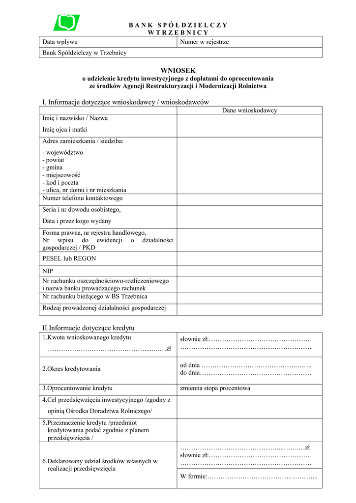 wniosek ARiMR - Bank Spółdzielczy w Trzebnicy