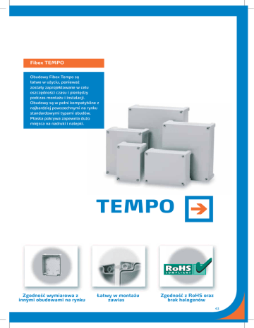 Fibox TEMPO Obudowy Fibox Tempo są łatwe w użyciu, ponieważ zostały zaprojektowane w celu oszczędności czasu i pieniędzy podczas montażu i instalacji. Obudowy są w pełni kompatybilne z najbardziej powszechnymi na rynku standardowymi typami obudów. Płaska pokrywa zapewnia dużo miejsca na nadruki i nalepki. TEMPO Zgodność wymiarowa z innymi obudowami na rynku Łatwy w montażu zawias Zgodność z RoHS oraz brak halogenów 43 TEMPO ABS 1912 187 x 122 ABS: IP 65, IK 07 Zawiera: podstawę z uszczelką z poliuretanu, śruby do montażu płyty/szyny DIN, pokrywę ze śrubami z poliamidu oraz zawiasy z tworzywa. Obudowy Symbol Kod Wymiar w mm Opis TA191209 TA191209T 5814000 5814005 187 x 122 x 90 187 x 122 x 90 Obudowa ABS • Pokrywa szara Obudowa ABS • Pokrywa przezroczysta Symbol Kod Wymiar w mm Opis MP 1912 MIV 10 DH-3 FP 10674 DPS 14553 5518022 5514082 8524032 5510674 6300006 140 x 100 35 x 100 35 x 140 Płyta montażowa Szyna DIN 35 Szyna DIN 35 Zestaw uchwytów do wieszania obudów • 2 szt., zawiera śruby Zatyczka ozdobna do śruby pokrywy • Szara, zestaw 40 szt Akcesoria 122.2 112.1 98 65 41 Ø4 KN 3.9x9.5 89.9 63.9 .5 6.4 82.7 91 80 163 177.1 187.2 136 84 130 75.2 45 2xM20 Knock out 44 Rysunki CAD dostępne na stronie www.fibox.pl 2 TEMPO ABS 2016 201 x 163 ABS: IP 65, IK 07 Zawiera: podstawę z uszczelką z poliuretanu, śruby do montażu płyty/szyny DIN, pokrywę ze śrubami z poliamidu oraz zawiasy z tworzywa. Obudowy Symbol Kod Wymiar w mm Opis TA201610 TA201610T 5814001 5814006 201 x 163 x 98 201 x 163 x 98 Obudowa ABS • Pokrywa szara Obudowa ABS • Pokrywa przezroczysta Symbol Kod Wymiar w mm Opis MP 2016 DH-3 ARH 2320 FP 10674 DPS 14553 5518023 8524032 9822005 5510674 6300006 155 x 140 35 x 140 35 x 180 Płyta montażowa Szyna DIN 35 Szyna DIN 35 Zestaw uchwytów do wieszania obudów • 2 szt., zawiera śruby Zatyczka ozdobna do śruby pokrywy • Szara, zestaw 40 szt Akcesoria 163.2 152.9 113.2 108 89 Ø 4. 2 KN3.9x9.5 65 6 98.4 72.4 100 130 136 149 168 180.8 190.9 201.2 110 130 91.1 150 80 60.0 100 2 83.6 2xM20 knock out Rysunki CAD dostępne na stronie www.fibox.pl 45 TEMPO ABS 2419 240 x 191 ABS: IP 65, IK 07 Zawiera: podstawę z uszczelką z poliuretanu, śruby do montażu płyty/szyny DIN, pokrywę ze śrubami z poliamidu oraz zawiasy z tworzywa. Obudowy Symbol Kod Wymiar w mm Opis TA241911 TA241911T 5814002 5814007 240 x 191 x 107 240 x 191 x 107 Obudowa ABS • Pokrywa szara Obudowa ABS • Pokrywa przezroczysta Symbol Kod Wymiar w mm Opis MP 2419 EKV 12 DR 210 FP 10674 DPS 14553 5518024 3770647 5518027 5510674 6300006 210 x 160 35 x 160 35 x 210 Płyta montażowa Szyna DIN 35 Szyna DIN 35 Zestaw uchwytów do wieszania obudów • 2 szt., zawiera śruby Zatyczka ozdobna do śruby pokrywy • Szara, zestaw 40 szt Akcesoria 2 4. Ø 191 178.5 139.8 130 80 KN 3.9x9.5 107.4 81.4 6 99.6 140 151 125 150 184 219 227.5 240 92.1 144 120 200 90 100 138 2xM20 knock out 46 Rysunki CAD dostępne na stronie www.fibox.pl 2.5 TEMPO ABS 2924 289 x 239 ABS: IP 65, IK 07 Zawiera: podstawę z uszczelką z poliuretanu, śruby do montażu płyty/szyny DIN, pokrywę ze śrubami z poliamidu oraz zawiasy z tworzywa. Obudowy Symbol Kod Wymiar w mm Opis TA292411 TA292411T 5814003 5814008 289 x 239 x 107 289 x 239 x 107 Obudowa ABS • Pokrywa szara Obudowa ABS • Pokrywa przezroczysta Symbol Kod Wymiar w mm Opis MP 2924 DR 215 DR 265 FP 10674 DPS 14553 5518025 5518029 5518028 5510674 6300006 265 x 215 35 x 215 35 x 265 Płyta montażowa Szyna DIN 35 Szyna DIN 35 Zestaw uchwytów do wieszania obudów • 2 szt., zawiera śruby Zatyczka ozdobna do śruby pokrywy • Szara, zestaw 40 szt Akcesoria Ø 239 226.5 187.8 161 138 4. 2 6 107.4 KN3.9x9.5 81.4 2.5 120 99.6 205 289 268 277.9 221 255 200 125 120 92.1 2xM20 knock out Rysunki CAD dostępne na stronie www.fibox.pl 47 TEMPO ABS 3429 344 x 289 ABS: IP 65, IK 07 Zawiera: podstawę z uszczelką z poliuretanu, śruby do montażu płyty/szyny DIN, pokrywę ze śrubami z poliamidu oraz zawiasy z tworzywa. Obudowy Symbol Kod Wymiar w mm Opis TA342912 TA342912T 5814004 5814009 344 x 289 x 117 344 x 289 x 117 Obudowa ABS • Pokrywa szara Obudowa ABS • Pokrywa przezroczysta Symbol Kod Wymiar w mm Opis MP 3429 ARH 2328 DR 316 FP 10674 DPS 14553 5518026 9822012 5518030 5510674 6300006 315 x 265 35 x 260 35 x 316 Płyta montażowa Szyna DIN 35 Szyna DIN 35 Zestaw uchwytów do wieszania obudów • 2 szt., zawiera śruby Zatyczka ozdobna do śruby pokrywy • Szara, zestaw 40 szt Akcesoria 2 125 6 KN3.9x9.5 161 185 202 235 250 2xM20 knock out 48 117.4 91.4 109.6 120 125 202 221 235 250 285 306 320 331.3 344 4. 200 Ø 289 277.9 237.8 125 Rysunki CAD dostępne na stronie www.fibox.pl 102.1 2.5 AKCESORIA Symbol Kod Opis Płyty montażowe (stal ocynkowana, grubość płyty 1,5 mm) MP 1912 MP 2016 MP 2419 MP 2924 MP 3429 5518022 5518023 5518024 5518025 5518026 140 x 100 155 x 140 210 x 160 265 x 215 315 x 265 Szyny montażowe DIN-35 (stal ocynkowana, wysokość szyny 7,5 mm) MIV 10 DH-3 EKV 12 DR 210 DR 215 ARH 2328 DR 265 DR 316 5514082 8524032 3770647 5518027 5518029 9822012 5518028 5518030 35 x 100 35 x 140 35 x 160 35 x 210 35 x 215 35 x 260 35 x 265 35 x 316 Zawiasy i uchwyty do wieszania obudów TH T FP 10674 FEP 26150 5510021 Zestaw zawiasów 5510674 Zestaw uchwytów do wieszania obudów • 2 szt., zawiera śruby 7366150 Zaślepka otworu do montażu naściennego w podstawie. Śruby pokrywy MBS HH MBS 18020 6300004 Śruby pokrywy, zestaw • Tylko dla rozmiaru 1912 5510020 Śruby pokrywy, szare, zestaw 4szt. Nasadki motylkowe i zatyczki ozdobne MBS 14552 DPS 14553 6300005 Nasadka motylkowa na śrubę • Szara, zestaw 40 szt 6300006 Zatyczka ozdobna do śruby pokrywy • Szara, zestaw 40 szt Elementy dystansowe i śruby montażowe TS H15 SET TS H30 SET KN 3.9x9.5-10 SET 5510031 Zestaw elementów dystansowych • do płyty montażowej M4/15mm, 4 szt. 5510032 Zestaw elementów dystansowych • do płyty montażowej M4/30mm, 4 szt. 5