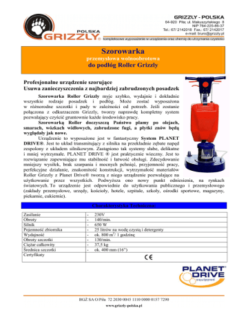 Szorowarka przemysłowa wolnoobrotowa do podłóg Roller Grizzly Profesjonalne urządzenie szorujące Usuwa zanieczyszczenia z najbardziej zabrudzonych posadzek Szorowarka Roller Grizzly myje szybko, wydajnie i dokładnie wszystkie rodzaje posadzek i podłóg. MoŜe zostać wyposaŜona w róŜnorodne szczotki i pady w zaleŜności od potrzeb. Jeśli zostanie połączona z odkurzaczem Grizzly, tworzy naprawdę kompletny system pozwalający czyścić gruntownie kaŜde środowisko pracy. Szorowarką Roller doczyszczą Państwo plamy po olejach, smarach, wózkach widłowych, zabrudzone fugi, a płytki znów będą wyglądały jak nowe. Urządzenie to wyposaŜone jest w fantastyczny System PLANET DRIVE®. Jest to układ transmitujący z silnika na przekładnie zębate napęd zespolony z układem silnikowym. Zastąpiono tak systemy słabe, delikatne i mniej wytrzymałe. PLANET DRIVE ® jest praktycznie wieczny. Jest to rozwiązanie zapewniające mu stabilność i łatwość obsługi. Zdecydowanie mniejszy wysiłek, brak szarpania i mocnych pchnięć, przyjemność pracy, perfekcyjne działanie, znakomitość konstrukcji, wytrzymałość materiałów Roller Grizzly z Planet Drive® tworzą z niego urządzenie pozwalające na uŜytkowanie przez wszystkich. PodwyŜsza ono nowy punkt odniesienia, na rynkach światowych. To urządzenie jest odpowiednie do uŜytkowania publicznego i przemysłowego (zakłady przemysłowe, urzędy, kościoły, hotele, szpitale, szkoły, ośrodki sportowe, magazyny, piekarnie, cukiernie). Charakterystyka Techniczna: Zasilanie Obroty Silnik Pojemność zbiornika Wydajność Obroty szczotki CięŜar całkowity Średnica szczotki Certyfikaty - 230V 140/min. 650 W 25 litrów na wodę czystą i detergenty ok. 800 m2/ 1 godzinę 130/min. 37,5 kg ok. 400 mm (16”) WyposaŜenie dodatkowe do szorowarki Roller Grizzly: - SZCZOTKA NYLONOWA Ø 384 - zalecana KOD 58.03 - SZCZOTKA KARBONOWA Ø 384 - SZCZOTKA Z WŁOSEM STALOWYM POKRYTYM MIEDZIĄ Ø 384 58.10 - SZCZOTKA Z WŁOSEM STALOWYM OSTRYM Ø 384 58.11 - UCHWYT DO PADÓW Ø 384 58.02