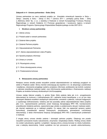 Załącznik nr 4 - Umowa partnerstwa – Solec Zdrój Umowa partnerstwa na rzecz realizacji projektu pn. „Kompleks mineralnych basenów w Solcu – Zdroju”, zawartej w Solcu - Zdroju w dniu 7 czerwca 2011 r. pomiędzy gminą Solec – Zdrój a „Malinowy Zdrój” Sp. z o.o. z siedzibą w Krakowie w ramach Europejskiego Funduszu Rozwoju Regionalnego w ramach Działania 2.3 Promocja gospodarcza i turystyczna regionu w ramach Regionalnego Programu Operacyjnego Województwa Świętokrzyskiego na lata 2007-2013. I. Struktura umowy partnerskiej § 1. Zakres umowy § 2. Podział zadań w ramach partnerstwa § 3. Zadania lidera projektu § 4. Zadania Partnera projektu § 5. Odpowiedzialność Partnerów § 6-7. Zakres odpowiedzialności Lidera Projektu § 8. Sposób przepływu informacji § 9. Zmiany w umowie § 10. Rozwiązanie umowy § 11. Okres obowiązywania umowy § 12. Postanowienia końcowe II. Streszczenie umowy partnerstwa Niniejsza umowa określa przede wszystkim podział odpowiedzialności za realizację przyjętych na siebie w Projekcie zadań. Strony również zobowiązują się wspólnie m.in. do aktywnego uczestnictwa i współpracy, stosowania przyjętego systemu przepływu informacji, poddawania się kontroli, audytowi w zakresie prawidłowej realizacji zadań, oraz informowania społeczeństwa o finansowaniu realizacji Projektu ze środków funduszy strukturalnych Unii Europejskiej. Umowa nadaje liderowi projektu, tj. gminie Solec Zdrój zadania takie jak m.in.: przygotowanie dokumentacji do konkursu o dofinansowanie UE i pełnienie funkcji beneficjenta, a co za tym idzie obowiązek składania wszelkich niezbędnych dokumentów, wniosków o płatność, rozliczeń księgowych z uzyskanego dofinansowania. Ustalony jest też pozostały zakres odpowiedzialności lidera projektu jako m.in.: reprezentowanie partnerów przed Instytucją Zarządzającą RPO WS, koordynowanie prawidłowości działania partnera, zapewnienie jego udziału w podejmowaniu decyzji i realizacji zadań, jak również wspieranie go w realizacji projektu. Co więcej, lider ma zapewniać sprawny system komunikacji, prawidłowość operacji finansowych, pozyskiwania, gromadzenia i archiwizacji dokumentacji, a także informowania Instytucji Zarządzającej RPO WS o ewentualnych problemach w realizacji. Z drugiej strony umowa określa zadania i obowiązki partnera projektu. Obejmują one przede wszystkim ponoszenie kosztu wybudowania, utrzymania i eksploatacji obiektu. Według umowy obiekt ma zostać wybudowany zgodnie z projektem i łączącą strony umową koncesji na roboty budowlane, oraz z należytą starannością. Całość wydatków ma być ponoszona w sposób udokumentowany, celowy, rzetelny, racjonalny, oszczędny, a także zgodnie z obowiązującymi przepisami prawa i zapisami umowy koncesyjnej. Strony, ustaliły w umowie również sposób przepływu informacji, wg którego wszelkie zawiadomienia, zapytania oraz informacje odnoszące się lub wynikające z realizacji projektu wymagać będą formy pisemnej, z wyjątkiem sytuacji gdy umowa o koncesji na roboty budowlane wymaga lub dopuszcza inną formę. Strony ustaliły również, że wszelkie zmiany, uzupełnienia, oraz rozwiązanie niniejszej urnowy wymagają formy pisemnej pod rygorem nieważności. Zaznaczono, że zmiany mogą wynikać w szczególności ze zmiany do zawartej miedzy stronami umowy koncesji na roboty budowlane. Natomiast zmiany, które skutkowałyby koniecznością wprowadzenia zmian w umowie o dofinansowanie mogą zostać wprowadzone wyłącznie w sposób umożliwiający zachowanie terminów określonych w umowie o dofinansowanie. Z kolei, rozwiązanie umowy może nastąpić przed terminem w przypadku rozwiązania lub odstąpienia od umowy koncesji. Na końcu określono, że spory będą przez strony rozstrzygane w drodze wzajemnych negocjacji lub przez mediatora, a w przypadku jeśli nie uda się osiągnąć w ten sposób porozumienia - w drodze sądowej.