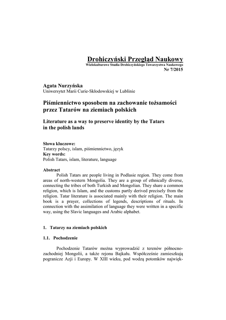 Drohiczyński Przegląd Naukowy Wielokulturowe Studia Drohiczyńskiego Towarzystwa Naukowego Nr 7/2015 Agata Nurzyńska Uniwersytet Marii Curie-Skłodowskiej w Lublinie Piśmiennictwo sposobem na zachowanie tożsamości przez Tatarów na ziemiach polskich Literature as a way to preserve identity by the Tatars in the polish lands Słowa kluczowe: Tatarzy polscy, islam, piśmiennictwo, język Key words: Polish Tatars, islam, literature, language Abstract Polish Tatars are people living in Podlasie region. They come from areas of north-western Mongolia. They are a group of ethnically diverse, connecting the tribes of both Turkish and Mongolian. They share a common religion, which is Islam, and the customs partly derived precisely from the religion. Tatar literature is associated mainly with their religion. The main book is a prayer, collections of legends, descriptions of rituals. In connection with the assimilation of language they were written in a specific way, using the Slavic languages and Arabic alphabet. 1. Tatarzy na ziemiach polskich 1.1. Pochodzenie Pochodzenie Tatarów można wyprowadzić z terenów północnozachodniej Mongolii, a także rejonu Bajkału. Współcześnie zamieszkują pogranicze Azji i Europy. W XIII wieku, pod wodzą potomków najwięk- 328 Agata Nurzyńska szego z władców mongolskich, Czyngis – chana, rozpoczęli podbój świata. Wraz z upadkiem imperium mongolskiego wyodrębniło się kilka państw w zachodniej jego części (m.in. Złota Orda, Chanat Kazański, Chanat Krymski). Na tereny litewskie, a potem także polskie sprowadził ich książę Witold w XV wieku. Osiedlali się głównie w okolicach Wilna, Trok, Grodna i Kowna, a od XVII wieku także w Koronie, szczególnie na Wołyniu i Podolu, a u schyłku wieku na Suwalszczyźnie. Na samo Podlasie trafili za sprawą Jana III Sobieskiego w 1679 roku, który nadał im ziemie pod Sokółką i Krynkami. Zasiedlili w dalszej kolejności wsie: Bohoniki, Drahle, Malawicze Górne, Lebiedziewo, Studziankę, Małaszewice, Kruszyniany, Łużany, Ortel i Ossowę. Zazwyczaj ziemie te stanowiły nagrody za zasługi w walkach wewnętrznych m. in. Ze Stanisławem Leszczyńskim. Z biegiem lat zwiększała się liczba osad tatarskich. Zbudowali meczety w Malawiczach (nieistniejący już), Bohonikach, Kruszynianach i Studziance (również nieistniejący), a przy nich zakładano mizary, czyli tatarskie cmentarze1. Mimo posiadania praw szlacheckich społeczność tatarska nie była dopuszczona do życia politycznego. W każdym powiecie czy województwie mieli swojego reprezentanta, który miał zwoływać ich na pospolite ruszenie, a faktycznie był ich przywódcą. W XIX wieku, po powstaniu listopadowym i styczniowym, wielu Tatarów utraciło swe ziemie i domostwa. Część z nich została przejęta przez chrześcijan, część natomiast uległa zniszczeniu i dewastacji. 1.2. Współczesność Szacuje się, iż w Polsce mieszka obecnie około 2.500-3.000 osób z rodowodem tatarskim, w gminie bohonickiej jest około 600 członków, natomiast w kruszyniańskiej – 70. Łącznie na całej białostoczczyźnie żyje około 1.800 członków tatarskiej wspólnoty wyznaniowej2. Dane te są dość problematyczne, ponieważ opierają się wyłącznie na spisach gmin wyznaniowych, w których można wyróżnić trzy grupy Tatarów. Pierwszą są zasiedziali mieszkańcy Bohonik, Kruszynian i okolic, kolejną muzułmanie osiadli w innych miastach i regionach po migracji z ZSRR w 1945 roku, a ostatnią rodziny wywodzące się z dawnych skupisk tatarskich, które prze1 Zob. J. Tyszkiewicz, Tatarzy na Litwie i w Polsce. Studia z dziejów XIII-XVIII w., Warszawa 1989, s. 5. 2 Zob. W. Pałubicki, Etniczni – religijna mniejszość Tatarów polskich. Tradycja i przemiany, W: Meandry cywilizacyjne, kwestie narodowościowe i polonijne, red. A. Chodubski, Toruń 1996, s. 81. Piśmiennictwo sposobem na zachowanie tożsamości przez Tatarów… 329 chowują świadomość pochodzenia, jednak bez związków z islamem. Trzecia grupa, z uwagi na to, iż często żyje w rozproszeniu, może zaniżać statystyki, gdyż zazwyczaj nie jest brana pod uwagę przy spisach ludności. Problematyczne jest także miejsce jej miejsce wśród Tatarów. Jak pisze K. Warmińska na tożsamość Tatarów polskich składają się zarówno tatarskość jak i polskość, ale przede wszystkim muzułmańskość, która pozwoliła na przetrwanie tej mniejszości narodowościowej w tym rejonie. Aktualnie wśród członków białostockiego okręgu wyznaniowego wyróżnia się dwie opcje religijne: tradycyjną i reformatorską. Zwolennicy pierwszej, tradycyjnej wierzą, że islam tatarski, a zwłaszcza islam Tatarów polskich, jest prawomyślny i w związku z tym, że przez wieki nie uległ znaczącej zmianie zasługuje na uznanie go. Natomiast opcja reformatorska dąży do oczyszczenia religii ze wszystkich odchyleń, zbliżenia do islamu wyznawanego w krajach arabskich, często poprzez kontakt z muzułmanami z tych krajów, a także powierzanie im prowadzenia zajęć dydaktycznych z religii dla członków gmin wyznaniowych3. 2. Język Tatarów polskich Cechą charakterystyczną społeczeństwa Tatarów polskich jest także język jakim się posługują i posługiwali na przestrzeni wieków. Jako przybysze ze Złotej Ordy, osiedlający się na terenach polskich i litewskich, posługiwali się oni językiem z grupy kipczackiej, rodziny turkijskiej. O takim pochodzeniu mogą świadczyć dawne nazwy rodowe i zachowane resztki tytulatury. Przykład może stanowić tytuł książęcy ułan, będący kipczacką formą, pochodzącą z innego z języków turkijskich oghfan, który jako rzeczownik pospolity oznacza „chłopca, junaka”, natomiast w przypadku użycia go po imieniu własnym, stanowi tytuł nadawany książętom krwi. Ponadto do XVII wieku nadal posługiwali się kipczackimi imionami, w których skład wchodziły tureckie formy czasownikowe berdi i keldi4. Należy z