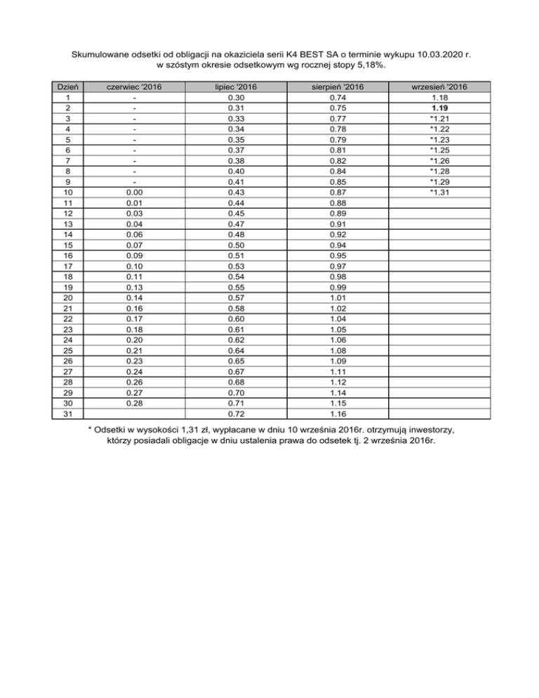 Skumulowane odsetki od obligacji na okaziciela serii K4 BEST SA o terminie wykupu 10.03.2020 r. w szóstym okresie odsetkowym wg rocznej stopy 5,18%. Dzień 1 2 3 4 5 6 7 8 9 10 11 12 13 14 15 16 17 18 19 20 21 22 23 24 25 26 27 28 29 30 31 czerwiec '2016 0.00 0.01 0.03 0.04 0.06 0.07 0.09 0.10 0.11 0.13 0.14 0.16 0.17 0.18 0.20 0.21 0.23 0.24 0.26 0.27 0.28 lipiec '2016 0.30 0.31 0.33 0.34 0.35 0.37 0.38 0.40 0.41 0.43 0.44 0.45 0.47 0.48 0.50 0.51 0.53 0.54 0.55 0.57 0.58 0.60 0.61 0.62 0.64 0.65 0.67 0.68 0.70 0.71 0.72 sierpień '2016 0.74 0.75 0.77 0.78 0.79 0.81 0.82 0.84 0.85 0.87 0.88 0.89 0.91 0.92 0.94 0.95 0.97 0.98 0.99 1.01 1.02 1.04 1.05 1.06 1.08 1.09 1.11 1.12 1.14 1.15 1.16 wrzesień '2016 1.18 1.19 *1.21 *1.22 *1.23 *1.25 *1.26 *1.28 *1.29 *1.31 * Odsetki w wysokości 1,31 zł, wypłacane w dniu 10 września 2016r. otrzymują inwestorzy, którzy posiadali obligacje w dniu ustalenia prawa do odsetek tj. 2 września 2016r.