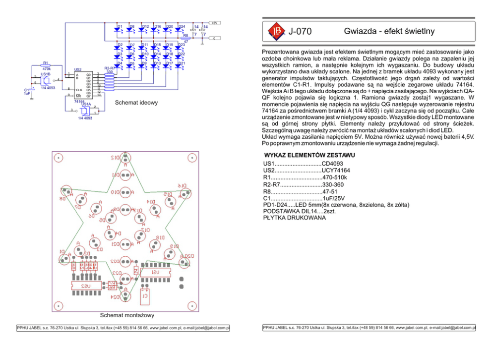 +5V D1 D8 D12 D16 D20 D24 R8 R1 5 470k US1B US2 1 2 A B 4 6 C1 1uF 1/4 4093 8 CLK 9 MR 3 4 5 6 10 11 12 13 Q0 Q1 Q2 Q3 Q4 Q5 Q6 Q7 74164 US1A 2 D2 D7 D11 D15 D19 47 D23 D3 D6 D10 D14 D18 D22 D4 D5 D9 D13 D17 D21 14 14 US1 US2 7 7 JABEL ® J-070 Gwiazda - efekt œwietlny 0 R2-R7 330 Schemat ideowy 3 1 1/4 4093 Prezentowana gwiazda jest efektem œwietlnym mog¹cym mieæ zastosowanie jako ozdoba choinkowa lub ma³a reklama. Dzia³anie gwiazdy polega na zapaleniu jej wszystkich ramion, a nastêpnie kolejnym ich wygaszaniu. Do budowy uk³adu wykorzystano dwa uk³ady scalone. Na jednej z bramek uk³adu 4093 wykonany jest generator impulsów taktuj¹cych. Czêstotliwoœæ jego drgañ zale¿y od wartoœci elementów C1-R1. Impulsy podawane s¹ na wejœcie zegarowe uk³adu 74164. Wejœcia A i B tego uk³adu do³¹czone s¹ do + napiêcia zasilaj¹cego. Na wyjœciach QAQF kolejno pojawia siê logiczna 1. Ramiona gwiazdy zostaj1 wygaszane. W momencie pojawienia siê napiêcia na wyjœciu QG nastêpuje wyzerowanie rejestru 74164 za poœrednictwem bramki A (1/4 4093) i cykl zaczyna siê od pocz¹tku. Ca³e urz¹dzenie zmontowane jest w nietypowy sposób. Wszystkie diody LED montowane s¹ od górnej strony p³ytki. Elementy nale¿y przylutowaæ od strony œcie¿ek. Szczególn¹ uwagê nale¿y zwróciæ na monta¿ uk³adów scalonych i diod LED. Uk³ad wymaga zasilania napiêciem 5V. Mo¿na równie¿ u¿ywaæ nowej baterii 4,5V. Po poprawnym zmontowaniu urz¹dzenie nie wymaga ¿adnej regulacji. WYKAZ ELEMENTÓW ZESTAWU US1.............................CD4093 US2.............................UCY74164 R1................................470-510kW R2-R7..........................330-360W R8................................47-51W C1................................1uF/25V PD1-D24.....LED 5mm(8x czerwona, 8xzielona, 8x zó³ta) PODSTAWKA DIL14....2szt. P£YTKA DRUKOWANA Schemat monta¿owy PPHU JABEL s.c. 76-270 Ustka ul. S³upska 3, tel./fax (+48 59) 814 56 66, www.jabel.com.pl, e-mail:[email protected] PPHU JABEL s.c. 76-270 Ustka ul. S³upska 3, tel./fax (+48 59) 814 56 66, www.jabel.com.pl, e-mail:[email protected]