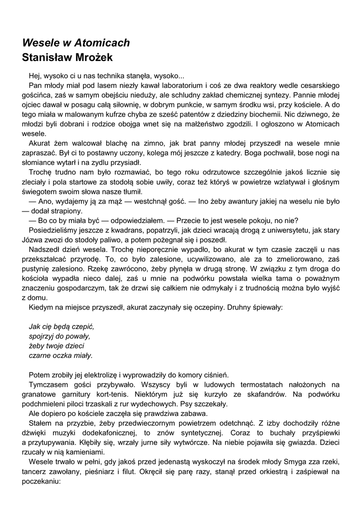 Wesele w Atomicach Stanisław Mrożek Hej, wysoko ci u nas technika stanęła, wysoko... Pan młody miał pod lasem niezły kawał laboratorium i coś ze dwa reaktory wedle cesarskiego gościńca, zaś w samym obejściu nieduży, ale schludny zakład chemicznej syntezy. Pannie młodej ojciec dawał w posagu całą siłownię, w dobrym punkcie, w samym środku wsi, przy kościele. A do tego miała w malowanym kufrze chyba ze sześć patentów z dziedziny biochemii. Nic dziwnego, że młodzi byli dobrani i rodzice obojga wnet się na małżeństwo zgodzili. I ogłoszono w Atomicach wesele. Akurat żem walcował blachę na zimno, jak brat panny młodej przyszedł na wesele mnie zapraszać. Był ci to postawny uczony, kolega mój jeszcze z katedry. Boga pochwalił, bose nogi na słomiance wytarł i na zydlu przysiadł. Trochę trudno nam było rozmawiać, bo tego roku odrzutowce szczególnie jakoś licznie się zleciały i pola startowe za stodołą sobie uwiły, coraz też któryś w powietrze wzlatywał i głośnym świegotem swoim słowa nasze tłumił. — Ano, wydajemy ją za mąż — westchnął gość. — Ino żeby awantury jakiej na weselu nie było — dodał strapiony. — Bo co by miała być — odpowiedziałem. — Przecie to jest wesele pokoju, no nie? Posiedzieliśmy jeszcze z kwadrans, popatrzyli, jak dzieci wracają drogą z uniwersytetu, jak stary Józwa zwozi do stodoły paliwo, a potem pożegnał się i poszedł. Nadszedł dzień wesela. Trochę nieporęcznie wypadło, bo akurat w tym czasie zaczęli u nas przekształcać przyrodę. To, co było zalesione, ucywilizowano, ale za to zmeliorowano, zaś pustynię zalesiono. Rzekę zawrócono, żeby płynęła w drugą stronę. W związku z tym droga do kościoła wypadła nieco dalej, zaś u mnie na podwórku powstała wielka tama o poważnym znaczeniu gospodarczym, tak że drzwi się całkiem nie odmykały i z trudnością można było wyjść z domu. Kiedym na miejsce przyszedł, akurat zaczynały się oczepiny. Druhny śpiewały: Jak cię będą czepić, spojrzyj do powały, żeby twoje dzieci czarne oczka miały. Potem zrobiły jej elektrolizę i wyprowadziły do komory ciśnień. Tymczasem gości przybywało. Wszyscy byli w ludowych termostatach nałożonych na granatowe garnitury kort-tenis. Niektórym już się kurzyło ze skafandrów. Na podwórku podchmieleni piloci trzaskali z rur wydechowych. Psy szczekały. Ale dopiero po kościele zaczęła się prawdziwa zabawa. Stałem na przyzbie, żeby przedwieczornym powietrzem odetchnąć. Z izby dochodziły różne dżwięki muzyki dodekafonicznej, to znów syntetycznej. Coraz to buchały przyśpiewki a przytupywania. Kłębiły się, wrzały jurne siły wytwórcze. Na niebie pojawiła się gwiazda. Dzieci rzucały w nią kamieniami. Wesele trwało w pełni, gdy jakoś przed jedenastą wyskoczył na środek młody Smyga zza rzeki, tancerz zawołany, pieśniarz i filut. Okręcił się parę razy, stanął przed orkiestrą i zaśpiewał na poczekaniu: Już się przed wsią naszą jasna przyszłość mości, przez szczęście społeczeństwa do szczęścia ludzkości! Oj, dana, oj, dana! Bardzo się to wszystkim spodobało. Powstał śmiech i głośne brawa. Ale już młody Pieg odbił się, wyciął hołubca, czapkę na bok skręcił i zaśpiewał w odpowiedzi: Najpierw trzeba zacząć od spraw moralności: do szczęścia społeczeństw przez ducha czystości! Hop, dziś! Na to znowu śmiech i brawa. Poniektórzy zaczęli krzyczeć na Smygę, żeby Piegowi się odciął. Ale ten nic nie rzekł, jeno cichaczem Piega zaszedł i niespodziewanie wypalił go głowicą atomową, co ją miał schowaną za pazuchą. Pieg zatoczył się i zaczął promieniować, ale zdążył jeszcze guzik u surduta nacisnąć i z wyrzutni, co ją miał ukrytą w prawej nogawce, rakietę średniego zasięgu prosto w czoło tamtemu puścił. Byłby niewątpliwie Smygę wykończył, gdyby nie to, że mu ostatni człon rakiety nie odpalił i przez to nastąpiła dewiacja z kursu. Cofnął się Smyga, zakołysał i oparł o barierę cieplną, ale ta pękła i Smyga poleciał w głąb temperatury, przy stale wzrastającym jej współczynniku. — Ludzie, co robita?! — zawołał ojciec panny młodej, wskazując na staroświecki, ścienny licznik Geigera. Ale już gwałt się podniósł i rwetes, i na środku izby zaczęły szybko wyrastać ogromne niebieskie paprocie - zwyczajna rzecz przy wzmożonej radioaktywności w zamkniętym pomieszczeniu. Już i inne rakiety latać zaczęły, jeden tylko Bańbuła zachował przyzwoitość i konwencjonalnie rżnął nożem. Wtem gwizd ostry się rozległ. To gospodarz, widząc, że inaczej gości nie uspokoi, skoczył do domowego rezerwuaru, odkręcił kurek i gazy bojowe na izbę puszczając, rozpoczął zakażanie. Rzucili się wszyscy do kombinezonów, ale mój okazał się nieszczelny, ponadto śpiący już trochę byłem, więc postanowiłem zaniechać zabawy i pomału do domu się zbierać. Noc była jasna, bo od zagrody, gdzie odbywało się wesele - takie promieniowanie biło, że bez trudu drogę znajdywałem. Szło się rześko, bo deszczyk radioaktywny też skropił raz i drugi. Trochę mi tylko to przeszkadzało, że czułem ssanie w organizmie, no, ale po zabawie - to rzecz zwyczajna - no i to, że zaczęły mi wyrastać dodatkowe nóżki, po trzy pary z każdej strony, zielony róg na czole, a na grzbiecie chitynowy pancerzyk. Jakoś jednak dobrnąłem do chałupy, przelazłem przez szparę w ramie okiennej i znalazłszy sobie zaciszne miejsce na listwie za szafą, z dala od pająków - zasnąłem spokojnie, rozpamiętując, jak to było na tym hucznym weselisku.