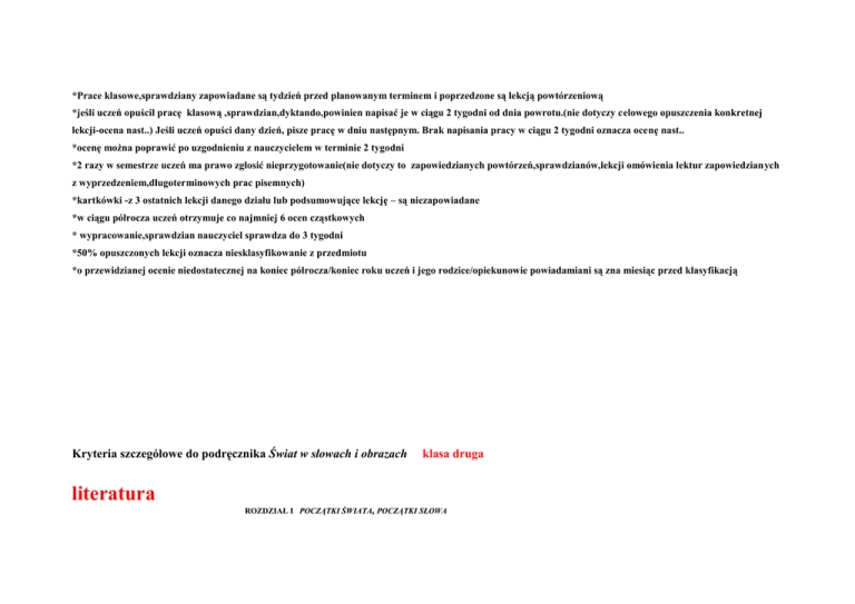 *Prace klasowe,sprawdziany zapowiadane są tydzień przed planowanym terminem i poprzedzone są lekcją powtórzeniową *jeśli uczeń opuścił pracę klasową ,sprawdzian,dyktando,powinien napisać je w ciągu 2 tygodni od dnia powrotu.(nie dotyczy celowego opuszczenia konkretnej lekcji-ocena nast..) Jeśli uczeń opuści dany dzień, pisze pracę w dniu następnym. Brak napisania pracy w ciągu 2 tygodni oznacza ocenę nast.. *ocenę można poprawić po uzgodnieniu z nauczycielem w terminie 2 tygodni *2 razy w semestrze uczeń ma prawo zgłosić nieprzygotowanie(nie dotyczy to zapowiedzianych powtórzeń,sprawdzianów,lekcji omówienia lektur zapowiedzianych z wyprzedzeniem,długoterminowych prac pisemnych) *kartkówki -z 3 ostatnich lekcji danego działu lub podsumowujące lekcję – są niezapowiadane *w ciągu półrocza uczeń otrzymuje co najmniej 6 ocen cząstkowych * wypracowanie,sprawdzian nauczyciel sprawdza do 3 tygodni *50% opuszczonych lekcji oznacza niesklasyfikowanie z przedmiotu *o przewidzianej ocenie niedostatecznej na koniec półrocza/koniec roku uczeń i jego rodzice/opiekunowie powiadamiani są zna miesiąc przed klasyfikacją Kryteria szczegółowe do podręcznika Świat w słowach i obrazach klasa druga literatura ROZDZIAŁ I POCZĄTKI ŚWIATA, POCZĄTKI SŁOWA Uwaga! Ocenę cząstkową celującą otrzymuje uczeń, który: -otrzymał ze sprawdzianu maksymalną ilośc punktów i wykonał zadanie dodatkowe(nie zawsze jest zadanie dodatkowe) -reprezentuje klasę/szkołę na konkursach przedmiotowych ,konkursach szkolnych,zajmując znaczące miejsca (laureat wojewódzkiego konkursu przedmiotowego otrzymuję ocenę celującą z przedmioty na koniec roku oraz jest zwolniony z egzaminu gimnazjalnego w cz. humanistycznej) -wykazuje się wiedzą ponadprogramową podczas odpowiedzi ustnych -wykazuje się systematyczną aktywnością na lekcji,prezentując wiedzę ponadprogramową --uczestniczy w zajęciach dodatkowych dla uczniów zdolnych, -tworzy teksty dodatkowe ,np. współtworzy gazetkę szkolną ,,Trampek” -aktywnie współtworzy oprawę uroczystości szkolnych (recytacj) LEKTURA I INNE TEKSTY KULTURY WYMAGANIA KONIECZNE (ocena: dopuszczający) Stary Testament Wygnanie z Raju płynnie czyta całość tekstu, dostrzega elementy świata przedstawionego, odtwarza przebieg wydarzeń, znajduje w tekście przykłady wskazanych cech stylu biblijnego Stary Testament Wędrówka do Ziemi Obiecanej dostrzega kolejne etapy wędrówki, opowiada o przebiegu jednego etapu wędrówki, wyszukuje w tekście PODSTAWOWE ROZSZERZONE DOPEŁNIAJĄCE (ocena: dobry) (ocena: bardzo dobry) (ocena: dostateczny) UCZEŃ czyta płynnie z intonacyjnym wyodrębnieniem wypowiedzi bohaterów, dostrzega symboliczne elementy świata przedstawionego, odtwarza motywy działania bohaterów, rozpoznaje styl biblijny w tekście czyta całość tekstu ze zrozumieniem, wylicza symboliczne elementy świata przedstawionego, odtwarza i ocenia motywy działania bohaterów, nazywa niektóre cechy stylu biblijnego dokonuje czytania interpretacyjnego, rozumie symbolikę elementów świata przedstawionego, ocenia i komentuje motywy działania bohaterów, wyjaśnia, czym cechuje się styl biblijny porządkuje w kolejności etapy wędrówki, opowiada o przebiegu wędrówki, dostrzega samodzielnie dostrzega związki kolejnych etapów wędrówki, łączy opowiadanie o przebiegu wędrówki z opisem miejsca, dostrzega symboliczny sens wędrówki, łączy opowiadanie o przebiegu wędrówki z charakterystyką postaci, wskazane motywy, wymienia nazwy biblijnych postaci motywy, wymienia nazwy biblijnych postaci i miejsc dostrzega symbolikę motywów, łączy biblijne postacie z miejscem określa symboliczny sens motywów, wskazuje historyczny i kulturowy kontekst Nowy Testament Syn marnotrawny szereguje wydarzenia, wyodrębnia postacie, nazywa cechy charakteru postaci, wie, że tekst jest przypowieścią, dostrzega związek tematyczny obrazu z tekstem relacjonuje przebieg wydarzeń, dokonuje charakterystyki postaci, wymienia cechy przypowieści, zestawia elementy świata przedstawionego na obrazie i w tekście relacjonuje i komentuje przebieg wydarzeń, charakteryzuje i ocenia postacie, wskazuje cechy tekstu jako przypowieści, opisuje warstwę przedstawieniową obrazu dostrzega uniwersalizm postaci i wydarzeń, wskazuje motywy postępowania postaci, formułuje prawdy ogólne wynikające z przypowieści, interpretuje warstwę przedstawieniową obrazu Myślę i decyduję - o argumentowaniu i rozprawce zna pojęcia teza, argument, wniosek, zna rozprawkę jako formę wypowiedzi, zna w podstawowym zakresie słownictwo wyrażające własne stanowisko, pod kierunkiem nauczyciela układa rozprawkę rozpoznaje tezę, argument, wniosek, rozpoznaje rozprawkę wśród innych form wypowiedzi, stosuje w podstawowym zakresie słownictwo podkreślające własne stanowisko, przy wsparciu nauczyciela układa rozprawkę formułuje tezę, argumenty przy pomocy nauczyciela, wymienia cechy rozprawki jako formy wypowiedzi, stosuje bogate słownictwo podkreślające własne stanowisko, samodzielnie układa rozprawkę samodzielnie formułuje tezę, argumenty, wnioski, wskazuje w tekście cudzym cechy rozprawki, stosuje słownictwo wprowadzające kolejne argumenty, samodzielnie układa rozprawkę zachowując wszystkie cechy tej formy wypowiedzi Nowy Testament Hymn o miłości określa temat utworu, wyodrębnia z tekstu nazwy wartości, wie, że utwór jest hymnem dostrzega różnice zawartości tematycznej w całości tekstu, wyodrębnia nazwy wartości i ich określenia, podaje tytuły innych utworów reprezentujących gatunek hymnu dzieli tekst na części kompozycyjne ze względu na różnice tematyczne, nazywa cechy miłości na podstawie określeń z tekstu, nazywa cechy hymnu jako gatunku lirycznego formułuje wnioski interpretacyjne na podstawie analizy kompozycji tekstu, formułuje wnioski interpretacyjne dotyczące sposobu przedstawienia m