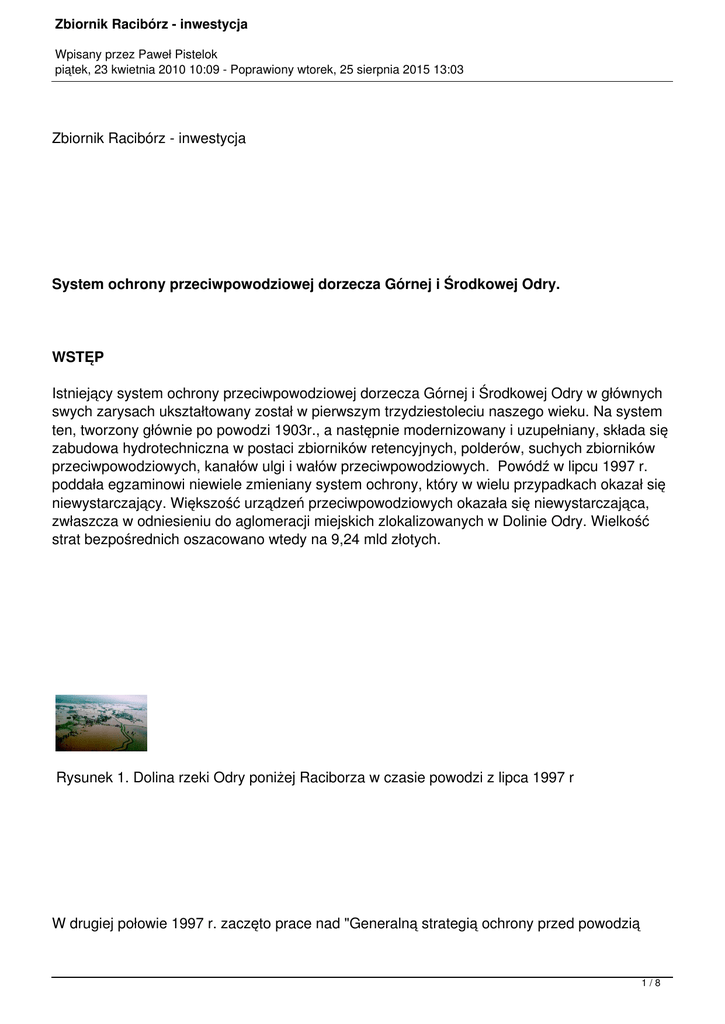 Zbiornik Racibórz - inwestycja Wpisany przez Paweł Pistelok piątek, 23 kwietnia 2010 10:09 - Poprawiony wtorek, 25 sierpnia 2015 13:03 Zbiornik Racibórz - inwestycja System ochrony przeciwpowodziowej dorzecza Górnej i Środkowej Odry. WSTĘP Istniejący system ochrony przeciwpowodziowej dorzecza Górnej i Środkowej Odry w głównych swych zarysach ukształtowany został w pierwszym trzydziestoleciu naszego wieku. Na system ten, tworzony głównie po powodzi 1903r., a następnie modernizowany i uzupełniany, składa się zabudowa hydrotechniczna w postaci zbiorników retencyjnych, polderów, suchych zbiorników przeciwpowodziowych, kanałów ulgi i wałów przeciwpowodziowych. Powódź w lipcu 1997 r. poddała egzaminowi niewiele zmieniany system ochrony, który w wielu przypadkach okazał się niewystarczający. Większość urządzeń przeciwpowodziowych okazała się niewystarczająca, zwłaszcza w odniesieniu do aglomeracji miejskich zlokalizowanych w Dolinie Odry. Wielkość strat bezpośrednich oszacowano wtedy na 9,24 mld złotych. Rysunek 1. Dolina rzeki Odry poniżej Raciborza w czasie powodzi z lipca 1997 r W drugiej połowie 1997 r. zaczęto prace nad "Generalną strategią ochrony przed powodzią 1/8 Zbiornik Racibórz - inwestycja Wpisany przez Paweł Pistelok piątek, 23 kwietnia 2010 10:09 - Poprawiony wtorek, 25 sierpnia 2015 13:03 dorzecza Górnej i Środkowej Odry po Wielkiej Powodzi Lipcowej 1997 r.. Prace te, zakończone we wrześniu 1998 r. wykazały, że istniejący system nie gwarantuje bezpiecznego przejścia katastrofalnych wód powodziowych, a przeciwdziałać temu można poprzez zwiększenie retencji powodziowej w Dolinie Odry. W 1999 r. w wyniku połączenia Programu ODRA 2006 oraz Programu dla Odry powstał „Program dla Odry 2006”, którego celem jest zbudowanie systemu zintegrowanej gospodarki dorzecza Odry, zapewniającego między innymi zabezpieczenie przeciw powodziowe Doliny Odry. Zarówno w "Generalnej strategii ..." jak również w „Programie dla Odry 2006”, zakłada się, jako podstawę, wybudowanie zbiornika Racibórz na rzece Odrze oraz Kamieniec Ząbkowicki na Nysie Kłodzkiej. Jedynie dzięki uwzględnieniu zbiornika Racibórz, którego oddziaływanie sięgać będzie aż po Wrocław, można w sposób całościowy oddziaływać na gospodarkę wodną rzeki Odry. Rysunek 2. Centrum Raciborza wraz z fragmentem Odry Miejskiej Historia prac koncepcyjnych Nad koncepcją zbiornika zaczęto zastanawiać się ponad 100 lat temu, po przejściu katastrofalnej powodzi w 1880 r. Pierwsze, powstałe do lat 60-tych XX wieku, opracowania zakładały budowę wielozadaniowego zbiornika o objętościach od 290 mln m3 do 695 mln m3. Zakładały one zalanie doliny Odry od Raciborza do Bohumina, na obszarze od 71 km2 do 102 km2. Jednakże skala tych inwestycji okazała się zbyt wielka, aby ją sfinansować w normalnych cyklach realizacyjnych. Dlatego w połowie lat 70-tych, opracowano kolejną wersję rozwiązania przestrzennego i technicznego, która jest obecnie realizowana. Opiera się ona na skojarzeniu etapowej budowy zbiornika z sukcesywnym wyeksploatowaniem kruszywa w obrębie jego przyszłej czaszy. Dzięki takiemu postępowaniu, mającemu znamiona rekultywacji terenów zdewastowanych eksploatacją kruszywa, można maksymalizować pojemność zbiornika równolegle z prowadzeniem pełnej rewaloryzacji terenów rolnych, leśnych i zasiedlonych na jego obrzeżach. 2/8 Zbiornik Racibórz - inwestycja Wpisany przez Paweł Pistelok piątek, 23 kwietnia 2010 10:09 - Poprawiony wtorek, 25 sierpnia 2015 13:03 Rysunek 3. Budowla przelewowo-spustowa widok od strony wody dolnej. Koncepcja ta zakłada budowę dwuczęściowego zbiornika, przystosowanego do żeglugi śródlądowej, w klasie odpowiadającej Kanałowi Odra-Dunaj. Docelowa pojemność całego kompleksu może osiągnąć 350 mln m3, a kształt i pojemność będą wynikać z powierzchni terenu przeznaczonego pod zbiornik oraz zakresu eksploatacji kruszywa i wykorzystania nadkładu. Wykonane do Wielkiej Powodzi Lipcowej 1997 r. opracowania zakładały budowę wielozadaniowego zbiornika, który miał służyć ochronie przeciwpowodziowej, poprawie warunków żeglugowych, zaopatrzeniu w wodę, energetycznemu wykorzystaniu stopnia piętrzącego i rekreacji. Dopiero po 1997 r. zrewidowano założenia budowy zbiornika Racibórz, uznając za najważniejszą jego rolę w ochronie przeciwpowodziowej Doliny Odry od Raciborza do Wrocławia. Temu celowi podporządkowana jest obecna koncepcja, zakładająca następujące etapowanie budowy: Etap I - zrealizowana budowa polderu „Buków” o powierzchni około 8 km2 i pojemności maksymalnej 50 mln m3. Wydanie decyzji o pozwoleniu na użytkowanie nastąpiło z końcem 2000 roku, natomiast trwały jeszcze roboty budowlane które zakończono w IV kwartale 2001r. Polder zapewnia redukcję najwyższych fal powodziowych o 10 - 14%. Etap II - budowa suchego zbiornika p. powodziowego „Racibórz Dolny” o pojemności 185 mln m3 przy aktualnej topografii terenu. Zbiornik zapewnia redukcję fali powodziowej z 1997r. Q=3120 m3/sek. do wielkości 1538 m3/sek. przy dysponowaniu 48 godzinną prognozą dopływu lub do wielkości około 1800 m3/sek. przy 24 godzinnej prognozie dopływu do zbiornika. Lokalizacja inwestycji. Zbiornik Racibórz Dolny mieści się w granicach województwa śląskiego na terenach należących do miasta Raciborza oraz gmin Krzyżanowice, Kornowac, Lubomia i Gorzyce. Ogółem obiekt ten zajmie powierzchnię 2626 ha, na której znajdować będzie się czasza 3/8 Zbiornik Racibórz - inwestycja Wpisany przez Paweł Pistelok piątek, 23 kwietnia 2010 10:09 - Poprawiony wtorek, 25 sierpnia 2015 13:03 zbiornika, obwałowania, kanał zrzutowy oraz obiekty melioracyjne regulujące stosunki wodne na przyległym terenie. Zbiornik Racibórz Dolny zajmuje tereny od mostu drogowego w Krzyżanowicach, aż za rozgałęzienie rzeki Odry na Odrę Miejską i Kanał 