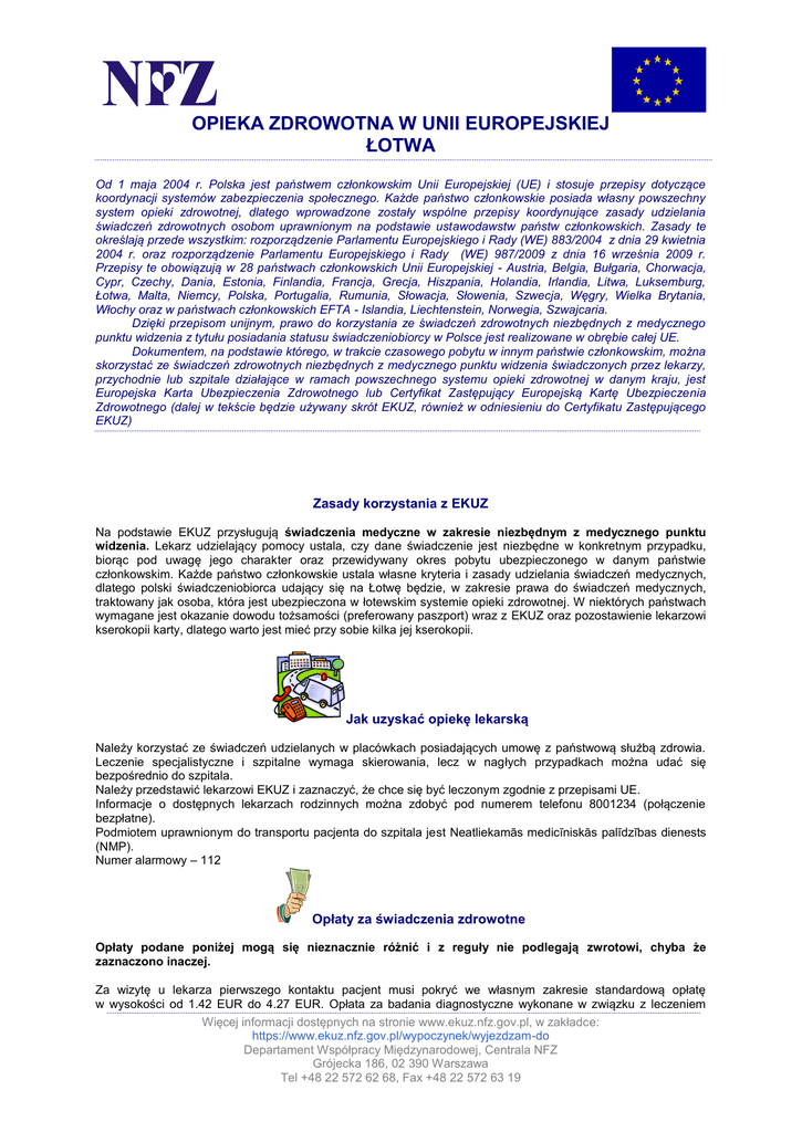 OPIEKA ZDROWOTNA W UNII EUROPEJSKIEJ ŁOTWA Od 1 maja 2004 r. Polska jest państwem członkowskim Unii Europejskiej (UE) i stosuje przepisy dotyczące koordynacji systemów zabezpieczenia społecznego. Każde państwo członkowskie posiada własny powszechny system opieki zdrowotnej, dlatego wprowadzone zostały wspólne przepisy koordynujące zasady udzielania świadczeń zdrowotnych osobom uprawnionym na podstawie ustawodawstw państw członkowskich. Zasady te określają przede wszystkim: rozporządzenie Parlamentu Europejskiego i Rady (WE) 883/2004 z dnia 29 kwietnia 2004 r. oraz rozporządzenie Parlamentu Europejskiego i Rady (WE) 987/2009 z dnia 16 września 2009 r. Przepisy te obowiązują w 28 państwach członkowskich Unii Europejskiej - Austria, Belgia, Bułgaria, Chorwacja, Cypr, Czechy, Dania, Estonia, Finlandia, Francja, Grecja, Hiszpania, Holandia, Irlandia, Litwa, Luksemburg, Łotwa, Malta, Niemcy, Polska, Portugalia, Rumunia, Słowacja, Słowenia, Szwecja, Węgry, Wielka Brytania, Włochy oraz w państwach członkowskich EFTA - Islandia, Liechtenstein, Norwegia, Szwajcaria. Dzięki przepisom unijnym, prawo do korzystania ze świadczeń zdrowotnych niezbędnych z medycznego punktu widzenia z tytułu posiadania statusu świadczeniobiorcy w Polsce jest realizowane w obrębie całej UE. Dokumentem, na podstawie którego, w trakcie czasowego pobytu w innym państwie członkowskim, można skorzystać ze świadczeń zdrowotnych niezbędnych z medycznego punktu widzenia świadczonych przez lekarzy, przychodnie lub szpitale działające w ramach powszechnego systemu opieki zdrowotnej w danym kraju, jest Europejska Karta Ubezpieczenia Zdrowotnego lub Certyfikat Zastępujący Europejską Kartę Ubezpieczenia Zdrowotnego (dalej w tekście będzie używany skrót EKUZ, również w odniesieniu do Certyfikatu Zastępującego EKUZ) Zasady korzystania z EKUZ Na podstawie EKUZ przysługują świadczenia medyczne w zakresie niezbędnym z medycznego punktu widzenia. Lekarz udzielający pomocy ustala, czy dane świadczenie jest niezbędne w konkretnym przypadku, biorąc pod uwagę jego charakter oraz przewidywany okres pobytu ubezpieczonego w danym państwie członkowskim. Każde państwo członkowskie ustala własne kryteria i zasady udzielania świadczeń medycznych, dlatego polski świadczeniobiorca udający się na Łotwę będzie, w zakresie prawa do świadczeń medycznych, traktowany jak osoba, która jest ubezpieczona w łotewskim systemie opieki zdrowotnej. W niektórych państwach wymagane jest okazanie dowodu tożsamości (preferowany paszport) wraz z EKUZ oraz pozostawienie lekarzowi kserokopii karty, dlatego warto jest mieć przy sobie kilka jej kserokopii. Jak uzyskać opiekę lekarską Należy korzystać ze świadczeń udzielanych w placówkach posiadających umowę z państwową służbą zdrowia. Leczenie specjalistyczne i szpitalne wymaga skierowania, lecz w nagłych przypadkach można udać się bezpośrednio do szpitala. Należy przedstawić lekarzowi EKUZ i zaznaczyć, że chce się być leczonym zgodnie z przepisami UE. Informacje o dostępnych lekarzach rodzinnych można zdobyć pod numerem telefonu 8001234 (połączenie bezpłatne). Podmiotem uprawnionym do transportu pacjenta do szpitala jest Neatliekamās medicīniskās palīdzības dienests (NMP). Numer alarmowy – 112 Opłaty za świadczenia zdrowotne Opłaty podane poniżej mogą się nieznacznie różnić i z reguły nie podlegają zwrotowi, chyba że zaznaczono inaczej. Za wizytę u lekarza pierwszego kontaktu pacjent musi pokryć we własnym zakresie standardową opłatę w wysokości od 1.42 EUR do 4.27 EUR. Opłata za badania diagnostyczne wykonane w związku z leczeniem Więcej informacji dostępnych na stronie www.ekuz.nfz.gov.pl, w zakładce: https://www.ekuz.nfz.gov.pl/wypoczynek/wyjezdzam-do Departament Współpracy Międzynarodowej, Centrala NFZ Grójecka 186, 02 390 Warszawa Tel +48 22 572 62 68, Fax +48 22 572 63 19 ambulatoryjnym wynosi od 1.42 EUR do 35.57 EUR. Leczenie stomatologiczne w placówkach posiadających umowę z państwową służbą zdrowia jest bezpłatne dla dzieci i młodzieży poniżej 18 roku życia. Dorośli płacą pełną cenę zgodnie z cennikiem danego lekarza stomatologa i mają swobodę wyboru dowolnego lekarza. Leczenie szpitalne wiąże się z poniesieniem kosztów stawki dziennej liczonej od drugiego dnia pobytu w wysokości 10 EUR oraz 7,11 EUR za leczenie w szpitalach specjalistycznych. Suma opłat nie może przekroczyć 355,72 EUR za jeden pobyt w szpitalu i 569,15 EUR w danym roku. Za leki objęte refundacją naliczana jest stawka ryczałtowa w wysokości 0,71 EUR oraz 0%, 10%, 25% lub 50% ceny. Pozostałe leki są w pełni odpłatne. Z dodatkowych opłat zwolnione są dzieci i młodzież poniżej 18 roku życia, pacjenci dializowani, oraz kobiety będące w okresie ciąży, porodu i połogu- do 42 dnia po porodzie. Pacjent musi pokryć we własnym zakresie koszty świadczeń zdrowotnych w zakresie: chirurgii estetycznej i kosmetologii, aborcji (z wyjątkiem tych, wykonanych ze względów medycznych), świadczeń udzielanych przez banki komórek macierzystych, zabiegów SPA, niekonwencjonalnych metod medycyny itp. W nagłych przypadkach transport karetką jest nieodpłatny. Transport powrotny do Polski jest generalnie opłacany przez pacjenta. UWAGA! EKUZ nie zapewnia pokrycia kosztów transportu medycznego do Polski oraz obowiązujących na Łotwie opłat za świadczenia medyczne, dlatego aby uniknąć obciążenia tymi kosztami, wskazane jest wykupienie dodatkowego prywatnego ubezpieczenia. Recepty Tylko lekarze pracujący w placówkach posiadających umowę z państwową służbą zdrowia mają prawo do wystawiania recept na leki objęte refundacją. Leki objęte refundacją można uzyskać w aptece jedynie na podstawie recepty wystawionej przez lekarza. Okres ważności recept wynosi 3 miesiące. Leczenie prywatne Koszty leczenia uzyskanego w placówce funkcjonują