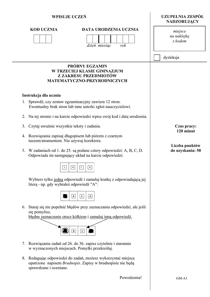 UZUPEŁNIA ZESPÓŁ NADZORUJĄCY WPISUJE UCZEŃ DATA URODZENIA UCZNIA KOD UCZNIA dzień miesiąc rok miejsce na naklejkę z kodem dysleksja PRÓBNY EGZAMIN W TRZECIEJ KLASIE GIMNAZJUM Z ZAKRESU PRZEDMIOTÓW MATEMATYCZNO-PRZYRODNICZYCH Instrukcja dla ucznia 1. Sprawdź, czy zestaw egzaminacyjny zawiera 12 stron. Ewentualny brak stron lub inne usterki zgłoś nauczycielowi. 2. Na tej stronie i na karcie odpowiedzi wpisz swój kod i datę urodzenia. Czas pracy: 120 minut 3. Czytaj uważnie wszystkie teksty i zadania. 4. Rozwiązania zapisuj długopisem lub piórem z czarnym tuszem/atramentem. Nie używaj korektora. 5. W zadaniach od 1. do 25. są podane cztery odpowiedzi: A, B, C, D. Odpowiada im następujący układ na karcie odpowiedzi: A B C Liczba punktów do uzyskania: 50 D Wybierz tylko jedną odpowiedź i zamaluj kratkę z odpowiadającą jej literą - np. gdy wybrałeś odpowiedź "A": 6. Staraj się nie popełnić błędów przy zaznaczaniu odpowiedzi, ale jeśli się pomylisz, błędne zaznaczenie otocz kółkiem i zamaluj inną odpowiedź. 7. Rozwiązania zadań od 26. do 36. zapisz czytelnie i starannie w wyznaczonych miejscach. Pomyłki przekreślaj. 8. Redagując odpowiedzi do zadań, możesz wykorzystać miejsca opatrzone napisem Brudnopis. Zapisy w brudnopisie nie będą sprawdzane i oceniane. Powodzenia! GM-A1 Informacja do zadań 1. i 2. Przeprowadzono ankietę wśród 2000 osób dotyczącą posiadanego sprzętu gospodarstwa domowego. Wyniki ankiety zamieszczono w postaci wykresu słupkowego: telewizor kolorowy 1860 lodówka 1610 pralka 1220 telefon stacjonarny 1440 magnetofon 1580 telefon komórkowy 440 Zadanie 1. (0-1) Najwięcej spośród ankietowanych osób posiada w swoim gospodarstwie domowym A. B. C. D. lodówkę i pralkę. telefon stacjonarny i pralkę. telewizor kolorowy i lodówkę. telewizor kolorowy i telefon stacjonarny. Zadanie 2. (0-1) Telefon komórkowy posiada A. B. C. D. 11% ankietowanych. 22% ankietowanych. 44% ankietowanych. 84% ankietowanych. Zadanie 3. (0-1) Na powierzchni Ziemi ciężar wody o masie 0,1 kg wynosi w przybliżeniu A. 1 N B. 0,01 N C. 1 kg D. 0,01 kg Zadanie 4. (0-1) Jaką objętość ma odważnik o masie 1 kg wykonany z mosiądzu? Przyjmij gęstość mosiądzu 8 g/cm3. A. 0,08cm3 B. 0,125 cm3 C. 8 cm3 Strona 2 z 12 D. 125 cm3 Zadanie 5. (0-1) Określ wysokość względną W i wysokość bezwzględną B, na której znajduje się hotel. m n.p.m. 800 H 600 400 200 A. W = 400 m, B = 700 m n.p.m. B. W = 300 m, B = 700 m n.p.m. C. W = 700 m, B = 400 m n.p.m. D. W = 700 m, B = 300 m n.p.m. Zadanie 6. (0-1) Który z poniższych rysunków przedstawia oświetlenie Ziemi w Polsce podczas lata? promienie słoneczne promienie słoneczne A. B. promienie słoneczne promienie słoneczne C. D. Zadanie 7. (0-1) O jaki kąt obróci się wokół własnej osi Ziemia w czasie 2 godzin? A. 15o B. 30o C. 45o Strona 3 z 12 D. 60o Do rozwiązania zadań 8. i 9. wykorzystaj poniższe informacje oraz mapę, na której zaznaczony został rejon występowania złóż diamentów. Mapę wykorzystaj również w zadaniu 13. Na początku XX w. w Afryce znaleziono największy diament świata. Największy diament świata Nazwa: Cullinan Masa: 3106 karatów (621,2 g) Miejsce znalezienia: Premier Mine Współrzędne geograficzne miejsca znalezienia: 25°40'S, 28°31'E Na podstawie: Geografia – mapy konturowe, Warszawa 2003. Zadanie 8. (0-1) Największy diament świata znaleziono w A. Angoli. B. Kongo. C. Namibii. D. RPA. Zadanie 9. (0-1) Bogate złoża w Namibii zawierają przeciętnie 0,2 karata diamentów w 1 m3 piasku i żwiru. Aby znaleźć diamenty o łącznej masie równej największemu diamentowi świata należy przepłukać piasek i żwir w ilości około A. 6 000 m3 B. 12 000 m3 C. 16 000 m3 Zadanie 10. (0-1) Które właściwości dotyczą diamentu? A. Jest koloru szarego, jest izolatorem. B. Jest najtwardszym minerałem, jest izolatorem. C. Jest koloru szarego, przewodzi prąd elektryczny. D. Jest najtwardszym minerałem, przewodzi prąd elektryczny. Strona 4 z 12 D. 18 000 m3 Do rozwiązania zadań 11., 12., 13., wykorzystaj poniższe wykresy. Trzy spośród czterech poniższych wykresów przedstawiają dane klimatyczne miejscowości położonych w rejonach występowania złóż diamentów w Kongo, Namibii i RPA. Temp. o ( C) Temp. 30 ( oC) 300 250 25 250 20 200 20 200 15 150 15 150 10 100 10 100 5 50 5 50 0 0 30 300 Opady 25 (mm) 0 I IIII VI VII VIII IX X XI XII IV V VI VIII X XII III IV I II III IV IV V VI VI VIIVIII VIII IX X X XI XII XII II Wykres nr 1 0 Wykres nr 2 Temp. 30 o C 300 Opady (mm) Temp. 30 ( oC) 300 Opady (mm) 25 250 25 250 20 200 20 200 15 150 15 150 10 100 10 100 5 50 5 50 0 I II II IV VI VIII X Opady (mm) XII 0 0 III IV V VI VII VIII IX X XI XII I Wykres nr 3 II II IV VI VIII X XII 0 III IV V VI VII VIII IX X XI XII Wykres nr 4 Zadanie 11. (0-1) Najwyższe opady atmosferyczne w lipcu i sierpniu występują w miejscowości, z której dane klimatyczne przedstawia wykres numer A. 1 B. 2 C. 3 D. 4 Zadanie 12. (0-1) Najmniejsza roczna amplituda temperatury występuje w miejscowości, z której dane klimatyczne przedstawia wykres numer A. 1 B. 2 C. 3 D. 4 Zadanie 13. (0-1) Cechy klimatu podrównikowego wilgotnego, typowego dla obszarów wydobycia diamentów w Kongo, przedstawia wykres numer A. 1 B. 2 C. 3 Strona 5 z 12 D. 4 Tabelę rozpuszczalności substancji wykorzystaj do rozwiązania zadań 14. i 15. KATIONY NH +4 K+ Na+ Ag+ Mg2+ Pb2+ Ba2+ Al3+ Ca2+ Br– Ο Ο Ο ↓ Ο ∇ Ο Ο Ο Cl– Ο Ο Ο ↓ Ο ↓ Ο Ο Ο S2– Ο Ο Ο ↓ ∇ ↓ Ο ↓ ∇ NO 3− Ο Ο Ο Ο Ο Ο Ο Ο Ο SO 24− Ο Ο Ο ∇ Ο ↓ ↓ ↓ ∇ CO 32− Ο Ο Ο ↓ ↓ ↓ ↓ ↓ ↓ ANIONY Ο – substancja rozpuszczalna w roztworze wodnym ∇ – substancja słabo rozpuszczalna w roztworze wodnym ↓ – substancja praktycznie nierozpuszczalna w roztworze wodnym Zadanie 14. (0-1) Na podstawie tabeli rozpuszczalności substancji określ, w której reakcji 