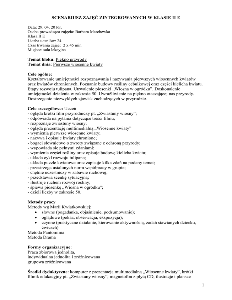 SCENARIUSZ ZAJĘĆ ZINTEGROWANYCH W KLASIE II E Data: 29. 04. 2016r. Osoba prowadząca zajęcia: Barbara Marchewka Klasa II E Liczba uczniów: 24 Czas trwania zajęć: 2 x 45 min Miejsce: sala lekcyjna Temat bloku: Piękno przyrody Temat dnia: Pierwsze wiosenne kwiaty Cele ogólne: Kształtowanie umiejętności rozpoznawania i nazywania pierwszych wiosennych kwiatów oraz kwiatów chronionych. Poznanie budowy rośliny cebulkowej oraz części kielicha kwiatu. Etapy rozwoju tulipana. Utrwalenie piosenki „Wiosna w ogródku”. Doskonalenie umiejętności dzielenia w zakresie 50. Uwrażliwienie na piękno otaczającej nas przyrody. Dostrzeganie niezwykłych zjawisk zachodzących w przyrodzie. Cele szczegółowe: Uczeń - ogląda krótki film przyrodniczy pt. „Zwiastuny wiosny”; - odpowiada na pytania dotyczące treści filmu; - rozpoznaje zwiastuny wiosny; - ogląda prezentację multimedialną „Wiosenne kwiaty” - wymienia pierwsze wiosenne kwiaty; - nazywa i opisuje kwiaty chronione; - bogaci słownictwo o zwroty związane z ochroną przyrody; - wypowiada się pełnymi zdaniami; - wymienia części rośliny oraz opisuje budowę kielicha kwiatu; - układa cykl rozwoju tulipana; - układa puzzle kwiatowe oraz zapisuje kilka zdań na podany temat; - przestrzega ustalonych norm współpracy w grupie; - chętnie uczestniczy w zabawie ruchowej; - przedstawia scenkę sytuacyjną; - ilustruje ruchem rozwój rośliny; - śpiewa piosenkę „Wiosna w ogródku”; - dzieli liczby w zakresie 50. Metody pracy Metody wg Marii Kwiatkowskiej: słowne (pogadanka, objaśnienie, podsumowanie); oglądowe (pokaz, obserwacja, ekspozycja); czynne (praktyczne działanie, kierowanie aktywnością, zadań stawianych dziecku, ćwiczeń) Metoda Pantomima Metoda Drama Formy organizacyjne: Praca zbiorowa jednolita, indywidualna jednolita i zróżnicowana grupowa zróżnicowana Środki dydaktyczne: komputer z prezentacją multimedialną „Wiosenne kwiaty”, krótki filmik edukacyjny pt. „Zwiastuny wiosny”, magnetofon z płytą CD, ilustracje i plansze 1 wiosennych kwiatów oraz kwiatów chronionych, podpisy do ilustracji, żywe kwiaty cebulkowe w doniczce (tulipan, hiacynt), wazon i sztuczne kwiaty, model kielicha kwiatu, puzzle kwiatowe, karty pracy – budowa rośliny, emblematy do zabawy ruchowej. Przebieg zajęć: I. Wstęp 1. Wprowadzenie do tematu zajęć. Odczytanie wyrazów napisanych wspak. YTAIWK Odczytanie rozsypanki sylabowej. ENNESOIW EZSWREIP ZWIAS – TU – NY WIOS – NY Przedstawienie uczniom tematu zajęć oraz celów lekcji. 2. Oglądanie krótkiego filmu edukacyjnego dla dzieci pt. „Zwiastuny wiosny”. 3. Rozmowa dotycząca treści filmu. Wypowiedzi dzieci na temat zmian zachodzących w świecie roślin i zwierząt wiosną. Pytania: Dokąd wybrały się dzieci? Co oznacza słowo zwiastun? Jakie zmiany obserwujemy w przyrodzie wiosną? Jakie rośliny zwiastują wiosnę? Co obserwujemy wśród zwierząt? II. Rozwinięcie 4. Oglądanie prezentacji multimedialnej pt. „Pierwsze wiosenne kwiaty”. Rozmowa w kręgu na temat oglądanej prezentacji. Pytania: Jak nazywają się pierwsze wiosenne kwiaty? Wymieńcie nazwy kwiatów chronionych. Dlaczego te kwiaty są pod ochroną? 5. Wyróżnianie charakterystycznych cech roślin na podstawie ilustracji oraz żywych i sztucznych kwiatów. Pytania: Jaki kolor mają przylaszczki? Jak nazywają się kwiaty, które mają biały kolor? 6. Dopasowywanie podpisów do ilustracji. 7. Usystematyzowanie wiadomości poprzez klasyfikowanie wyrazów na dwie grupy. Kwiaty pod ochroną dziko rosnące Krokus (szafran) Przebiśnieg (śnieżyczka) Przylaszczka Zawilec Sasanka Pierwiosnek- częściowa ochrona Konwalia – częściowa ochrona Kwiaty hodowane przez człowieka Tulipan Żonkil, narcyz fiołek szafirek hiacynt, stokrotka krzew forsycji magnolia, migdałek Informacje: Rośliny dziko rosnące, które zakwitają wiosną, to.: krokusy, przebiśniegi, przylaszczki, pierwiosnki, zawilce, sasanki, konwalie oraz stokrotki, fiołki, kaczeńce… Część wiosennych kwiatów podlega ochronie. Nie wolno ich zrywać, deptać czy niszczyć. Za zniszczenie roślin chronionych grożą kary. Rośliny te rzadko występują – grozi im wyginięcie. Zerwane rośliny szybko więdną. 8. Zabawa ruchowa przy piosence „Wiosna w ogródku”. 2 Dzieci otrzymują emblematy motyli. Podczas trwania muzyki motylki fruwają po sali śpiewając piosenkę. Gdy muzyka milknie szukają w sali i dotykają kolor wskazany przez nauczyciela. 9. Praca samodzielna. Zapisanie do zeszytu nazw kwiatów chronionych oraz hasła o ochronie roślin. Liczba mnoga rzeczownika. Krokusy, przebiśniegi, przylaszczki, zawilce i sasanki są pod ochroną. Nie zrywaj ich! 10. Praca grupowa zróżnicowana. Nauczyciel dzieli uczniów na czteroosobowe grupy. Przedstawiciele grup losują koperty. Zadaniem każdej grupy będzie ułożenie wylosowanych puzzli kwiatowych oraz zapisanie trzech zdań na temat danego kwiatu. Prezentacja prac. 11. Rozmowa w kręgu. Zwrócenie uwagi na klasowy kącik przyrodniczy i zgromadzone tam rośliny. Przedstawienie budowy rośliny cebulkowej. Czego roślina potrzebuje do życia? Nazywanie poszczególnych części tulipana (kwiat, łodyga, liść, cebulka, korzeń). Omówienie budowy kielicha kwiatu (słupek, pręciki, płatki, działki kielicha). Cykl wzrostu tulipana. 12. Pantomima przy muzyce „Wiosna” Vivaldiego. Dzieci otrzymują do ręki małą cebulkę. Wyobraź sobie, że jesteś maleńką cebulką, z której wyrośnie wiosenny kwiatek. Mróz ściska jeszcze ziemię, nie możesz się nawet poruszyć. Jest ciemno i ciasno. Nie możesz tego zobaczyć, ale czujesz, że słońce zaczyna mocniej przygrzewać, topi się śnieg i woda wsiąka w ziemię. Jest ci już luźniej. Nic jeszcze nie widzisz, ale powoli wypuszczasz pierwsze kiełki. Coraz śmielej wyciągasz ku górze zielone ramiona. Nadal jeszcze nic nie widzisz, ale czujesz, jak wiatr otula twoje delikatne ł