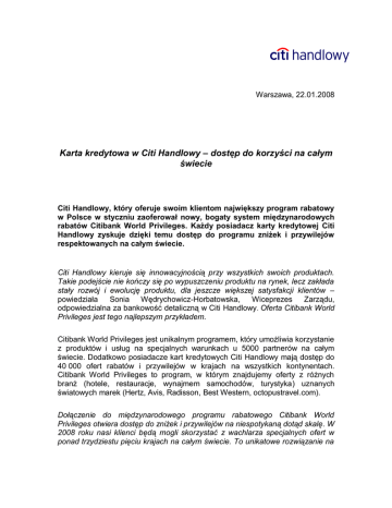Warszawa, 22.01.2008 Karta kredytowa w Citi Handlowy – dostęp do korzyści na całym świecie Citi Handlowy, który oferuje swoim klientom największy program rabatowy w Polsce w styczniu zaoferował nowy, bogaty system międzynarodowych rabatów Citibank World Privileges. Każdy posiadacz karty kredytowej Citi Handlowy zyskuje dzięki temu dostęp do programu zniżek i przywilejów respektowanych na całym świecie. Citi Handlowy kieruje się innowacyjnością przy wszystkich swoich produktach. Takie podejście nie kończy się po wypuszczeniu produktu na rynek, lecz zakłada stały rozwój i ewolucję produktu, dla jeszcze większej satysfakcji klientów – powiedziała Sonia Wędrychowicz-Horbatowska, Wiceprezes Zarządu, odpowiedzialna za bankowość detaliczną w Citi Handlowy. Oferta Citibank World Privileges jest tego najlepszym przykładem. Citibank World Privileges jest unikalnym programem, który umożliwia korzystanie z produktów i usług na specjalnych warunkach u 5000 partnerów na całym świecie. Dodatkowo posiadacze kart kredytowych Citi Handlowy mają dostęp do 40 000 ofert rabatów i przywilejów w krajach na wszystkich kontynentach. Citibank World Privileges to program, w którym znajdujemy oferty z różnych branż (hotele, restauracje, wynajmem samochodów, turystyka) uznanych światowych marek (Hertz, Avis, Radisson, Best Western, octopustravel.com). Dołączenie do międzynarodowego programu rabatowego Citibank World Privileges otwiera dostęp do zniżek i przywilejów na niespotykaną dotąd skalę. W 2008 roku nasi klienci będą mogli skorzystać z wachlarza specjalnych ofert w ponad trzydziestu pięciu krajach na całym świecie. To unikatowe rozwiązanie na polskim rynku. – powiedział Waldemar Jarek, Dyrektor departamentu marketingu kart kredytowych. Citibank World Privileges wzbogaci tym samym dotychczasowy Program Rabatowy Banku, z którego korzystali posiadacze kart kredytowych Citi Handlowy. Na terenie Polski użytkownicy kart mają do dyspozycji ponad 2500 punktów oferujących zniżki, nawet do 50%. Ponadto mają miejsce specjalne oferty sezonowe (letnia i zimowa edycja) oraz specjalne oferty (tworzone indywidualnie z partnerami programu). Więcej informacji o programie Citibank World Privileges na stronie: http://worldprivileges.citibank.com Opis programów rabatowych na terenie Polski: https://www.online.citibank.pl/page.do?content=k_program_rabatowy ### Dodatkowych informacji udziela: Paweł Zegarłowicz, Dyrektor Biura Prasowego, tel. (0-22) 657 72 97 E-mail: [email protected] Agata Charuba–Chadryś, Specjalista ds. Kontaktów z Mediami, tel. (0-22) 692 90 52 E-mail: [email protected] Bank Handlowy w Warszawie SA to jedna z największych instytucji finansowych w Polsce, oferująca pod marką Citi Handlowy bogaty i nowoczesny asortyment produktów i usług bankowości korporacyjnej, inwestycyjnej i detalicznej. Bank Handlowy obsługuje 20 tys. klientów korporacyjnych i 800 tys. klientów indywidualnych poprzez nowoczesne kanały dystrybucji oraz sieć ponad 188 oddziałów. W skład grupy kapitałowej Banku wchodzą takie podmioty jak: Dom Maklerski Banku Handlowego i Handlowy Leasing. Przynależność do Citigroup, największej na świecie instytucji finansowej, zapewnia klientom Banku Handlowego dostęp do usług finansowych w ponad 100 krajach. Dodatkowe informacje można uzyskać na stronie internetowej www.citihandlowy.pl. Citi (NYSE:C) to wiodąca globalna firma świadcząca usługi finansowe. Obsługuje około 200 milionów klientów indywidualnych, korporacyjnych, rządowych i instytucjonalnych w ponad 100 krajach. Zapewnia bogaty wachlarz produktów i usług finansowych, jak bankowość komercyjna i inwestycyjna, bankowość detaliczna, kredytowanie, ubezpieczenia, usługi na rynków papierów wartościowych i zarządzanie aktywami. Główne marki pod znakiem handlowym Citigroup to Citibank, CitiFinancial, Primerica, Smith Barney i Banamex. Dodatkowe informacje można uzyskać na stronie internetowej www.citigroup.com.