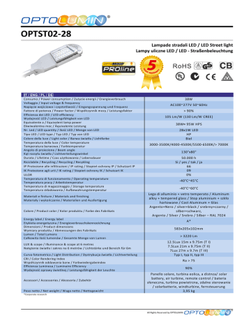 OPTOLUMIN ® OPTST02-28 Lampade stradali LED / LED Street light Lampy uliczne LED / LED - Straßenbeleuchtung PROline Consumo / Power consumption / Zużycie energii / Energieverbrauch Voltaggio / Input voltage & frequency Napięcie wejściowe i częstotliwość / Eingangsspannung und Frequenz Fattore di potenza / Power factor / Współczynnik mocy / Leistungsfaktor Efficienza dei LED / LED efficiency Wydajność LED / Leistungsfähigkeit von LED Equivalente a / Equivalent lamp power Ekwiwalentna moc / Äquivalente Leistung Nr. Led / LED quantity / Ilość LED / Menge von LED Tipo LED / LED type / Typ LED / Typ von LED Colore della luce / Light color / Barwa światła / Lichtfarbe Temperatura della luce / Color temperature Temperatura barwowa / Farbtemperatur Angolo di proiezione / Beam angle Kąt rozsyłu światła / Lichtverteilungswinkel Durata / Lifetime / Czas użytkowania / Lebensdauer Riciclabile / Recycling / Recycling / Recykling IP Protezione alle infiltrazioni / IP rating / Stopień ochrony IP / Schutzart IP IK Protezione agli urti / IK rating / Stopień ochrony IK / Schutzart IK ULOR Temperatura di funzionamento / Operating temperature Temperatura pracy / Arbeitstemperatur Temperatura di magazzinaggio / Storage temperature Temperatura składowania / Aufbewahrungstemperatur Materiali e finiture / Materials and finishing Materiały i wykończenie / Materialien und Ausfertigung Colore / Product color / Kolor produktu / Farbe des Fabrikats Energy label / Energy label Etykieta energetyczna / Energieverbrauchskennzeichnung Dimensioni / Product dimensions Wymiary produktu / Abmessungen des Fabrikats Lumen / Total Lumens Całkowita ilość lumenów / Gesamte Menge von Lumen LUX & scope / Illuminance & scope at 6 metres Natężenie światła i zakres na 6 metrów / Lichtstärke und Bereich für 6m Curva fotometrica / Light Distribution / Dystrybucja światła / Lichtverteilung CRI / Color Rendering Index Współczynnik oddawania barw / Farbwiedergabeindex Efficienza Luminosa / Luminaire Efficiency Wydajność oprawy świetlnej / Leistungsfähigkeit der Leuchte Accessori / Accessories / Akcesoria / Zubehör Peso netto / Net weight / Waga netto / Nettogewicht 38W AC100~277V 50~60Hz > 90% 105 Lm/W (130 Lm/W CREE) 38W 95W HPS 28x1W LED HP Biel 3000-3500K/4000-4500K/5500-6500K/> 7000K 130°x80° 50.000 h Sì / yes / tak / ja 66 09 0% -40°C~45°C -40°C~60°C Lega di alluminio + vetro temperato / Aluminum alloy + tempered glass / Stop aluminium + szkło hartowane / Cast Aluminum + Glas Argento+Nero / silver+black / srebrny+czarny / silber+schwarz, Argento / Silver / Srebro / Silber – RAL 7024 A* 583x205x102mm > 3220 Lm 12.5Lux 15m x 9.75m (T I) 7.5Lux 21m x 9.75m (T II) 7Lux 27m x 9.7m (T III) Typ I, typ II, typ III Ra > 75 90% Panello solare, turbina eolica, a distnza/ solar battery, air turbine, remote control / bateria słoneczna, turbina powietrzna, zdalne sterowanie / solarbatterie, windturbine, fernsteuerung 3,95 kg *Corporate research All Rights Reserved by OPTOLUMIN OPTOLUMIN ® OPTOLUMIN ® OPTST02-28 Certified in accordance with: EN60598-1:2008+A11 EN60598-2-1:1989 EN60598-2-5:1998 EN62471:2008 EN62493:2010 LVD 2006/95/EC EN6100-3-2/A2 EN6100-3-3 EN61347-2-13 EN55015/A2 All Rights Reserved by OPTOLUMIN OPTOLUMIN ®