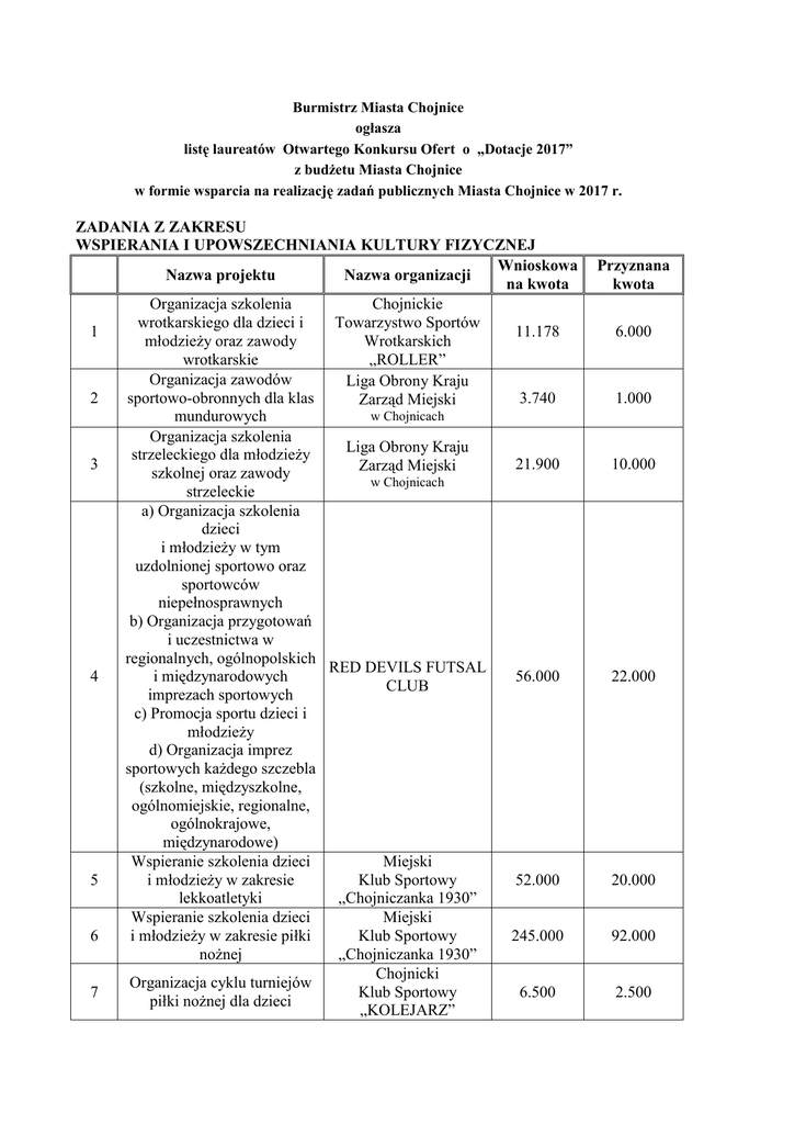 Burmistrz Miasta Chojnice ogłasza listę laureatów Otwartego Konkursu Ofert o „Dotacje 2017” z budżetu Miasta Chojnice w formie wsparcia na realizację zadań publicznych Miasta Chojnice w 2017 r. ZADANIA Z ZAKRESU WSPIERANIA I UPOWSZECHNIANIA KULTURY FIZYCZNEJ Wnioskowa Nazwa projektu Nazwa organizacji na kwota Organizacja szkolenia Chojnickie wrotkarskiego dla dzieci i Towarzystwo Sportów 1 11.178 młodzieży oraz zawody Wrotkarskich wrotkarskie „ROLLER” Organizacja zawodów Liga Obrony Kraju 2 sportowo-obronnych dla klas 3.740 Zarząd Miejski w Chojnicach mundurowych Organizacja szkolenia Liga Obrony Kraju strzeleckiego dla młodzieży 3 21.900 Zarząd Miejski szkolnej oraz zawody w Chojnicach strzeleckie a) Organizacja szkolenia dzieci i młodzieży w tym uzdolnionej sportowo oraz sportowców niepełnosprawnych b) Organizacja przygotowań i uczestnictwa w regionalnych, ogólnopolskich RED DEVILS FUTSAL 4 i międzynarodowych 56.000 CLUB imprezach sportowych c) Promocja sportu dzieci i młodzieży d) Organizacja imprez sportowych każdego szczebla (szkolne, międzyszkolne, ogólnomiejskie, regionalne, ogólnokrajowe, międzynarodowe) Wspieranie szkolenia dzieci Miejski 5 i młodzieży w zakresie Klub Sportowy 52.000 lekkoatletyki „Chojniczanka 1930” Wspieranie szkolenia dzieci Miejski 6 i młodzieży w zakresie piłki Klub Sportowy 245.000 nożnej „Chojniczanka 1930” Chojnicki Organizacja cyklu turniejów 7 Klub Sportowy 6.500 piłki nożnej dla dzieci „KOLEJARZ” Przyznana kwota 6.000 1.000 10.000 22.000 20.000 92.000 2.500 8 9 10 11 12 13 14 15 16 17 18 19 20 21 Organizacja szkolenia dzieci i młodzieży w ramach dyscypliny „piłka nożna” Organizacja przygotowań i uczestnictwa w regionalnych i ogólnopolskich imprezach sportowych Organizacja szkolenia dzieci i młodzieży uzdolnionej sportowo wraz z udziałem w regatach krajowych i zagranicznych Organizacja imprez żeglarskich rangi ogólnopolskiej Organizacja Pomorskiego Mitingu Pływackiego Olimpiad Specjalnych Szkolenie sportowe młodzieży i osób niepełnosprawnych Organizacja przygotowań i uczestnictwa w regionalnych, ogólnopolskich i międzynarodowych imprezach sportowych. Boks. Szkolenie dzieci i młodzieży w rugby Chojnicki Klub Sportowy „KOLEJARZ” 38.000 8.000 Uczniowski Klub Sportowy „KET” 6.000 3.000 Chojnicki Klub Żeglarski 120.000 65.000 Chojnicki Klub Żeglarski 20.000 7.000 Chojnicki Klub Żeglarski 7.700 3.000 Chojnicki Klub Żeglarski 15.000 13.000 Uczniowski Klub Sportowy „BOKSER” Chojnice 13.000 7.000 25.000 12.000 15.000 3.000 10.000 1.000 5.000 1.000 32.584 7.500 10.300 2.000 2.852 1.000 Uczniowski Klub Sportowy „RUGBY TUR CHOJNICE” przy Technikum im. Stefana Bieszka Chojnickie Stowarzyszenie AIKIDO Uczniowski Klub Sportowy „OGÓLNIAK” Uczniowski Klub Sportowy „OGÓLNIAK” Ogólnopolski cykl seminariów szkoleniowych aikido i kenjutsu Organizacja szkolenia dzieci i młodzieży w zakresie piłki siatkowej Organizacja szkolenia dzieci i młodzieży w zakresie piłki koszykowej Szkolenie dzieci i młodzieży uzdolnionej ruchowo w Klub Sportowy „OSIR” pływaniu Szkolenie dzieci i młodzieży uzdolnionej ruchowo w piłce Klub Sportowy „OSIR” siatkowej Zawody pływackie dla dzieci szkół podstawowych z roczników: 2009, 2008, 2007 Klub Sportowy „OSIR” i 2006 o Mistrzostwo Chojnic i puchar Burmistrza Miasta 22 23 24 25 26 27 28 29 Zawody pływackie dla dzieci i młodzieży w trzech kategoriach wiekowych: grupa pierwsza 2004 Klub Sportowy „OSIR” z 2005, druga 2003 i trzecia 2002 z 2001 o Mistrzostwo Chojnic i puchar Burmistrza Miasta Organizacja cyklu turniejów szachowych i tenisa stołowego oraz Ogólnopolskiego Wieloboju Uniwersalnego umożliwiających współzawodnictwo sportowe zawodników na szczeblu regionalnym, wojewódzkim i ogólnopolskim Organizacja szkolenia zawodników UKS „Ósemka” Chojnice w poszczególnych sekcjach Udział i organizacja rozgrywek o Mistrzostwo II Ligi Petanque Zimowa liga petanque o puchar Burmistrza Miasta Chojnice Udział w zawodach w ramach współzawodnictwa sportowego Organizacja Piątkowych Biegów Rodzinnych Szkółka wędkarska dla dzieci i młodzieży 2.252 1.000 Uczniowski Klub Sportowy „ÓSEMKA” Chojnice 13.700 3.500 Uczniowski Klub Sportowy „ÓSEMKA” Chojnice 6.000 3.500 Chojnickie Towarzystwo Polsko-Francuskie 8.700 2.000 3.650 1.000 23.356 16.000 1.000 800 3.829,60 1.200 Chojnickie Towarzystwo Polsko-Francuskie Klub Sportowy „BOXING TEAM” Chojnice Klub Biegacza „FLORIAN” Polski Związek Wędkarski Okręg w Gdańsku Koło 129 w Chojnicach