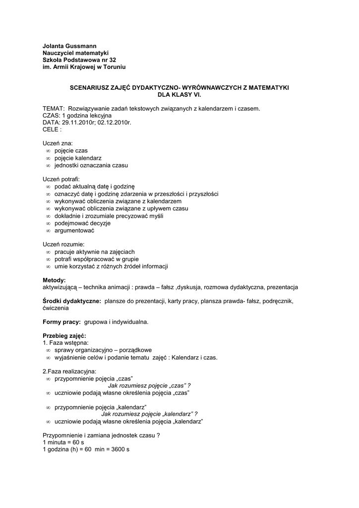 Jolanta Gussmann Nauczyciel matematyki Szkoła Podstawowa nr 32 im. Armii Krajowej w Toruniu SCENARIUSZ ZAJĘĆ DYDAKTYCZNO- WYRÓWNAWCZYCH Z MATEMATYKI DLA KLASY VI. TEMAT: Rozwiązywanie zadań tekstowych związanych z kalendarzem i czasem. CZAS: 1 godzina lekcyjna DATA: 29.11.2010r; 02.12.2010r. CELE : Uczeń zna: • pojęcie czas • pojęcie kalendarz • jednostki oznaczania czasu Uczeń potrafi: • podać aktualną datę i godzinę • oznaczyć datę i godzinę zdarzenia w przeszłości i przyszłości • wykonywać obliczenia związane z kalendarzem • wykonywać obliczenia związane z upływem czasu • dokładnie i zrozumiale precyzować myśli • podejmować decyzje • argumentować Uczeń rozumie: • pracuje aktywnie na zajęciach • potrafi współpracować w grupie • umie korzystać z różnych źródeł informacji Metody: aktywizującą – technika animacji : prawda – fałsz ,dyskusja, rozmowa dydaktyczna, prezentacja Środki dydaktyczne: plansze do prezentacji, karty pracy, plansza prawda- fałsz, podręcznik, ćwiczenia Formy pracy: grupowa i indywidualna. Przebieg zajęć: 1. Faza wstępna: • sprawy organizacyjno – porządkowe • wyjaśnienie celów i podanie tematu zajęć : Kalendarz i czas. 2.Faza realizacyjna: • przypomnienie pojęcia „czas” Jak rozumiesz pojęcie „czas” ? • uczniowie podają własne określenia pojęcia „czas” • przypomnienie pojęcia „kalendarz” Jak rozumiesz pojęcie „kalendarz” ? • uczniowie podają własne określenia pojęcia „kalendarz” Przypomnienie i zamiana jednostek czasu ? 1 minuta = 60 s 1 godzina (h) = 60 min = 3600 s 1 doba = 1440 min = 24 · 3600 s = 86 400 s 1 rok kalendarzowy = 365 dni + co 4 lata rok przestępny, liczący 366 dni. Rozwiązujemy zadania w parach, a następnie omawiamy: Zad.1 Pewien zegar ścienny chodzi po nakręceniu 60 godzin. Stanął 15 marca o godzinie 11.00. O której godzinie, którego dnia miesiąca został nakręcony? Odp. Zegar został nakręcony 12 marca o godzinie 23.00. Zad.2 W autobusie znajduje się zegar wyświetlający godziny i minuty. Zegar wskazuje godzinę 7.00. Czeka mnie godzina jazdy tym autobusem. a) Ile razy w czasie tej godziny pojawi się na wyświetlaczu cyfra 1? (odp. 15 razy) b) Ile razy w czasie tej godziny pojawi się na wyświetlaczu cyfra 6? (odp. 6 razy) c) Która z cyfr pojawi się w czasie tej godziny najczęściej, a która najrzadziej? (najczęściej 0 – 18 razy; 6,7,9 – sześć razy) Zad.3 Ile razy w ciągu doby i w jakich godzinach zegar wybija trzy razy pod rząd tę samą ilość uderzeń? Odp. 2 razy w ciągu doby np. 12.30, 13.00, 13.30. Zad.4 Dzień 3 sierpnia pewnego roku wypadł w niedzielę. Jaki dzień tygodnia będzie 20 sierpnia? Odp. Środa Zad.5 Jeśli 13 maja był piątek, to w który dzień tygodnia wypadnie 13 czerwca? Odp. Poniedziałek Zad.6 Przyjmij, że dzisiaj jest piątek 23 września. Jaki dzień tygodnia będzie za miesiąc – 23 października? Odp. niedziela Uczniowie dobierają się w grupy dwuosobowe • otrzymują karty pracy oraz plansze wielkości A-4 ; pracują metodą prawda - fałsz : o uczestnicy grupy otrzymują karty z zadaniami z karty pracy i układają je nie zapisaną stroną do góry na polu –„ karty” o uczniowie z danej grupy kolejno wyciągają kartę, głośno czytają treść i ustalają odpowiedź : „ prawda”, „ fałsz” albo zgłaszając ” brak wiedzy” o odczytujący kładzie kartę na polu „ prawda” lub „ fałsz”, jeśli w grupie w określonym czasie nie dojdzie do porozumienia - wtedy kartę odkładana na polu „ brak wiedzy” o każda grupa może uzyskać 21 punktów dzisiaj jest 25 marca 2010r. dwa tygodnie temu był 11 marca 2010r. 4,5godziny = 450 minut 10 minut to 1 część 6 dzisiaj jest 5 marca 2010r. za dwa tygodnie będzie 19 marca 2005r. 8 godzin to ćwierć doby 45 minut to 3 kwadranse 12 godzin to jedna czternasta części tygodnia godziny 6 godzin to 1 4 część doby zegar pokazuje: 17: 34: 26 po4 min. i 12s wskaże: 17:38: 38 23 dzisiaj jest 7 marca 2005r. za 20 dni będzie 26 marca 2005r. 45 zegar pokazuje: 18: 54: 47 po23 min. i 36 s wskaże: 19 :27 : 33 17 zegar pokazuje: 3: 34: 42 przed 23godz.wskazywał 16: 34 : 42 45 od 12 do 13 minęło 1 godz. i 22 minuty od 22 do 6 minęło 8 godz. i 28 minuty Dziś jest sobota, za 10 dni będzie wtorek Dziś jest poniedziałek, 00 godzina 8 , za 40 godzin będzie wtorek marzec ma zawsze 31 dni kwartał to 4 miesiące 12 lipiec i sierpień mają po 31 dni KALENDARZ I CZAS PRAWDA w dekada to 10 dni PLANSZA KARTY 12 od 6 w sobotę do 12 niedzielę minęło 18 godzin BRAK WIEDZY FAŁSZ • jeden z uczniów przedstawia efekty pracy swojej grupy • analiza i ewentualna korekta uzyskanych wyników ze szczególnym uwzględnieniem zadań znajdujących się na niewłaściwym polu i polu „ brak wiedzy” • przedstawienie i omówienie prawidłowych rozwiązań Uczniowie w grupach rozwiązują zestawy 5 jednakowych zadań. Zad.1 Dziś jest środa, godzina 8.00. Jaki dzień i jaka godzina będzie za; a) 12 godzin b) 24 godziny c) 35 godzin? Odp. a) środa godzina 20:00 b) czwartek godz. 4.00 c) czwartek godz. 19.00 Zad.2 Dziś jest poniedziałek. Jaki dzień tygodnia będzie; a) za 10 dni, b) za 3 dni, c) za tydzień, d) za 8 dni? Odp. a) czwartek b)piątek c) poniedziałek d) wtorek Zad.3 W niedzielne popołudnie Zosia zastanawia się jaki dzień był: a) 3 dni temu, b) 5 dni temu, c) 10 dni temu, d) tydzień temu? Odp. a)czwartek b) wtorek c) czwartek d) niedziela Zad.4 Pewien zegar ścienny chodzi po nakręceniu 60 godzin. Stanął 15 marca o godzinie 11.00. O której godzinie, którego dnia miesiąca został nakręcony? Odp. Zegar został nakręcony 12 marca o godzinie 23.00. Zad.5 We wtorek Krzyś ma 5 lekcji. Po trzeciej i piątej lekcji jest piętnastominutowa przerwa. Inne przerwy trwają 10 minut. O której Krzyś skończy w tym dniu lekcje, jeżeli zajęcia rozpoczyna o godzinie 8:00?