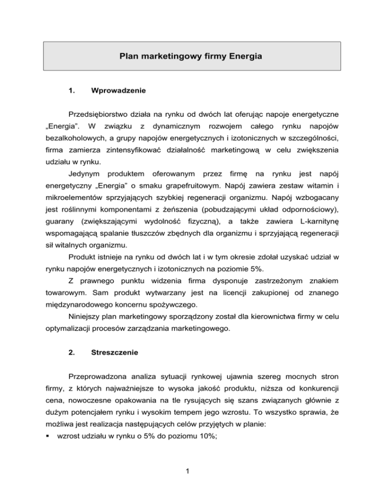 Plan marketingowy firmy Energia 1. Wprowadzenie Przedsiębiorstwo działa na rynku od dwóch lat oferując napoje energetyczne „Energia”. W związku z dynamicznym rozwojem całego rynku napojów bezalkoholowych, a grupy napojów energetycznych i izotonicznych w szczególności, firma zamierza zintensyfikować działalność marketingową w celu zwiększenia udziału w rynku. Jedynym produktem oferowanym przez firmę na rynku jest napój energetyczny „Energia” o smaku grapefruitowym. Napój zawiera zestaw witamin i mikroelementów sprzyjających szybkiej regeneracji organizmu. Napój wzbogacany jest roślinnymi komponentami z żeńszenia (pobudzającymi układ odpornościowy), guarany (zwiększającymi wydolność fizyczną), a także zawiera L-karnitynę wspomagającą spalanie tłuszczów zbędnych dla organizmu i sprzyjającą regeneracji sił witalnych organizmu. Produkt istnieje na rynku od dwóch lat i w tym okresie zdołał uzyskać udział w rynku napojów energetycznych i izotonicznych na poziomie 5%. Z prawnego punktu widzenia firma dysponuje zastrzeżonym znakiem towarowym. Sam produkt wytwarzany jest na licencji zakupionej od znanego międzynarodowego koncernu spożywczego. Niniejszy plan marketingowy sporządzony został dla kierownictwa firmy w celu optymalizacji procesów zarządzania marketingowego. 2. Streszczenie Przeprowadzona analiza sytuacji rynkowej ujawnia szereg mocnych stron firmy, z których najważniejsze to wysoka jakość produktu, niższa od konkurencji cena, nowoczesne opakowania na tle rysujących się szans związanych głównie z dużym potencjałem rynku i wysokim tempem jego wzrostu. To wszystko sprawia, że możliwa jest realizacja następujących celów przyjętych w planie: wzrost udziału w rynku o 5% do poziomu 10%; 1 wzrost dostępności produktu na rynku do 45% placówek zlokalizowanych w dużych aglomeracjach; zwiększenie znajomości marki do poziomu 50% w grupie docelowej; potrojenie zysku ze sprzedaży. Warunkiem realizacji tego planu jest utrzymanie systematycznego wzrostu wielkości sprzedaży na przestrzeni całego roku oraz terminowe regulowanie zobowiązań przez odbiorców, tak jak to miało miejsce w latach poprzednich. Dodatkowo w planie przyjęto założenia o ustabilizowanym poziomie inflacji oraz kursie euro nie przekraczającym 4,50 zł. 3. Analiza sytuacji Analizując sytuację rynkową w całej branży napojów bezalkoholowych, a w jej ramach w segmencie napojów energetycznych i izotonicznych firma opiera się na kilku źródłach informacji. Podstawowe znaczenie mają branżowe analizy i badania przeprowadzane przez wyspecjalizowane instytuty badawcze zajmujące się monitoringiem sprzedaży produktów szybkozbywalnych (głównie AC Nielsen Polska), czy też badaniami konsumenckimi (Pentor oraz SMG/KRC). Firma na bieżąco śledzi również publikacje w prasie branżowej, analizuje dane GUS dotyczące rynku napojów bezalkoholowych oraz zbiera opinię handlowców, z którymi współpracuje w zakresie sprzedaży napoju „Energia”. Założenia Stopa inflacji na poziomie 3%; Kurs euro na poziomie 4,50 zł; Analiza rynku Rynek napojów bezalkoholowych charakteryzuje się wzrostową dynamiką sprzedaży. W 2003 roku jego wartość wzrosła w porównaniu z rokiem 2002 o 12,7% i osiągnęła 5563245 tys. zł. Ponad połowę obrotów wszystkich napojów bezalkoholowych generują napoje gazowane (36,6%) oraz wody mineralne (20,4%). W dalszej kolejności znajdują się soki (14,1%), napoje niegazowane (13,7%), nektary (12,4%) oraz napoje energetyczne i izotoniczne (2,8%). 2 Rozpatrując dynamikę sprzedaży napojów energetycznych i izotonicznych należy zauważyć, iż w 2003 roku w porównaniu z rokiem poprzednim wartość ich sprzedaży wzrosła aż o 37,2%. Jest to zdecydowanie najprężniej rozwijający się segment. Wysoką dynamiką wzrostową charakteryzują się ponadto wody mineralne (25%). Udział Udział ilościowy wartościowy w w sprzedaży 2002 2003 sprzedaży 2002 2003 Wartość Dynamika sprzedaży (w zł) 2002 2003 sprzedaży 2003/2002 Napoje energetyczne i izotoniczne Soki Nektary Napoje 0,20% 9,6% 6,1% 0,3% 8,8% 6,0% 2,3% 15,5% 13,0% 2,8% 14,1% 12,4% 113496,7 764869,4 641503,3 155770,9 784417,5 689842,4 137,2% 102,6% 107,5% niegazowane Napoje 15,2% 14,2% 14,2% 13,7% 700719,0 762164,6 108,8% gazowane Wody 38,3% 37,2% 36,6% 36,6% 1806078,6 2036147,7 112,7% mineralne 30,6% Rynek napojów 33,5% 18,4% 20,4% 907973,9 1134902,0 125,0% 100,0% 100,0% 100,0% 100,0% 4934641,0 5563245,0 112,7% bezalkoholowy ch ogółem Rynek napojów energetycznych i izotonicznych należy do najmłodszych segmentów rynku napojów bezalkoholowych. Póki co nie jest to segment duży, ale wykazuje systematyczny trend wzrostowy. Jak wykazują badania po napoje energetyczne i izotoniczne sięga prawie 10% społeczeństwa, głównie mężczyźni. Nabywcami tych napojów są przede wszystkim ludzie młodzi – do 34 roku życia, zamieszkujący duże aglomeracje miejskie, z reguły o średnim lub wyższym wykształceniu i stosunkowo wysokich dochodach przewyższających 1600 zł netto miesięcznie. Częstotliwość spożywania nie jest jeszcze zbyt wysoka – raz w tygodniu lub częściej napoje te są spożywane przez 15% nabywców, 45% sięga po nie od 1 do 3 razy w miesiącu, a 25% zaledwie 2-3 razy w roku. Pozostałe 15% to osoby, które piją napoje energetyczne i izotoniczne maksimum raz w roku. 3 Napoje energetyczne i izotoniczne jak wszystkie napoje bezalkoholowe służyć mogą zaspakajaniu pragnienia, ale w odróżnieniu od nich nie są traktowane jako produkt niezbędny do życia, czy też prawidłowego funkcjonowania organizmu. Oczywiście uzupełniają niedobory wody, posiadają również walory smakowe, ale przede wszystkim motywem ich zakupu jest chęć pobudzenia koncentracji, odświeżenia ciała i umysłu, czy też dostarczenia organizmowi energii poprzez uzupełnienie niedoboru płynów i składników mineralnych utraconych