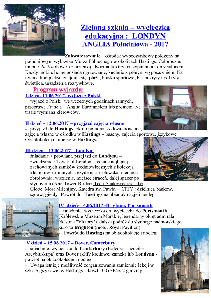 Zielona szkoła – wycieczka edukacyjna : LONDYN ANGLIA Południowa - 2017 Zakwaterowanie – ośrodek wypoczynkowy położony na południowym wybrzeżu Morza Północnego w okolicach Hastings. Całoroczne mobile 6- 7osobowe ) z łazienką, dwiema lub trzema sypialniami oraz salonem. Każdy mobile home posiada ogrzewanie, kuchnię z pełnym wyposażeniem. Na terenie kompleksu znajdują się: plaża, boiska sportowe, basen kryty i odkryty, świetlica, urządzenia rozrywkowe. Program wyjazdu: I dzień- 11.06.2017- wyjazd z Polski wyjazd z Polski we wczesnych godzinach rannych, przeprawa Francja – Anglia Eurotunelem lub promem. Na trasie wymiana kierowców. II dzień – 12.06.2017 – przyjazd zajęcia własne przyjazd do Hastings około południa -zakwaterowanie, zajęcia własne w ośrodku w Hastings – baseny, zajęcia sportowe, językowe. Obiadokolacja i nocleg w Hastings. III dzień – 13.06.2017 – Londyn śniadanie + prowiant, przejazd do Londynu – zwiedzanie : Tower of London - jeden z najlepiej zachowanych zamków średniowiecznych z kolekcją klejnotów koronnych- rezydencja królewska, mennica zbrojownia, więzienie, miejsce straceń, dalej spacer po słynnym moście Tower Bridge, Teatr Shakespeare'a -the Globe, Most Milenijny, Katedra św. Pawła, – CITY : dzielnica banków, sądów, giełdy . Powrót do Hastings na obiadokolacje i nocleg. IV dzień- 14.06.2017 -Brighton, Portsmouth śniadanie, wycieczka do wycieczka do Portsmouth (Królewskie Muzeum Morskie, legendarny okręt admirała Nelsona "Victory"), dalsza podróż do słynnego nadmorskiego kurortu Brighton (molo, Royal Pavillon) Powrót do Hastings na obiadokolację i nocleg. V dzień – 15.06.2017 – Dover, Canterbury śniadanie, wycieczka do Canterbury (Katedra - siedziba Arcybiuskupa) oraz Dover (klify kredowe, zamek) lub Londynu powrót na obiadokolację i nocleg. Uwaga istnieje możliwość zorganizowania zamiennie lekcji w szkole językowej w Hastings – koszt 10 GBP/os 2 godziny . VI dzień- 16.06.2017 – Londyn śniadanie + obfity prowiant, wyjazd do Londynu, cd zwiedzania : British Museum, Parlament, Big Ben,Westminster Abbey –miejsce koronacji i pochówku wielu królów angielskich, Pałac Buckingham, słynna aleja Whitehall, przy której mieszczą się niemal wszystkie najważniejsze instytucje rządowe kraju, m.in. Downing Street, następnie Trafalgar Square z Kolumną Nelsona. Wieczorem wyjazd do Polski . VII dzień – 17.06.2017 – powrót do Polski - powrót do Polski w późnych godzinach nocnych, na trasie wymiana kierowców Transport - autokar lux Ubezpieczenie - PZU – NNW (do 10.000 plz/os ) i KL (do 40.000 plz/os) Termin : – 11 – 17.06/ 2017 - do uzgodnienia inne terminy CENA = 1.450- zł grupa min. 40 osobowej + 4 wychowawców Cena obejmuje koszty: - przejazd autokarem Lux- wyjazd z Krasnegostawu razem z Eurotunelem lub promem - 4 noclegi w Anglii w Centrum Wakacyjnym HAVEN w okolicach Hastings - wyżywienie 3 x dziennie : śniadania + prowiant – kuchnia samoobsługowa oraz obiadokolacje wg programu - pilota na całą trasę (nie oprowadza w miejscach zastrzeżonych dla lokalnych przewodników) - ubezpieczenie PZU Voyager NNW( do 10.000 zł/os ) i KL(do 40.000 zł/os) - wycieczki w cenie imprezy bez kosztów wstępu do zwiedzanych obiektów: Londyn, Portsmouth, Brighton, Dover i Canterbury, - składka na TFG- Turystyczny Fundusz Gwarancyjny Cena nie obejmuje kosztów: - biletów wstępu do zwiedzanych obiektów, przejazdy metrem, lokalnego przewodnika w Londynie – ok. -80 GBP/os . Na zajęcia w szkole językowej należy posiadać 10 GBP/os ( 2- godziny ) - ewentualnych posiłków w Polsce – 2 obiady w drodze tam i z powrotem dodatkowy koszt 50-zł/os ORGANIZATOR : Biuro podróży Polan Travel Bielsko-Biała e-mail : [email protected] tel 33 81 19 550 tel 502 351 876 www.polan-travel.com.pl