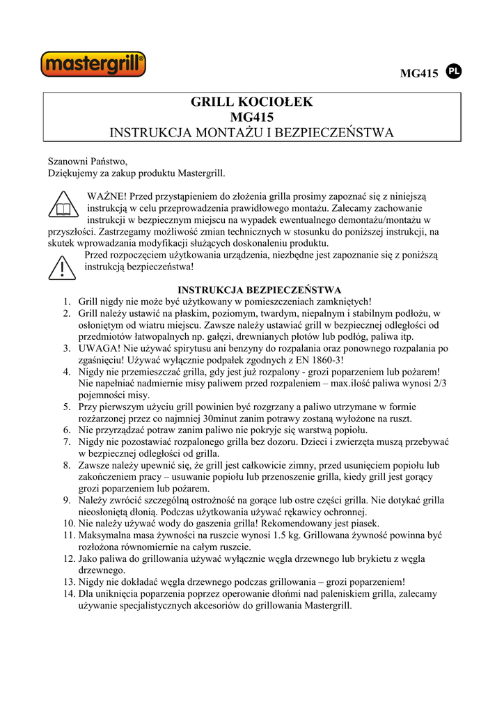 GRILL KOCIOŁEK MG415 INSTRUKCJA