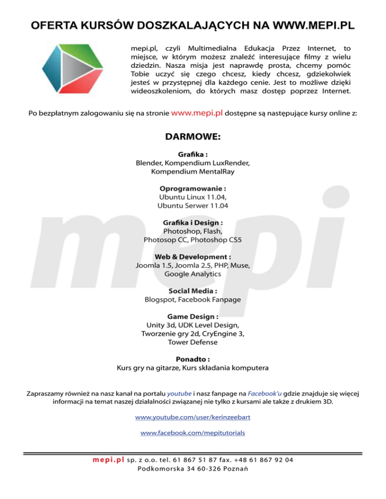 OFERTA KURSÓW DOSZKALAJĄCYCH NA WWW.MEPI.PL mepi.pl, czyli Multimedialna Edukacja Przez Internet, to miejsce, w którym możesz znaleźć interesujące filmy z wielu dziedzin. Nasza misja jest naprawdę prosta, chcemy pomóc Tobie uczyć się czego chcesz, kiedy chcesz, gdziekolwiek jesteś w przystępnej dla każdego cenie. Jest to możliwe dzięki wideoszkoleniom, do których masz dostęp poprzez Internet. Po bezpłatnym zalogowaniu się na stronie www.mepi.pl dostępne są następujące kursy online z: DARMOWE: Grafika : Blender, Kompendium LuxRender, Kompendium MentalRay Oprogramowanie : Ubuntu Linux 11.04, Ubuntu Serwer 11.04 Grafika i Design : Photoshop, Flash, Photosop CC, Photoshop CS5 Web & Development : Joomla 1.5, Joomla 2.5, PHP, Muse, Google Analytics Social Media : Blogspot, Facebook Fanpage Game Design : Unity 3d, UDK Level Design, Tworzenie gry 2d, CryEngine 3, Tower Defense Ponadto : Kurs gry na gitarze, Kurs składania komputera Zapraszamy również na nasz kanał na portalu youtube i nasz fanpage na Facebook’u gdzie znajduje się więcej informacji na temat naszej działalności związanej nie tylko z kursami ale także z drukiem 3D. www.youtube.com/user/kerinzeebart www.facebook.com/mepitutorials m e p i . p l sp. z o.o. tel. 61 867 51 87 fax. +48 61 867 92 04 Podkomorsk a 34 60-326 Poznań