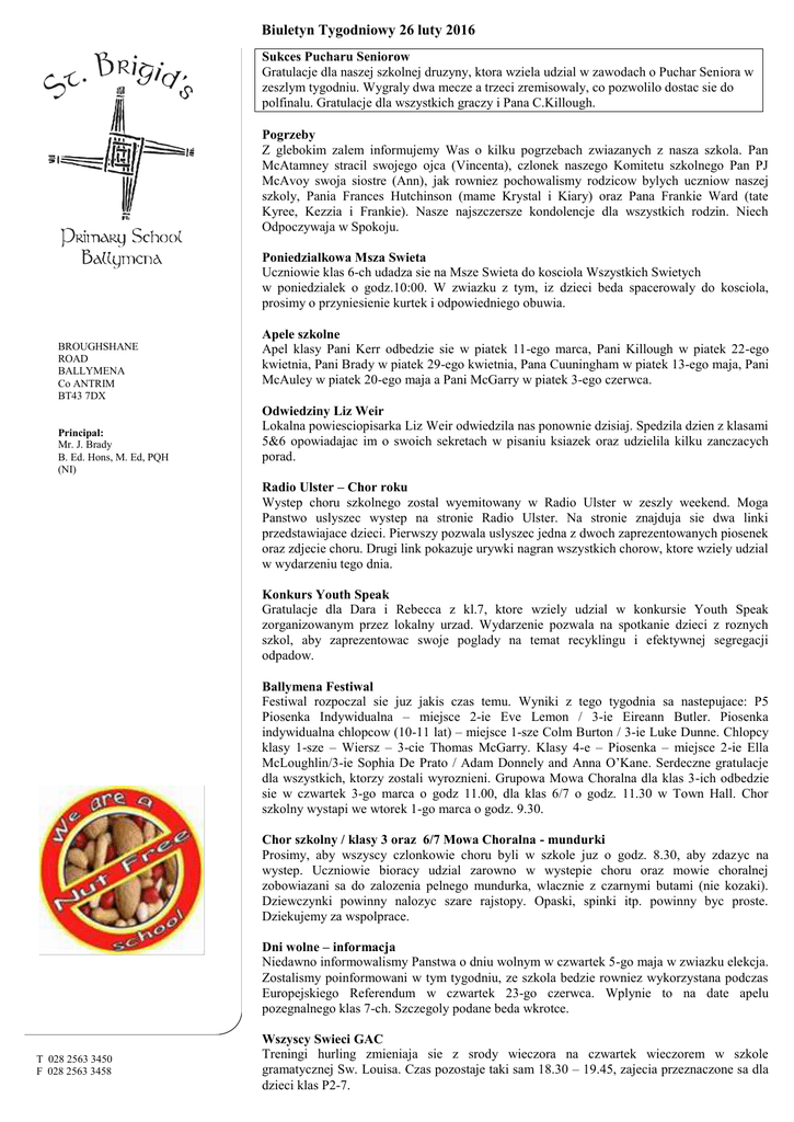 Biuletyn Tygodniowy 26 luty 2016 Sukces Pucharu Seniorow Gratulacje dla naszej szkolnej druzyny, ktora wziela udzial w zawodach o Puchar Seniora w zeszlym tygodniu. Wygraly dwa mecze a trzeci zremisowaly, co pozwolilo dostac sie do polfinalu. Gratulacje dla wszystkich graczy i Pana C.Killough. Pogrzeby Z glebokim zalem informujemy Was o kilku pogrzebach zwiazanych z nasza szkola. Pan McAtamney stracil swojego ojca (Vincenta), czlonek naszego Komitetu szkolnego Pan PJ McAvoy swoja siostre (Ann), jak rowniez pochowalismy rodzicow bylych uczniow naszej szkoly, Pania Frances Hutchinson (mame Krystal i Kiary) oraz Pana Frankie Ward (tate Kyree, Kezzia i Frankie). Nasze najszczersze kondolencje dla wszystkich rodzin. Niech Odpoczywaja w Spokoju. Poniedzialkowa Msza Swieta Uczniowie klas 6-ch udadza sie na Msze Swieta do kosciola Wszystkich Swietych w poniedzialek o godz.10:00. W zwiazku z tym, iz dzieci beda spacerowaly do kosciola, prosimy o przyniesienie kurtek i odpowiedniego obuwia. BROUGHSHANE ROAD BALLYMENA Co ANTRIM BT43 7DX Principal: Mr. J. Brady B. Ed. Hons, M. Ed, PQH (NI) Apele szkolne Apel klasy Pani Kerr odbedzie sie w piatek 11-ego marca, Pani Killough w piatek 22-ego kwietnia, Pani Brady w piatek 29-ego kwietnia, Pana Cuuningham w piatek 13-ego maja, Pani McAuley w piatek 20-ego maja a Pani McGarry w piatek 3-ego czerwca. Odwiedziny Liz Weir Lokalna powiesciopisarka Liz Weir odwiedzila nas ponownie dzisiaj. Spedzila dzien z klasami 5&6 opowiadajac im o swoich sekretach w pisaniu ksiazek oraz udzielila kilku zanczacych porad. Radio Ulster – Chor roku Wystep choru szkolnego zostal wyemitowany w Radio Ulster w zeszly weekend. Moga Panstwo uslyszec wystep na stronie Radio Ulster. Na stronie znajduja sie dwa linki przedstawiajace dzieci. Pierwszy pozwala uslyszec jedna z dwoch zaprezentowanych piosenek oraz zdjecie choru. Drugi link pokazuje urywki nagran wszystkich chorow, ktore wziely udzial w wydarzeniu tego dnia. Konkurs Youth Speak Gratulacje dla Dara i Rebecca z kl.7, ktore wziely udzial w konkursie Youth Speak zorganizowanym przez lokalny urzad. Wydarzenie pozwala na spotkanie dzieci z roznych szkol, aby zaprezentowac swoje poglady na temat recyklingu i efektywnej segregacji odpadow. Ballymena Festiwal Festiwal rozpoczal sie juz jakis czas temu. Wyniki z tego tygodnia sa nastepujace: P5 Piosenka Indywidualna – miejsce 2-ie Eve Lemon / 3-ie Eireann Butler. Piosenka indywidualna chlopcow (10-11 lat) – miejsce 1-sze Colm Burton / 3-ie Luke Dunne. Chlopcy klasy 1-sze – Wiersz – 3-cie Thomas McGarry. Klasy 4-e – Piosenka – miejsce 2-ie Ella McLoughlin/3-ie Sophia De Prato / Adam Donnely and Anna O’Kane. Serdeczne gratulacje dla wszystkich, ktorzy zostali wyroznieni. Grupowa Mowa Choralna dla klas 3-ich odbedzie sie w czwartek 3-go marca o godz 11.00, dla klas 6/7 o godz. 11.30 w Town Hall. Chor szkolny wystapi we wtorek 1-go marca o godz. 9.30. Chor szkolny / klasy 3 oraz 6/7 Mowa Choralna - mundurki Prosimy, aby wszyscy czlonkowie choru byli w szkole juz o godz. 8.30, aby zdazyc na wystep. Uczniowie bioracy udzial zarowno w wystepie choru oraz mowie choralnej zobowiazani sa do zalozenia pelnego mundurka, wlacznie z czarnymi butami (nie kozaki). Dziewczynki powinny nalozyc szare rajstopy. Opaski, spinki itp. powinny byc proste. Dziekujemy za wspolprace. Dni wolne – informacja Niedawno informowalismy Panstwa o dniu wolnym w czwartek 5-go maja w zwiazku elekcja. Zostalismy poinformowani w tym tygodniu, ze szkola bedzie rowniez wykorzystana podczas Europejskiego Referendum w czwartek 23-go czerwca. Wplynie to na date apelu pozegnalnego klas 7-ch. Szczegoly podane beda wkrotce. T 028 2563 3450 F 028 2563 3458 Wszyscy Swieci GAC Treningi hurling zmieniaja sie z srody wieczora na czwartek wieczorem w szkole gramatycznej Sw. Louisa. Czas pozostaje taki sam 18.30 – 19.45, zajecia przeznaczone sa dla dzieci klas P2-7.