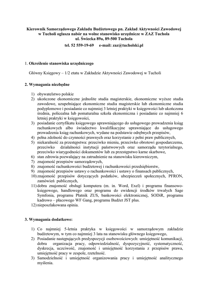 Kierownik Samorządowego Zakładu Budżetowego pn. Zakład Aktywności Zawodowej w Tucholi ogłasza nabór na wolne stanowisko urzędnicze w ZAZ Tuchola ul. Świecka 89a, 89-500 Tuchola tel. 52 559-19-69 e-mail: [email protected] 1. Określenie stanowiska urzędniczego Główny Księgowy – 1/2 etatu w Zakładzie Aktywności Zawodowej w Tucholi 2. Wymagania niezbędne 1) obywatelstwo polskie 2) ukończone ekonomiczne jednolite studia magisterskie, ekonomiczne wyższe studia zawodowe, uzupełniające ekonomiczne studia magisterskie lub ekonomiczne studia podyplomowe i posiadanie co najmniej 3 letniej praktyki w księgowości lub ukończona średnia, policealna lub pomaturalna szkoła ekonomiczna i posiadanie co najmniej 6 letniej praktyki w księgowości, 3) posiadanie certyfikatu księgowego uprawniającego do usługowego prowadzenia ksiąg rachunkowych albo świadectwo kwalifikacyjne uprawniające do usługowego prowadzenia ksiąg rachunkowych, wydane na podstawie odrębnych przepisów, 4) pełna zdolność do czynności prawnych oraz korzystanie z pełni praw publicznych, 5) niekaralność za przestępstwa: przeciwko mieniu, przeciwko obrotowi gospodarczemu, przeciwko działalności instytucji państwowych oraz samorządu terytorialnego, przeciwko wiarygodności dokumentów lub za przestępstwo karne skarbowe, 6) stan zdrowia pozwalający na zatrudnienie na stanowisku kierowniczym, 7) znajomość przepisów samorządowych, 8) znajomość rachunkowości budżetowej i rachunkowości przedsiębiorstw, 9) znajomość przepisów ustawy o rachunkowości i ustawy o finansach publicznych, 10) znajomość przepisów dotyczących podatków, ubezpieczeń społecznych, PFRON, zamówień publicznych, 11) dobra znajomość obsługi komputera (m. in. Word, Exel) i programu finansowoksięgowego, handlowego oraz programu do ewidencji środków trwałych Sage Symfonia, programu Płatnik ZUS, bankowości elektronicznej, SODiR, programu kadrowo – płacowego WF Gang, programu Budżet JST plus. 12) nieposzlakowana opinia. 3. Wymagania dodatkowe: 1) Co najmniej 5-letnia praktyka w księgowości w samorządowym zakładzie budżetowym, w tym co najmniej 3 lata na stanowisku głównego księgowego, 2) Posiadanie następujących predyspozycji osobowościowych: umiejętność komunikacji, dobra organizacja pracy, odpowiedzialność, dyspozycyjność, systematyczność, dyskrecja, uczciwość, znajomość i umiejętność korzystania z przepisów prawa, umiejętność pracy w zespole, rzetelność. 3) Samodzielność i umiejętność organizowania pracy i umiejętność analitycznego myślenia. 4. Zakres wykonywanych zadań na stanowisku: Realizacja obowiązku wynikającego z Ustawy o rachunkowości, Realizacja obowiązku wynikającego z Ustawy o finansach publicznych, Realizacja obowiązku wynikającego z Ustawy o rehabilitacji zawodowej i społecznej, Prowadzenie rachunkowości jednostki i gospodarki finansowej, Wykonywanie dyspozycji środkami pieniężnymi, Dokonywanie wstępnej kontroli zgodności operacji gospodarczych i finansowych z planem finansowym, 7) Nadzorowanie gospodarki magazynowej, 8) Dokonywanie wstępnej kontroli kompletności i rzetelności dokumentów dotyczących operacji gospodarczych i finansowych, 9) Prowadzenie kontroli wewnętrznej, 10) Rozliczanie dotacji udzielanych przez PFRON oraz jednostkę nadrzędną. 1) 2) 3) 4) 5) 6) 5. Wymagane dokumenty: 1) 2) 3) 4) 5) 6) list motywacyjny, życiorys- curriculum vitae z dokładnym opisem przebiegu pracy zawodowej, kserokopie dokumentów potwierdzających staż pracy, kserokopie dyplomów potwierdzających wykształcenie i kwalifikacje zawodowe, kserokopie zaświadczeń o ukończonych kursach, szkoleniach, aktualne zaświadczenie lekarskie potwierdzające brak przeciwwskazań do pracy na stanowisku kierowniczym, 7) oświadczenie o posiadaniu pełnej zdolności do czynności prawnych oraz o korzystaniu z pełni praw publicznych, 8) oświadczenie kandydata o wyrażeniu zgody na przetwarzanie na potrzeby postępowania konkursowego danych osobowych, 9) oświadczenie o braku prawomocnego skazania za przestępstwo umyślne ścigane z oskarżenia publicznego lub umyślne przestępstwo skarbowe, 10) kserokopie dokumentów poświadczające znajomość języka polskiego (dotyczy obywateli Unii Europejskiej oraz obywateli innych państw, którym na podstawie umów międzynarodowych lub przepisów prawa wspólnotowego przysługuje prawo zatrudnienia na terytorium Rzeczpospolitej Polskiej)- zgodnie z art. 11 ust. 2 ustawy o pracownikach samorządowych. 11) inne dodatkowe dokumenty o posiadanych kwalifikacjach i umiejętnościach, opinie, referencje. CV powinno być opatrzone klauzulą: „Wyrażam zgodę na przetwarzanie moich danych osobowych zawartych w ofercie pracy dla potrzeb niezbędnych do realizacji procesu rekrutacji zgodnie z ustawą z dnia 29.08.1997r. o ochronie danych osobowych (t.j. Dz. U. z 2014r. poz.1182 ze zm.) oraz ustawą z dn. 21.11.2008r. o pracownikach samorządowych (t.j. Dz. U. z 2014r. poz. 1202 ze zm.)”. 6. Wskaźnik zatrudnienia osób niepełnosprawnych w jednostce w rozumieniu przepisów o rehabilitacji zawodowej i społecznej oraz osób niepełnosprawnych w miesiącu poprzedzającym datę upublicznienia ogłoszenia jest wyższy niż 6%. 7. Warunki pracy: praca administracyjno – biurowa, praca przy komputerze powyżej 4 godzin dziennie. 8. Metody selekcji kandydatów: rozmowa kwalifikacyjna. 9. Miejsce i termin złożenia dokumentów. Oferty z dokumentami należy przesyłać pocztą na adres: Zakład Aktywności Zawodowej w Tucholi, ul. Świecka 89a, 89-500 Tuchola lub składać osobiście w siedzibie ZAZ, w terminie do 31 marca 2016 r. do godz. 15.00 w zamkniętych kopertach z następującą adnotacją: „Nabór na stanowisko urzędnicze – Główny Księgowy w Zakładzie Aktywności Zawodowej w Tucholi”. Dokumenty, które wpłyną po wyżej określonym terminie nie będą rozpatrywane. Informacja o wyniku naboru będ