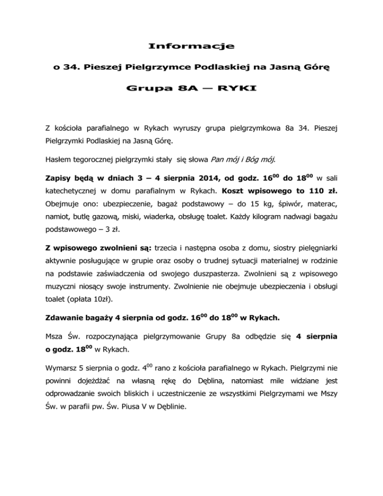Informacje o 34. Pieszej Pielgrzymce Podlaskiej na Jasną Górę Grupa 8A – RYKI Z kościoła parafialnego w Rykach wyruszy grupa pielgrzymkowa 8a 34. Pieszej Pielgrzymki Podlaskiej na Jasną Górę. Hasłem tegorocznej pielgrzymki stały się słowa Pan mój i Bóg mój. Zapisy będą w dniach 3 – 4 sierpnia 2014, od godz. 1600 do 1800 w sali katechetycznej w domu parafialnym w Rykach. Koszt wpisowego to 110 zł. Obejmuje ono: ubezpieczenie, bagaż podstawowy – do 15 kg, śpiwór, materac, namiot, butlę gazową, miski, wiaderka, obsługę toalet. Każdy kilogram nadwagi bagażu podstawowego – 3 zł. Z wpisowego zwolnieni są: trzecia i następna osoba z domu, siostry pielęgniarki aktywnie posługujące w grupie oraz osoby o trudnej sytuacji materialnej w rodzinie na podstawie zaświadczenia od swojego duszpasterza. Zwolnieni są z wpisowego muzyczni niosący swoje instrumenty. Zwolnienie nie obejmuje ubezpieczenia i obsługi toalet (opłata 10zł). Zdawanie bagaży 4 sierpnia od godz. 1600 do 1800 w Rykach. Msza Św. rozpoczynająca pielgrzymowanie Grupy 8a odbędzie się 4 sierpnia o godz. 1800 w Rykach. Wymarsz 5 sierpnia o godz. 400 rano z kościoła parafialnego w Rykach. Pielgrzymi nie powinni dojeżdżać na własną rękę do Dęblina, natomiast mile widziane jest odprowadzanie swoich bliskich i uczestniczenie ze wszystkimi Pielgrzymami we Mszy Św. w parafii pw. Św. Piusa V w Dęblinie.