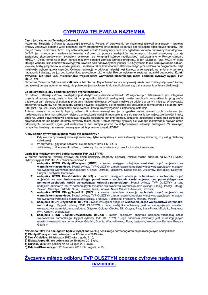 CYFROWA TELEWIZJA NAZIEMNA Czym jest Naziemna Telewizja Cyfrowa? Naziemna Telewizja Cyfrowa to przyszłość telewizji w Polsce. W porównaniu do naziemnej telewizji analogowej – przekaz cyfrowy umożliwia odbiór o wiele bogatszej oferty programowej oraz dostęp do bardzo dobrej jakości odbieranych kanałów - nie ma już mowy o śnieżeniu obrazu czy odbiciach jakie często towarzyszyły nam przy oglądaniu kanałów nadawanych analogowo. DVB-T jest standardem nadawania telewizji cyfrowej za pomocą nadajników naziemnych. Sygnał analogowy zostaje zastąpiony skompresowanym sygnałem cyfrowym, do kompresji którego (audio/wideo) wykorzystano w Polsce standard MPEG-4. Dzięki temu na jednym kanale możemy oglądać zamiast jednego programu, jeden Multiplex (tzw. MUX) w skład którego wchodzi kilka kanałów telewizyjnych, również tych nadawanych w jakości HD. Cyfryzacja to nie tylko gwarancja odbioru większej liczby programów w lepszej jakości, umożliwia także korzystanie z elektronicznego przewodnika po programach i daje możliwość wyboru języka napisów. Cyfrowa rewolucja w odbiorze telewizji jest konieczna ze względu na zmiany w technice nadawania i dlatego, że już pod koniec lipca przyszłego roku w całej Polsce wyłączone zostaną nadajniki analogowe. Dzięki cyfryzacji już teraz 95% mieszkańców województwa warmińsko-mazurskiego może odbierać cyfrowy sygnał TVP OLSZTYN. Naziemna Telewizja Cyfrowa jest całkowicie bezpłatna. Aby odbierać kanały w cyfrowej jakości nie trzeba podpisywać żadnej dodatkowej umowy abonamentowej, nie potrzebne jest podłączenie do sieci kablowej czy zainstalowanie anteny satelitarnej. Co należy zrobić, aby odbierać cyfrowy sygnał naziemny? Do odbioru telewizji cyfrowej niezbędny jest dedykowany dekoder/odbiornik. W najnowszych telewizorach jest integralną częścią składową urządzenia – tak jak w przypadku telewizji analogowej należy uruchomić wyszukiwanie programów a telewizor sam się nastroi znajdując programy naziemnej telewizji cyfrowej możliwe do odbioru w danym miejscu. W przypadku starszych telewizorów nie ma potrzeby zakupu nowego telewizora, ale konieczne jest zakupienie zewnętrznego dekodera, tzw. STB (Set-Top-Box), który podłączamy do telewizora i konfigurujemy zgodnie z załączoną instrukcją. Antena zewnętrzna zapewnia lepszy odbiór niż antena wewnętrzna (w przypadku anten zewnętrznych konieczne jest nakierowanie anteny na najbliższy miejscu zamieszkania nadajnik manipulując nią do uzyskania jak najwyższej jakości i mocy odbioru). Jeżeli dotychczasowa analogowa telewizja odbierana jest przy pomocy aktualnie posiadanej anteny bez zakłóceń to prawdopodobnie nie będzie potrzeby wymiany takich anten. Odbiór telewizji cyfrowej nie wymaga instalowania nowych anten odbiorczych, ponieważ sygnał jest nadawany w tym samym paśmie co dotychczasowa telewizja analogowa. W skrajnych przypadkach należy zastosować antenę specjalnie przeznaczoną do DVB-T. Kiedy odbiór cyfrowego sygnału może być niemożliwy? • Gdy nie mamy własnej instalacji antenowej, tylko korzystamy z sieci kablowej, anteny zbiorczej, czy usług platformy satelitarnej • W przypadku, gdy nasz odbiornik nie ma tunera DVB-T MPEG-4 • Jeśli mamy trudne warunki odbioru, może się okazać konieczna przeróbka instalacji antenowej Gdzie jest możliwy cyfrowy odbiór sygnału TVP OLSZTYN? W ofercie naziemnej telewizji cyfrowej na dzień dzisiejszy programy Telewizji Polskiej można odbierać na MUX1 i MUX3 Cyfrowy sygnał TVP OLSZTYN można odbierać z: 1) nadajnika RTCN Olsztyn/Pieczywo (MUX1) - swoim zasięgiem obejmuje centralną część województwa warmińsko-mazurskiego. Sygnał cyfrowy TVP OLSZTYN z tego nadajnika odbierany jest w następujących miastach województwa warmińsko-mazurskiego: Olsztyn, Ostróda, Miłakowo, Dobre Miasto, Jeziorany, Biskupiec, Szczytno, Pasym, Olsztynek, Barczewo; 2) nadajnika RTCN Iława/Kisielice (MUX3) swoim zasięgiem obejmuje południowo - zachodnią część województwa warmińsko-mazurskiego, południowo – wschodnią część województwa pomorskiego oraz północno-wschodnią część województwa kujawsko-pomorskiego. Sygnał cyfrowy TVP OLSZTYN z tego nadajnika odbierany jest w następujących miastach województwa warmińsko-mazurskiego: Elbląg, Pasłęk, Morąg, Zalewo, Miłomłyn, Ostróda, Susz, Kisielice, Iława, Lubawa, Nowe Miasto Lubawskie, Lidzbark; 3) nadajnika RTCN Elbląg/Jagodnik (MUX1) - swoim zasięgiem obejmuje zachodnią część województwa warmińsko-mazurskiego. Sygnał cyfrowy TVP OLSZTYN z tego nadajnika odbierany jest w następujących miastach województwa warmińsko-mazurskiego: Elbląg, Braniewo, Tolkmicko, Frombork, Młynary, Pasłęk; 4) nadajnika RTCN Giżycko/Miłki (MUX1) - swoim zasięgiem obejmuje wschodnią część województwa warmińskomazurskiego. Sygnał cyfrowy TVP OLSZTYN z tego nadajnika odbierany jest w następujących miastach województwa warmińsko-mazurskiego: Giżycko, Gołdap, Olecko, Ełk, Orzysz, Pisz, Biała-Piska, Mikołajki, Mrągowo, Ryn, Kętrzyn, Węgorzewo; 5) nadajnika RTCN Gdańsk/Chwaszczyno (MUX3) - swoim zasięgiem obejmuje północno-wschodnią część województwa pomorskiego. Sygnał cyfrowy TVP OLSZTYN z tego nadajnika odbierany jest w następujących miastach województwa pomorskiego: Gdańsk, Gdynia, Władysławowo, Puck, Jastarnia, Wejherowo, Kartuzy, Pruszcz Gdański. Naziemna telewizja analogowa będzie wyłączana według poniższego harmonogramu na poszczególnych nadajnikach: 1) Olsztyn/Pieczywo: nie później niż do 17 czerwca 2013 roku, 2) Iława/Kisielice: 28 listopada 2012 roku o godz. 4:15, 3) Elbląg/Jagodnik: nie później niż do 19 marca 2013 roku, 4) Giżycko/Miłki: nie później niż do 23 lipca 2013 roku, 5) Gdańsk/Chwaszczyno: 28 listopada 2012 roku o godz. 4:15. Życzymy miłego odbioru TVP OLSZTYN poprzez cyfrowe nadawanie naziemne.