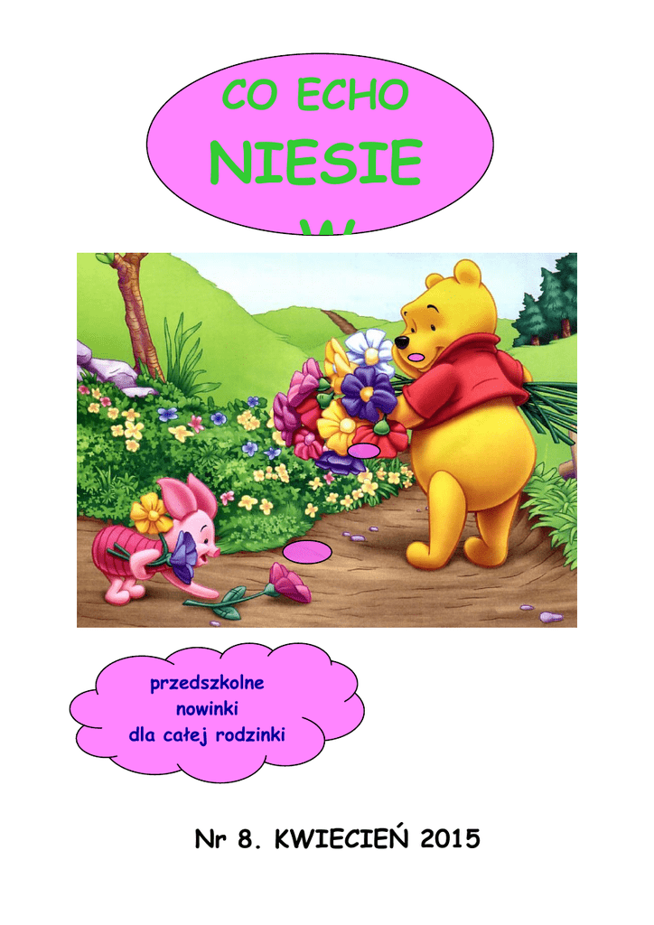 CO ECHO NIESIE W STUMILOW YM LESIE CZYLI przedszkolne nowinki dla całej rodzinki Nr 8. KWIECIEŃ 2015 Drodzy Rodzice Słońce zdaje się wszystkim dodawać sił i energii, wszędzie możemy obserwować budzące się życie. Warto wykorzystać ten czas na budowanie w naszych dzieciach zachwytu nad światem. Pokazywanie drobnych pączków na gałęziach, świeżo kiełkujących roślin – dla wielu dzieci jest ekscytującą przygodą. Może uda się pomóc im w zasadzeniu własnej rośliny, pielęgnowaniu jej i obserwowaniu zmian, które w niej zachodzą?... We wszelkich podejmowanych działaniach niech błogosławi Pan Jezus Zmartwychwstały! Ogłoszenia przedszkolne  9.04 (cz) Wyprawa do Chin. Zajęcia poprowadzi p. Marta Miller, która jest naszą praktykantką, a na co dzień uczy języka chińskiego  10.04 (pt) g.13.30 chłopcy z grupy 5 – latków rozpoczynają trening w ramach KLUBU MAŁEGO PIŁKARZA  13.04 (pn) g.11.00 Koncert Baśniowej Kapeli pt. „Radio Smyk”  15.04 (śr) g.15.00 program przygotowany przez „Przyjaciół Kubusia Puchatka” pt. „Wielkanocne zwyczaje”. Po przedstawieniu nastąpi rozdanie niespodzianek dla dzieci, które w Wielkim Poście razem ze swoimi rodzinami wykonywały BIBLIE RODZINNE  16.04 (cz) g.17.00 zebranie Rady Rodziców  18.04 (sb) WARSZTATY UMIEJĘTNOŚCI WYCHOWAWCZYCH Zgłoszenia do 15.04.2015 należy kierować na adres mailowy: [email protected] lub telefonicznie 606156477 Czas trwania zajęć: 9.00 – 18.00 (przewidywane są przerwy , w tym jedna dłuższa na obiad) Miejsce: Przedszkole Sióstr Nazaretanek im. bł. Franciszki Siedliskiej, W zakresie tematycznym pojawią się m.in.: Zachęcanie dziecka do samodzielności Rozumienie uczuć dziecka Agresja kilkulatka – jak ją obsłużyć? Do czego dziecku potrzebna jest dyscyplina? Pozawalanie na wszystko – do czego prowadzi? Kara – jakie pociąga za sobą skutki? Koszt zajęć: 100 zł osoba/150 zł małżeństwo. Koszt podlega negocjacji (obejmuje: szkolenie, materiały oraz posiłek)  21.04 (wt) g.15.45 EUCHARYSTIA, przed Mszą Św. o g. 15.30 konferencja ks. Łukasza Dyktyńskiego  W kwietniu przedszkolaki nagrają płytę z piosenkami przedszkolnymi, mamy nadzieję, że będzie ona dla nas wszystkich miłą niespodzianką i pamiątką. Przyjaciel Kłapouchego w kwietniu Opowiada o wydarzeniach Niedzieli Zmartwychwstania na podstawie ilustracji. Zna i przestrzega zasady zgodnej zabawy i kulturalnego odnoszenia się do siebie. Zna symbole wielkanocne: krzyż, baranek, chorągiew. Dziękuje Panu Bogu za otaczający nas świat. Rozpoznaje i nazywa drzewa owocowe po kwitnących kwiatach. Opowiada etapy powstawania owoców. Wymienia pożyteczne owady. Dostrzega w przyrodzie piękno wiosennego krajobrazu. Obserwuje uważnie świat przyrody. Przedstawia w formie plastycznej obserwowane zjawiska przyrodnicze. Segreguje elementy zbiorów według wartości jakościowej i ilościowej. WIERSZ W ogródku (frag.) Wyszłam sobie do ogródka. Może spotkam krasnoludka? Może w cieniu pod drzewami siedzi z dziećmi i wnukami? O! Coś rusza się pod krzakiem! Eee… to jakiś ptak z pisklakiem. Ptak z pisklakiem, pisklak z ptakiem, Biegną szybko za robakiem. Przeleciało coś nad płotem! Czy to krasnal samolotem? Nie! To ważka. Strasznie wielka! Przezroczyste ma skrzydełka. Oj! Za drzewem ktoś tak stuka. Pewnie krasnal wnuków szuka. Nie! To dzięcioł dziobem pukał I niechcący mnie oszukał. … Przeszukałam pół ogródka, Nie znalazłam krasnoludka. Ale może, kto to wie, Krasnoludek znajdzie mnie?  PIOSENKA W naszym ogródeczku // zrobimy porządki// 3x wygrabimy ścieżki //przekopiemy grządki// 3x raz dwa trzy. Potem w miękką ziemię // wsiejemy nasionka // 3 x będą się wygrzewać // na wiosennym słonku // 3x raz dwa trzy. Spadnie ciepły deszczyk //i wszystko odmieni// 3 x w naszym ogródeczku //grządki zazieleni// 3 x. Raz dwa trzy. Zadania Przyjaciół Kubusia Puchatka w kwietniu Kształcenie umiejętności uważnego słuchania utworów literackich. Propagowanie postawy proekologicznej – szacunku i ochrony przyrody. Kształtowanie szacunku dla ludzi wykonujących zawód pracownika służb komunalnych. Rozwijanie sprawności grafomotorycznej ręki wiodącej. Rozwijanie umiejętności właściwego reagowania na przegraną, znoszenie porażek. Wdrażanie do właściwego zachowania się przy stole i używania zwrotów proszę, dziękuję. Uświadamianie sensu zdarzeń przyczynowo - skutkowych i umożliwianie przewidywania następstw. Zachęcanie do codziennych spacerów i zabaw na świeżym powietrzu. Doskonalenie percepcji słuchowej – wyróżnianie samogłosek w nagłosie; przelicznie sylab w słowie. Rozwijanie zainteresowania dziełami sztuki, tradycjami i obrzędami ludowymi swojego regionu. Rozwijanie umiejętności związanych z poznawaniem świata zwierząt ze szczególnym uwzględnieniem zwierząt hodowlanych. Kształtowanie umiejętności liczeni i działania na zbiorach. Rozwijanie umiejętności dostrzegania i rozumienia rytmów. Kształtowanie postawy patriotycznej w kontekście tożsamości narodowej. WIERSZ "W kwietniu" Kwiecień drzewa przystroił w barwne kwiaty i zieleń. Po ogrodach, po sadach grają ptasie kapele. Ziemię mokrą od rosy orze traktor zielony - Kra, kra! - echo powtarza z orki cieszą się wrony. Ludzie sadzą ziemniaki, żeby wzeszły niedługo. Bocian chodzi po łące liczy żaby nad strugą. Dzwonią wiadra o studnie. Wozy dotąd turkocą, aż dzień pójdzie na nocleg. Cień uśpi wieś nocą. PIOSENKA Malowany wózek, para siwych koni" Malowany wózek, para siwych koni Pojadę daleko, nikt mnie nie dogoni Pojadę daleko, po ubitej dróżce Tam gdzie stoi mała chatka na koguciej nóżce Stanę przed tą chatką, będę z bicza trzaskał "Wyła? Babo Jago, wyła? jeśli łaska!" Wyszła Baba Jaga, stara, całkiem siwa I spytała grubym głosem: "Kto mnie tutaj wzywa?" "To ja Babo Jago przyjechałem prosić Żebyś nie więziła Ja