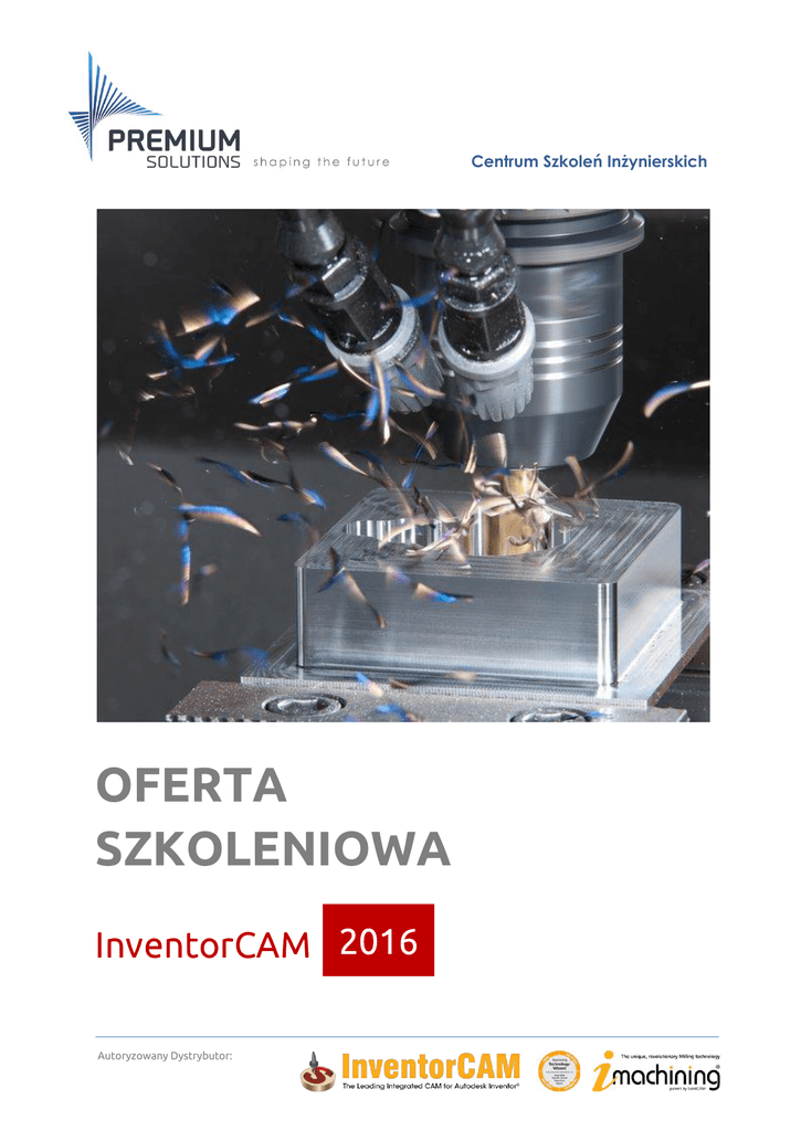 Centrum Szkoleń Inżynierskich OFERTA SZKOLENIOWA InventorCAM 2016 Autoryzowany Dystrybutor: 2016 InventorCAM…………………….. 2014 Spis treści: 1. 2. 3. 4. 5. 6. 7. 8. 9. 10. 11. 12. 13. Centrum Szkoleń Inżynierskich Premium Solutions Polska ................................................ 3 Miejsca szkoleń........................................................................................................................... 4 Lista szkoleń InventorCAM 2016 ............................................................................................. 5 InventorCAM – Frezowanie 2.5-osiowe .............................................................................. 6 InventorCAM – Frezowanie 4/5-osiowe ............................................................................. 7 InventorCAM – Frezowanie 3D HSM.................................................................................... 8 InventorCAM – Frezowanie HSS ........................................................................................... 9 InventorCAM – Toczenie 2-osiowe .................................................................................... 10 InventorCAM – Toczenie z napędzanymi narzędziami.................................................. 11 InventorCAM – iMachining 2.5D/3D .................................................................................. 12 InventorCAM – Sonda Pomiarowa ..................................................................................... 13 Regulamin szkoleń Premium Solutions Polska ................................................................... 14 Karta zgłoszenia na szkolenie ................................................................................................ 15 OFERTA SZKOLENIOWA – InventorCAM 2016 2 / 16 2016 InventorCAM…………………….. 2014 1. Centrum Szkoleń Inżynierskich Premium Solutions Polska Autoryzowany Partner Szkoleniowy InventorCAM Premium Solutions Polska jest Autoryzowanym Partnerem Szkoleniowym firmy SolidCAM – producenta oprogramowania InventorCAM. Każdy z naszych trenerów jest wysokiej klasy specjalistą, mającym bogate doświadczenie w codziennej pracy z oprogramowaniem. Wielostopniowy system szkoleń Uczestnicy szkoleń InventorCAM mają możliwość zdobywania wiedzy na różnych poziomach zaawansowania, rozwijając i uzupełniając umiejętności potrzebne na konkretnym stanowisku pracy. Czas trwania każdego kursu umożliwia przerobienie materiału teoretycznego oraz odpowiednio dużej ilości ćwiczeń praktycznych. Indywidualne podejście Nasi konsultanci udzielają wyczerpujących informacji na temat programu szkoleń oraz oferują swoją pomoc w wyborze odpowiedniego kursu, zgodnie z indywidualnymi potrzebami oraz oczekiwaniami każdego Klienta. Gwarantowana jakość szkoleń Z naszych szkoleń skorzystało już z sukcesem ponad 1 000 Uczestników – specjalistów różnych branż przemysłu: samochodowego, maszynowego, AGD, elektronicznego oraz przetwórstwa tworzyw sztucznych. OFERTA SZKOLENIOWA – InventorCAM 2016 3 / 16 2016 InventorCAM…………………….. 2014 2. Miejsca szkoleń Uczestnikom naszych szkoleń gwarantujemy komfortowe warunki. Zajęcia odbywają się w klimatyzowanych salach wykładowych wyposażonych jednoosobowe stanowiska pracy, niezbędne pomoce dydaktyczne oraz wysokiej jakości sprzęt multimedialny. W każdym dniu szkolenia zapewniamy bufet kawowy oraz obiad. Szkolenia prowadzone są w Centrach Szkoleniowych Premium Solutions Polska w Warszawie, Wrocławiu oraz Obornikach Wlkp. Centrum Szkoleniowe w Warszawie al. Krakowska 271, 02-133 Warszawa GPS: N 52°11'39" / E 20°57'40" 1 sala szkoleniowa na 10 osób wyposażenie: stacje graficzne DELL, manipulatory ruchu 3Dconnexion Centrum Szkoleniowe we Wrocławiu ul. E. Kwiatkowskiego 4, 52-407 Wrocław GPS: N 51°04'21" / E 16°57'17" 3 sale szkoleniowe na 8/15/50 osób wyposażenie: stacje graficzne DELL, manipulatory ruchu 3Dconnexion pracownia posiada obrabiarkę 5-osiową FANUC Robodrill Alpha D21SiA5 3-axis oraz frezarkę 3-osiową KOVOSVIT MAS MCV 754 QUICK Centrum Szkoleniowe w Obornikach Wlkp. k/Poznania ul. Piłsudskiego 62, 64-600 Oborniki Wlkp. GPS: N 52°39'05" / E 16°48'59" 1 sala szkoleniowa na 6 osób wyposażenie: stacje graficzne DELL, manipulatory ruchu 3Dconnexion Prowadzimy również szkolenia i konsultacje u Klientów na sprzęcie Premium Solutions Polska. OFERTA SZKOLENIOWA – InventorCAM 2016 4 / 16 2016 InventorCAM…………………….. 2014 3. Lista szkoleń InventorCAM 2016 Kod szkolenia Nazwa szkolenia Czas szkolenia CAM CAM.11 InventorCAM – Frezowanie 2.5-osiowe 2 dni CAM.12 InventorCAM – Frezowanie 4/5-osiowe 2 dni CAM.13 InventorCAM – Frezowanie 3D HSM 2 dni CAM.14 InventorCAM – Frezowanie HSS 1 dzień CAM.15 InventorCAM – Toczenie 2-osiowe 1 dzień CAM.16 InventorCAM – Toczenie z napędzanymi narzędziami 1 dzień CAM.17 InventorCAM – iMachining 2.5D/3D 1 dzień CAM.18 InventorCAM – Sonda Pomiarowa 1 dzień OFERTA SZKOLENIOWA – InventorCAM 2016 5 / 16 2016 InventorCAM…………………….. 2014 4. InventorCAM – Frezowanie 2.5-osiowe Kod szkolenia: CAM.11 Cel szkolenia: Zdobycie wiedzy o module 2.5 osiowym wbudowanym w InventorCAM, umożliwiający wykonywanie obróbek frezarskich typu: planowanie, kieszeń, profil, zagłębianie, oraz operacji wiertarskich. Obróbki można definiować bazując na szkicach 2D lub bezpośrednio na modelach 3D. Program: Definiowanie części CAM o Definiowanie Bazy o Definiowanie Przygotówki o Definiowanie Modelu Docelowego Operacja Planowanie Operacja Profil Operacja Wiercenie Operacja Wybranie/Kieszeń Operacja Wykrywanie Kieszeni Operacja Wykrywanie Otworów Zmiana bazy (mocowania) Operacja Zagłębienie-T Cykle Toolbox-a Opcjonalnie: Wykorzystanie 4 i 5 osi indeksowanej Wymagania wstępne: znajomość oprogramowania Inventor w zakresie podstawowym znajomość systemu operacyjnego Windows 