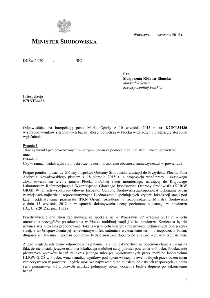 Warszawa, września 2015 r. MINISTER ŚRODOWISKA DOŚwiś-070- / /RC Pani Małgorzata Kidawa-Błońska Marszałek Sejmu Rzeczypospolitej Polskiej Interpelacja K7INT34436 Odpowiadając na interpelację posła Marka Opioły z 10 września 2015 r. nr K7INT34436 w sprawie wyników sierpniowych badań jakości powietrza w Płocku w załączeniu przekazuję stosowne wyjaśnienia. Pytanie 1. Jakie są wyniki przeprowadzonych w sierpniu badań za pomocą mobilnej stacji jakości powietrza? oraz Pytanie 2. Czy w ramach badań wykryto przekroczenie norm w zakresie obecności zanieczyszczeń w powietrzu? Pragnę poinformować, że Główny Inspektor Ochrony Środowiska wystąpił do Prezydenta Płocka, Pana Andrzeja Nowakowskiego pismem z 18 sierpnia 2015 r. z propozycją współpracy i czasowego zlokalizowania na terenie miasta Płocka mobilnej stacji monitoringu, należącej do Krajowego Laboratorium Referencyjnego i Wzorcującego Głównego Inspektoratu Ochrony Środowiska (KLRiW GIOŚ). W ramach współpracy Główny Inspektor Ochrony Środowiska zaproponował wykonanie badań w miejscach najbardziej reprezentatywnych i jednocześnie spełniających kryteria lokalizacji stacji pod kątem oddziaływania przemysłu (PKN Orlen), określone w rozporządzeniu Ministra Środowiska z dnia 13 września 2012 r. w sprawie dokonywania oceny poziomów substancji w powietrzu (Dz. U. z 2012 r., poz. 1032). Przedstawiciele obu stron zaplanowali, że spotkają się w Warszawie 29 września 2015 r. w celu omówienia szczegółów posadowienia w Płocku mobilnej stacji jakości powietrza. Konieczna będzie również wizja lokalna proponowanej lokalizacji w celu ustalenia możliwości technicznych podłączenia stacji, a także sprawdzenia jej reprezentatywności, natomiast wyznaczenie terminu rozpoczęcia badań, długości ich trwania i zakresu pomiarów będzie możliwe dopiero po analizie wyników tych ustaleń. Z tego względu udzielenie odpowiedzi na pytania 1 i 2 nie jest możliwe na obecnym etapie z uwagi na fakt, że nie została jeszcze ustalona lokalizacja mobilnej stacji jakości powietrza w Płocku. Przekazanie pierwszych wyników badań za okres jednego miesiąca wykonywanych przez mobilne laboratorium KLRiW GIOŚ w Płocku, wraz z analizą wyników pod kątem wskazania ewentualnych przekroczeń norm zanieczyszczeń w powietrzu, będzie możliwe najwcześniej po miesiącu od daty ich rozpoczęcia, a pełna seria pomiarowa, która pozwoli uzyskać pełniejszy obraz, dostępna będzie dopiero po zakończeniu badań. 1 Pytanie 3. Jakie były główne źródła zanieczyszczenia powietrza zidentyfikowane podczas sierpniowych badań? Monitoring jakości powietrza w województwie mazowieckim prowadzi Mazowiecki Wojewódzki Inspektor Ochrony Środowiska w ramach realizacji ustawowych obowiązków. Oceny dokonywane są w oparciu o system pomiarów oraz matematyczne modelowanie. Obliczenia wykonywane są programem opracowanym przez Amerykańską Agencję Ochrony Środowiska (US EPA), zalecanym i stosowanym w praktyce na obszarze USA. Monitoring powietrza obejmuje następujące substancje: 1. pył zawieszony PM10 - pył o wielkości cząstek poniżej 10 µg/m3, 2. pył zawieszony PM2,5 – pył o wielkości cząstek poniżej 2,5µg/m3, 3. dwutlenek siarki, 4. dwutlenek azotu, 5. tlenki azotu, 6. tlenek węgla, 7. benzen, 8. benzo(a)piren, 9. ozon. Państwowy Monitoring Powietrza (PMŚ) nie obejmuje wszystkich substancji emitowanych przez PKN ORLEN S.A., w tym uciążliwych dla mieszkańców Płocka substancji odorotwórczych. W aktualnie obowiązujących przepisach prawa z zakresu ochrony środowiska brak jest regulacji prawnych określających dopuszczalne poziomy substancji zapachowych w powietrzu i metody oceny zapachowej jakości powietrza. Zgodnie z art. 222 ust. 5 ustawy z dnia 27 kwietnia 2001r. - Prawo ochrony środowiska (Dz. U. z 2013r. poz. 1232, z późn. zm.) minister właściwy do spraw środowiska, w porozumieniu z ministrem zdrowia, może określić, w drodze rozporządzenia, wartości odniesienia substancji zapachowych w powietrzu i metody oceny zapachowej jakości powietrza. Wyżej wymienione rozporządzenie dotychczas nie zostało wydane. W związku z tym, wobec braku w przepisach prawa ochrony środowiska zarówno standardów jakości zapachowej w powietrzu, jak i metod ich oceny, Inspekcja Ochrony Środowiska nie ma podstaw prawnych do przeprowadzenia kontroli w zakresie określenia uciążliwości zapachowej. Dopuszczalne wartości wszystkich emitowanych substancji określone są dla PKN ORLEN S.A. w pozwoleniu zintegrowanym, którego warunki są kontrolowane przez WIOŚ w Warszawie podczas kontroli w terenie. W systemie monitoringu jakości powietrza funkcjonują w Płocku dwie stacje pomiarowe: przy ulicy Reja i na terenie gimnazjum im. Królowej Jadwigi. W sierpniu 2015 r. poziomy większości monitorowanych substancji na stacjach pomiarowych w Płocku utrzymywały się na niskim poziomie. Wyjątek stanowią jednogodzinne stężenia dwutlenku siarki i benzenu, dla których notowano incydentalne, podwyższone poziomy stężeń. W dniu 6 sierpnia br. w ciągu 1 godziny stężenia SO2 sięgnęły poziomu 131,1µg/m3 (norma dopuszcza przekroczenie poziomu jednogodzinnego stężenia 350 µg/m3 24 razy w ciągu roku) i benzenu 10,63 µg/m3 (w polskim prawie istnieje dla benzenu tylko norma dla stężeń średniorocznych 5 µg/m3). W długoletniej historii pomiarów średnioroczna norma dla benzenu w Płocku nie została przekroczona. PKN ORLEN S.A. od dnia 6 września do 5 października br. przeprowadza planowany postój technologiczny instalacji Hydroodsiarczania Gudronu. Okresowe podwyższone stężenia SO2 i benzenu oraz odczuwana przez mieszkańców Płocka uciążliwość zapachowa są związane z konieczną i planowaną operacją technologiczną. Normy jakości powietrza substancji mierzonych w ramach monitoringu powietrza w sierpniu br. w Płocku nie zostały przekroczone. 2 140 120 1