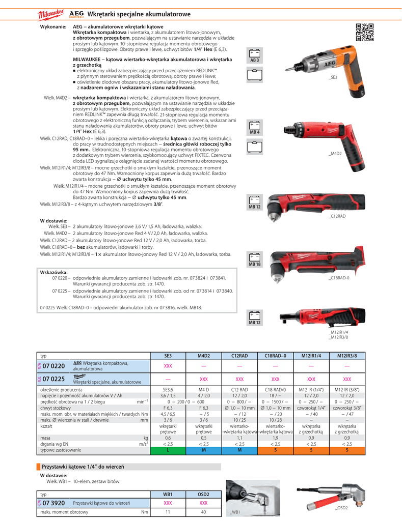 Wkrętarki specjalne akumulatorowe Wykonanie: AEG − akumulatorowe wkrętarki kątowe Wkrętarka kompaktowa i wiertarka, z akumulatorem litowo-jonowym, z obrotowym przegubem, pozwalającym na ustawianie narzędzia w układzie prostym lub kątowym. 10-stopniowa regulacja momentu obrotowego i sprzęgło poślizgowe. Obroty prawe i lewe, uchwyt bitów 1/4″ Hex (E 6,3). MILWAUKEE − kątowa wiertarko-wkrętarka akumulatorowa i wkrętarka z grzechotką elektroniczny układ zabezpieczający przed przeciążeniem REDLINK™ z płynnym sterowaniem prędkością obrotową, obroty prawe i lewe; oświetlenie diodowe obszaru pracy, akumulatory litowo-jonowe Red, z nadzorem ogniw i wskazaniami stanu naładowania. AB 3 _SE3 Wielk. M4D2 – wkrętarka kompaktowa i wiertarka, z akumulatorem litowo-jonowym, z obrotowym przegubem, pozwalającym na ustawianie narzędzia w układzie prostym lub kątowym. Elektroniczny układ zabezpieczający przed przeciążaniem REDLINK™ zapewnia długą trwałość. 21-stopniowa regulacja momentu obrotowego z elektroniczną funkcją odłączania, trybem wiercenia, wskazaniami stanu naładowania akumulatorów, obroty prawe i lewe, uchwyt bitów 1/4″ Hex (E 6,3). Wielk. C12RAD; C18RAD–0 – lekka i poręczna wiertarko-wkrętarka kątowa o zwartej konstrukcji, do pracy w trudnodostępnych miejscach − średnica główki roboczej tylko 95 mm. Elektroniczna, 10-stopniowa regulacja momentu obrotowego z dodatkowym trybem wiercenia, szybkomocujący uchwyt FIXTEC. Czerwona dioda LED sygnalizuje osiągnięcie zadanej wartości momentu obrotowego. Wielk. M12IR1/4; M12IR3/8 – mocne grzechotki o smukłym kształcie, przenoszące moment obrotowy do 47 Nm. Wzmocniony korpus zapewnia dużą trwałość. Bardzo zwarta konstrukcja − ⌀ uchwytu tylko 45 mm. Wielk. M12IR1/4 – mocne grzechotki o smukłym kształcie, przenoszące moment obrotowy do 47 Nm. Wzmocniony korpus zapewnia dużą trwałość. Bardzo zwarta konstrukcja − ⌀ uchwytu tylko 45 mm. Wielk. M12IR3/8 – z 4-kątnym uchwytem narzędziowym 3/8″. MB 4 _M4D2 MB 12 _C12RAD W dostawie: Wielk. SE3 – 2 akumulatory litowo-jonowe 3,6 V / 1,5 Ah, ładowarka, walizka. Wielk. M4D2 – 2 akumulatory litowo-jonowe Red 4 V / 2,0 Ah, ładowarka, walizka. Wielk. C12RAD – 2 akumulatory litowo-jonowe Red 12 V / 2,0 Ah, ładowarka, torba. Wielk. C18RAD–0 – bez akumulatorów, ładowarki i torby. Wielk. M12IR1/4; M12IR3/8 – 1× akumulator litowo-jonowy Red 12 V / 2,0 Ah, ładowarka, torba. MB 18 Wskazówka: 07 0220 – odpowiednie akumulatory zamienne i ładowarki zob. nr. 073824 i 073841. Warunki gwarancji producenta zob. str. 1470. 07 0225 – odpowiednie akumulatory zamienne i ładowarki zob. od nr. 073814 i 073840. Warunki gwarancji producenta zob. str. 1470. _C18RAD-0 07 0225 Wielk. C18RAD–0 – odpowiedni akumulator zob. nr 073816, wielk. MB18. MB 12 SE3 M4D2 C12RAD C18RAD–0 M12IR1/4 M12IR3/8 07A 07 0220 Wkrętarka kompaktowa, akumulatorowa XXX — — — — — 03L _M12IR1/4 _M12IR3/8 07 0225 Wkrętarki specjalne, akumulatorowe — XXX XXX XXX XXX XXX typ określenie producenta napięcie i pojemność akumulatorów V / Ah min−1 prędkość obrotowa na 1 / 2 biegu chwyt stożkowy maks. mom. obr. w materiałach miękkich / twardych Nm mm maks. ⌀ wiercenia w stali / drewnie kształt masa drgania wg EN typowe zastosowanie kg m/s2 SE3,6 M4 D 3,6 / 1,5 4 / 2,0 0 − 200 / 0 − 600 F 6,3 F 6,3 4,5 / 6,5 − /5 3/6 3/6 wkrętarki wkrętarki prętowe prętowe 0,6 0,5 < 2,5 < 2,5 L M C12 RAD C18 RAD/0 M12 IR (1/4″) 12 / 2,0 18 / − 12 / 2,0 0 − 800 / − 0 − 1500 / − 0 − 250 / − ⌀ 1,0 − 10 mm ⌀ 1,0 − 10 mm czworokąt 1/4″ − / 12 − / 20 − / 40 10 / 25 10 / 28 − wiertarkowiertarkowkrętarka -wkrętarka kątowa -wkrętarka kątowa z grzechotką 1,1 1,9 0,9 < 2,5 < 2,5 < 2,5 M S S M12 IR (3/8″) 12 / 2,0 0 − 250 / − czworokąt 3/8″ − / 47 − wkrętarka z grzechotką 0,9 < 2,5 S Przystawki kątowe 1/4″ do wierceń W dostawie: Wielk. WB1 – 10-elem. zestaw bitów. 07A typ 07 3920 Przystawki kątowe do wierceń maks. moment obrotowy Nm WB1 OSD2 XXX XXX 11 40 _OSD2 _WB1