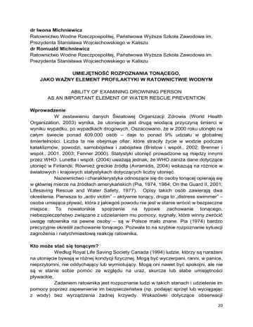 dr Iwona Michniewicz Ratownictwo Wodne Rzeczpospolitej, Państwowa Wyższa Szkoła Zawodowa im. Prezydenta Stanisława Wojciechowskiego w Kaliszu dr Romuald Michniewicz Ratownictwo Wodne Rzeczpospolitej, Państwowa Wyższa Szkoła Zawodowa im. Prezydenta Stanisława Wojciechowskiego w Kaliszu UMIEJĘTNOŚĆ ROZPOZNANIA TONĄCEGO, JAKO WAŻNY ELEMENT PROFILAKTYKI W RATOWNICTWIE WODNYM ABILITY OF EXAMINING DROWNING PERSON AS AN IMPORTANT ELEMENT OF WATER RESCUE PREVENTION Wprowadzenie W zestawieniu danych Światowej Organizacji Zdrowia (World Health Organization, 2003) wynika, że utonięcie jest drugą wiodącą przyczyną śmierci w wyniku wypadku, po wypadkach drogowych. Oszacowano, że w 2000 roku utonęło na całym świecie ponad 409.000 osób – daje to ponad 9% udziału w globalnej śmiertelności. Liczba ta nie obejmuje ofiar, które straciły życie w wodzie podczas kataklizmów, powodzi, samobójstwa i zabójstwa (Bristow i współ., 2002; Brenner i współ., 2001, 2003; Fenner 2000). Statystyki utonięć prowadzone są między innymi przez WHO. Lunetta i współ. (2004) uważają jednak, że WHO zaniża dane dotyczące utonięć w Finlandii. Również greckie źródła (Avramidis, 2004) wskazują na różnice w światowych i krajowych statystykach dotyczących liczby utonięć. Nazewnictwo i charakterystyka odnoszące się do osoby tonącej opierają się w głównej mierze na źródłach amerykańskich (Pia, 1974, 1984; On the Guard II, 2001; Lifesaving Rescue and Water Safety, 1977). Opisy takich osób zawierają dwa określenia. Pierwsza to „activ victim” – aktywnie tonący, druga to „distress swimmer” – osoba umiejąca pływać, która z jakiegoś powodu nie jest w stanie wrócić w bezpieczne miejsce. To nowatorskie spojrzenie na typowe zachowanie tonącego, niebezpieczeństwo związane z udzielaniem mu pomocy, sygnały, które winny zwrócić uwagę ratownika na pewne osoby – są w Polsce mało znane. Pia (1974) bardzo precyzyjnie określił zachowanie tonącego. Pozwala to na szybkie rozpoznanie sytuacji zagrożenia i natychmiastową reakcję ratownika. Kto może stać się tonącym? Według Royal Life Saving Society Canada (1994) ludzie, którzy są narażeni na utonięcie bywają w różnej kondycji fizycznej. Mogą być wyczerpani, ranni, w panice, nieprzytomni, nie oddychający lub wymiotujący. Mogą oni nawet być spokojni, ale nie są w stanie sobie pomóc ze względu na uraz, skurcze lub słabe umiejętności pływackie. Zadaniem ratownika jest rozpoznanie ludzi w takich stanach i udzielenie im pomocy poprzez zapewnienie im bezpieczeństwa (np. podając sprzęt lub wyciągając z wody) bez wyrządzenia żadnej krzywdy. Wskazówki dotyczące obserwacji 20 (umiejętności pływackich osób kąpiących się itp.) zawierają np. artykuły Richardsona (1997) czy Pia (1999). Znaleźć wśród nich można wszystkie te cechy, które pozwalają na zakwalifikowanie uczestnika kąpieli jako potencjalnej ofiary tonięcia w następujących kategoriach: 1. Ludzie w ekstremalnym wieku – bardzo młodzi (Warda, 2006; Quan, Cummings, 2003; Brenner, Oostmann 2002; Weir, 2000) i bardzo starzy (statystyki DLRG, 2006 www.dlrg.de). 2. Ludzie o ekstremalnej masie ciała – bardzo ciężcy i bardzo szczupli. 3. Bladzi ludzie – ich bladość może sygnalizować brak przebywania bądź doświadczenia na basenach otwartych. 4. Rodzice trzymający dzieci – ich umiejętności mogą nie być wystarczające, aby ochronić siebie i dziecko. 5. Niestabilne bądź odurzone jednostki – ich sposoby ruchu i zachowania się mogą być osłabione (Asher i współ., 1995; Cummings, Quan, 1999, Fenner, 2000). 6. Ludzie używający różnych „pływaków” – używanie takiej „pomocy” może sygnalizować brak komfortu w wodzie. 7. Fizyczne osłabienie – może sygnalizować ograniczoną zdolność do manewrowania w wodzie i wokół wody. 8. Niewłaściwy ubiór lub sprzęt – może oznaczać, że nie są oni zaznajomieni z sytuacjami możliwymi na wodach. Według Richardsona (1997) powyższe kategorie pomogą zidentyfikować tych, którzy mogą mieć kłopoty, ale nie oznacza to, że koniecznie będą je mieli. Gdy tylko wejdą do wody, ich zachowanie może albo potwierdzić albo zanegować podejrzenia ratownika. Spośród uczestników kąpieli można wyodrębnić różne grupy, które winny pozostawać pod baczniejszą obserwacją ratownika. Ich umiejętności pływackie, zachowanie i inne cechy (np. wiek, płeć czy rasa) stanowią dla ratownika ważne źródło informacji. Zwraca na to uwagę wielu autorów (Richardson, 1997; Saluja i współ., 2006; Baker i współ., 1998; Gilchrist i współ., 2000; Sibert i współ., 2002; Brenner i współ., 2003; źródła internetowe organizacji ratunkowych). Howland i współ. (1996), Ellis, Trent (1997) czy statystyki WHO wskazują, że współczynnik utonięć jest dwukrotnie wyższy u mężczyzn niż u kobiet. Poszukiwano przyczyn tych dysproporcji i dowiedziono, że młodzi mężczyźni są znacznie bardziej podatni na podejmowanie ryzyka w środowisku wodnym niż kobiety. Jednak Pia (1999) w podsumowaniu swojego artykułu uznaje za niecelowe zajmowanie się oceną grup ryzyka, a zaleca ratownikowi przede wszystkim skoncentrowanie się na obserwacji tego, co dzieje się na strzeżonym przez niego kąpielisku. 21 Zachowanie tonącego w wodzie Uzasadnionym wydaje się poświęcenie całej uwagi osobom już przebywającym w wodzie. Pływający, którzy prawdopodobnie staną się tonącymi, okazują różnorodność znaków ostrzegawczych. Są to: 1. Osłabione ruchy – głowa nisko w wodzie, niewielkie ożywienie lub nieskoordynowane ruchy nóg mogą świadczyć o ograniczeniach w pokonywaniu trudności w wodzie. 2. Włosy w oczach – pływak może być zbyt zaniepokojony i zajęty utrzymywaniem głowy nad wodą, aby odsunąć włosy z oczu. 3. Szkliste, bez wyrazu, zaniepokojone oczy – wyraz twarzy poprzedzający wyczerpani