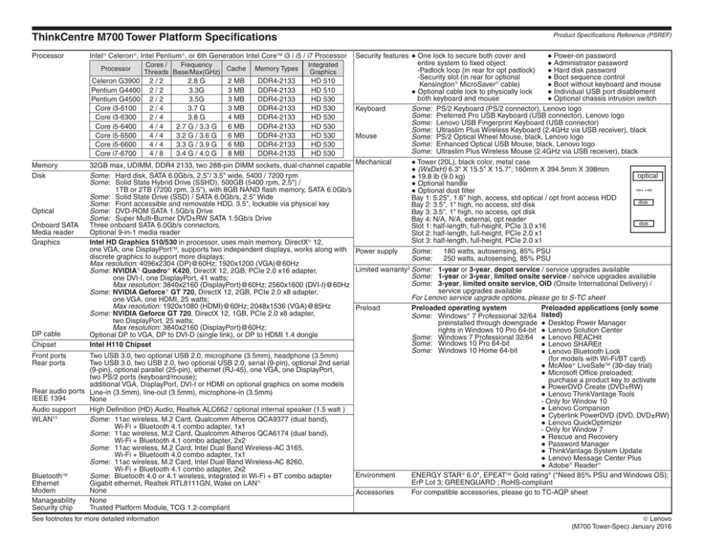 ThinkCentre M700 Tower Platform Specifications - PSRef`s